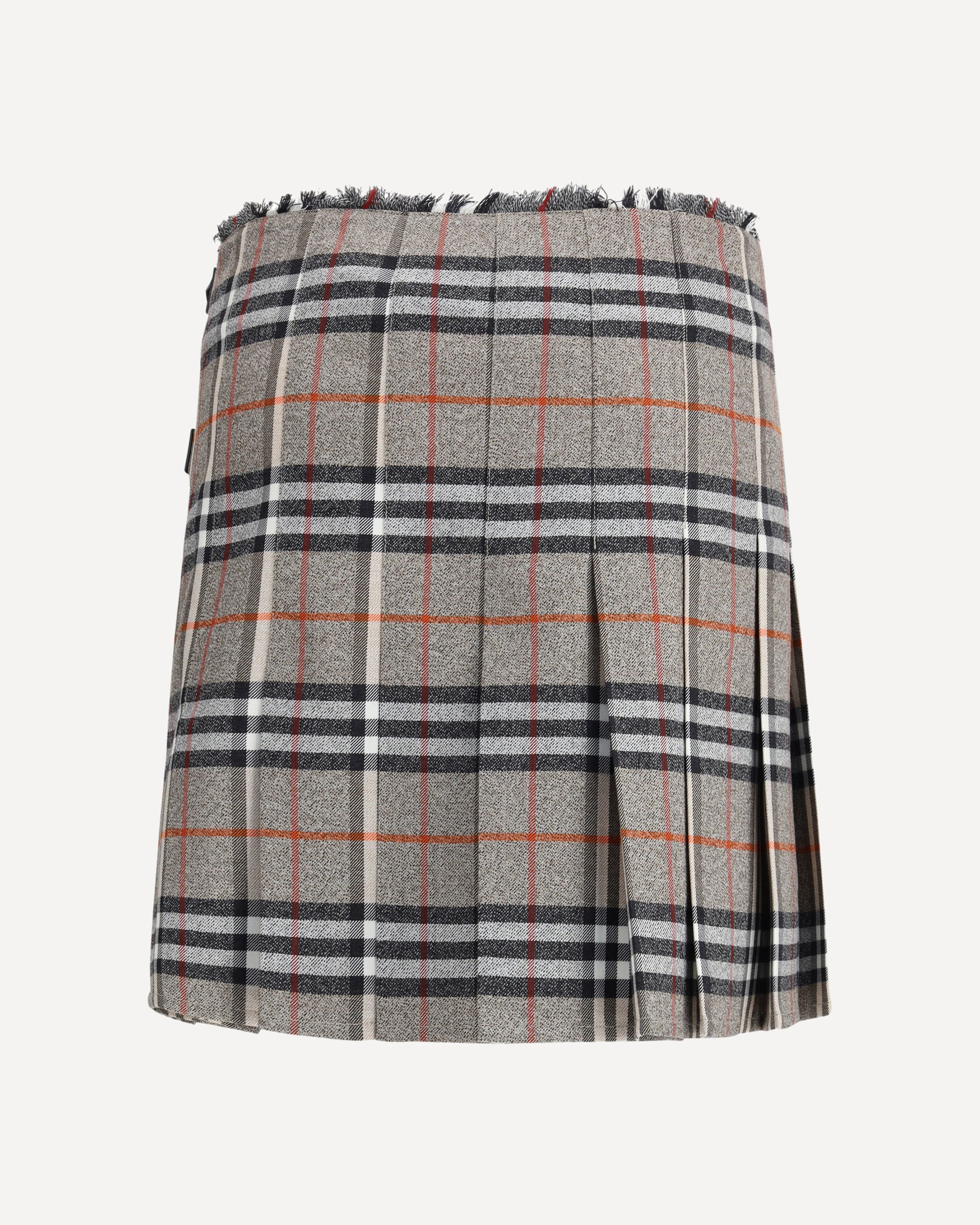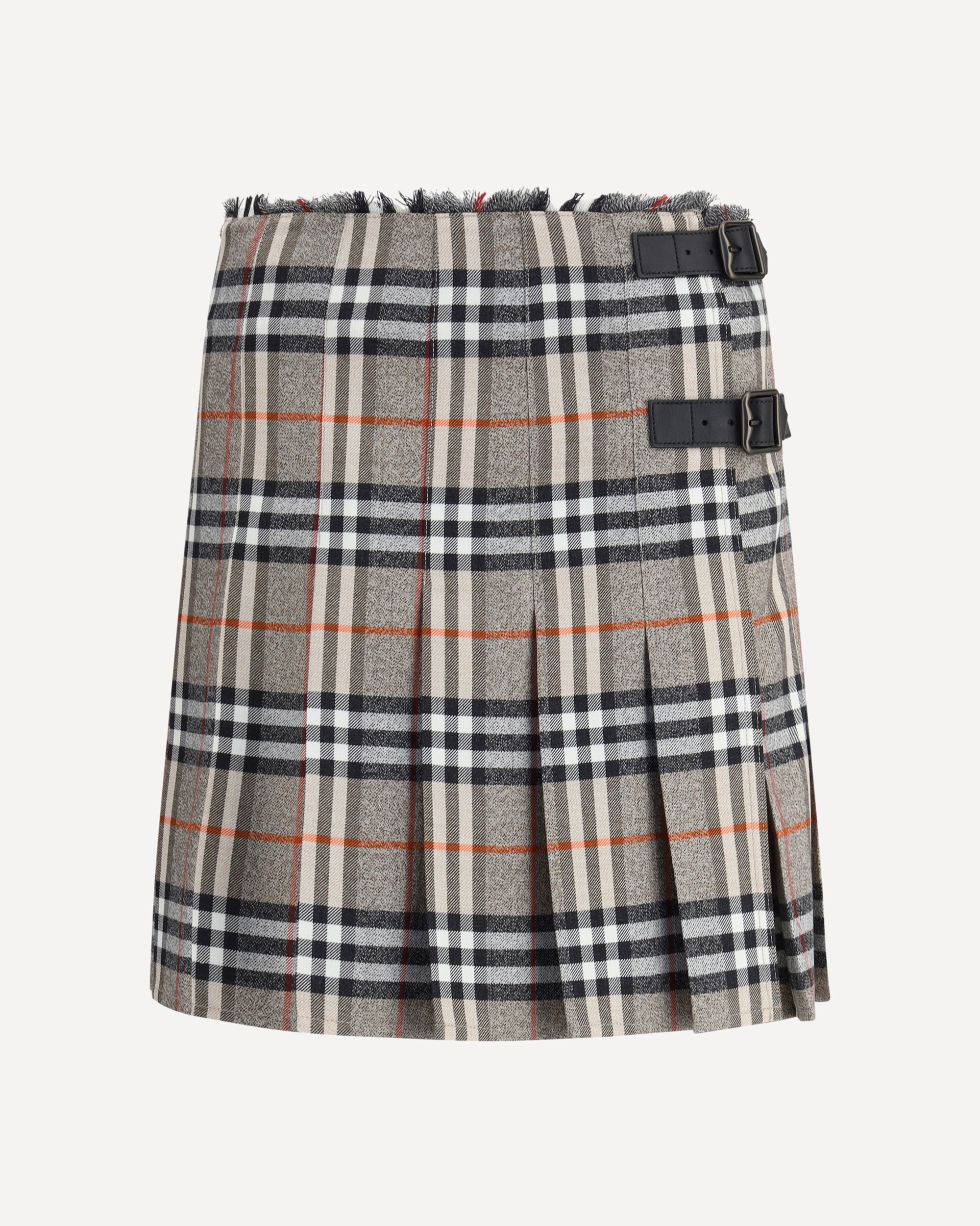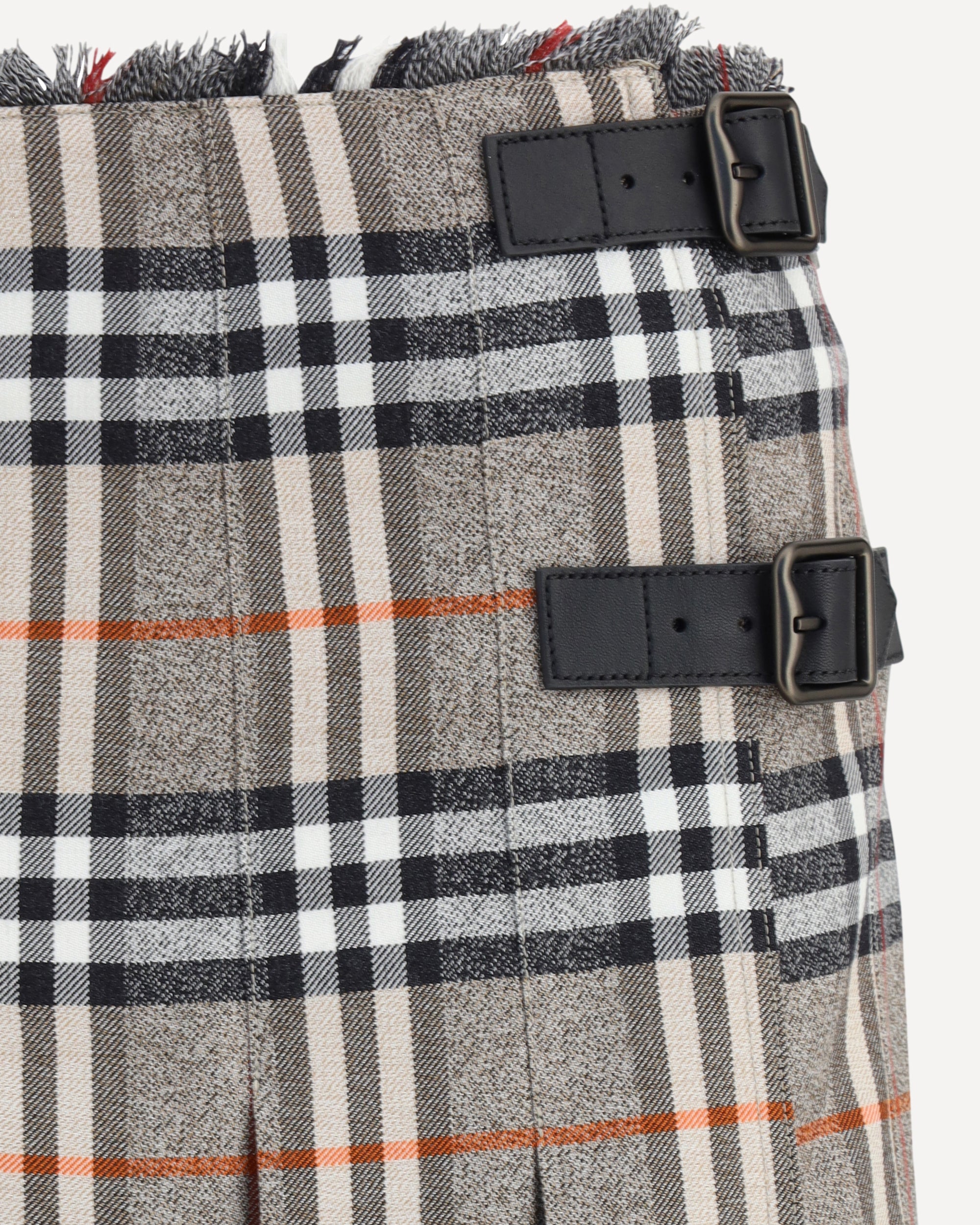 Burberry's Check Archive Wool Miniskirt features a flared silhouette with pleats that give it movement and femininity. The waist is finished with short, thin bangs, while leather straps with a B-shaped buckle allow for tailored adjustment. The side closure is embellished with buttons and a buckle engraved with Burberry lettering, a refined detail that celebrates the brand's distinctive elegance.