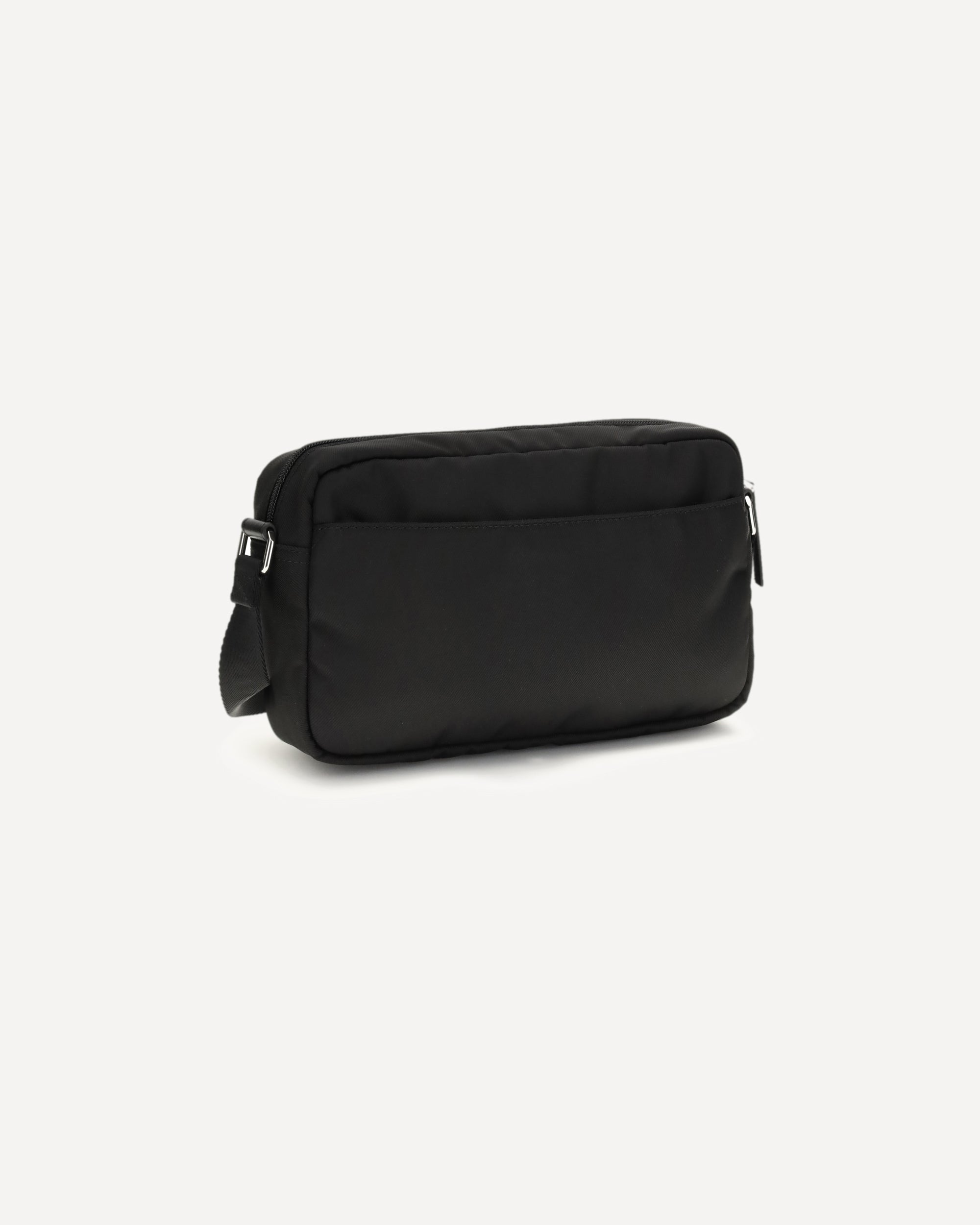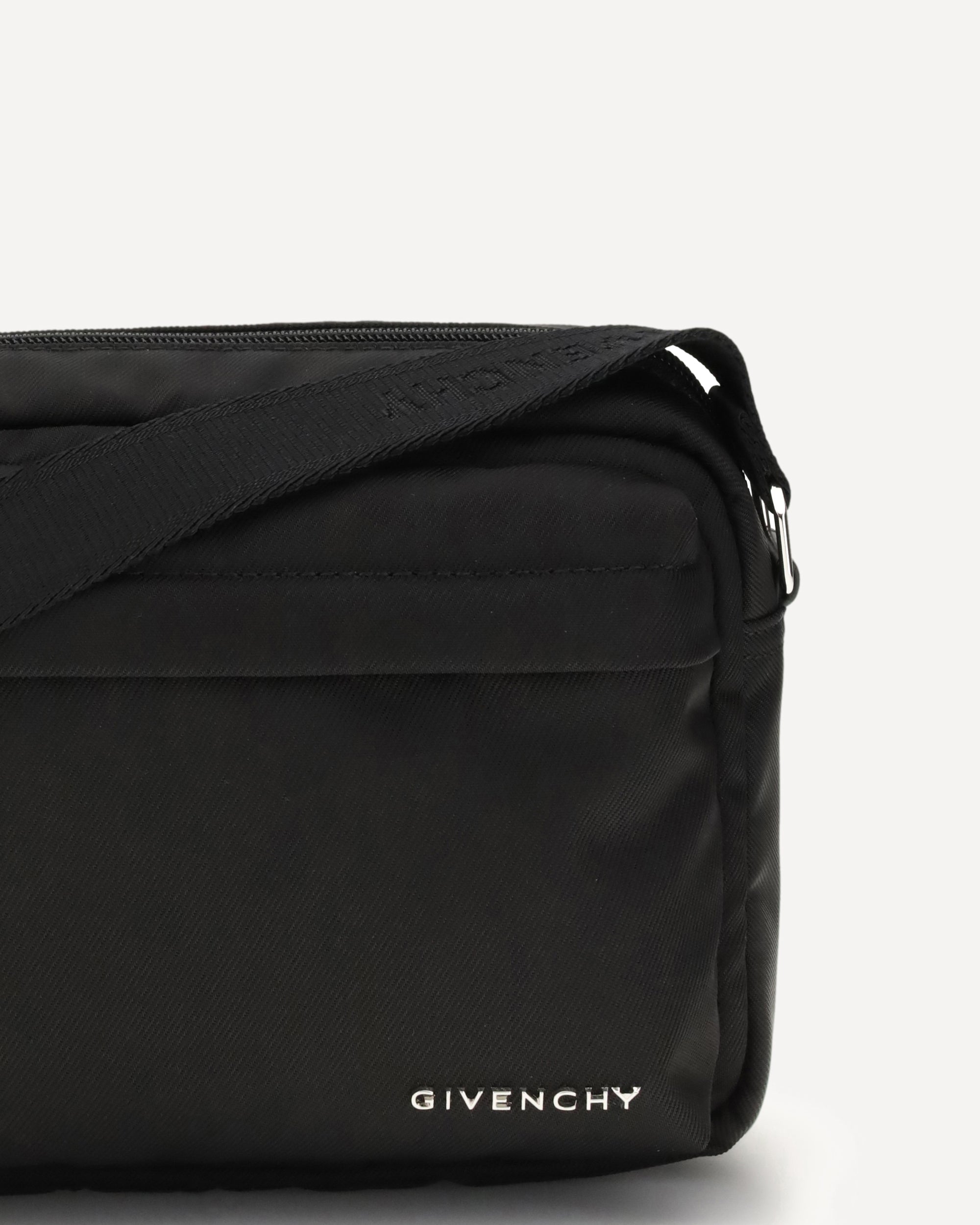 The Essential U Bag by Givenchy is crafted from durable nylon and enriched with the Maison’s signature detailing. The design features a zip closure with a leather puller and an adjustable GIVENCHY-logo webbing strap for comfortable crossbody wear. A metal GIVENCHY signature adorns the front, while the interior includes a GIVENCHY Paris label. The bag offers a well-organized structure with a main zip compartment, two front zip pockets, and an additional zip pocket on the back. All metal details come in a refined silver finish.