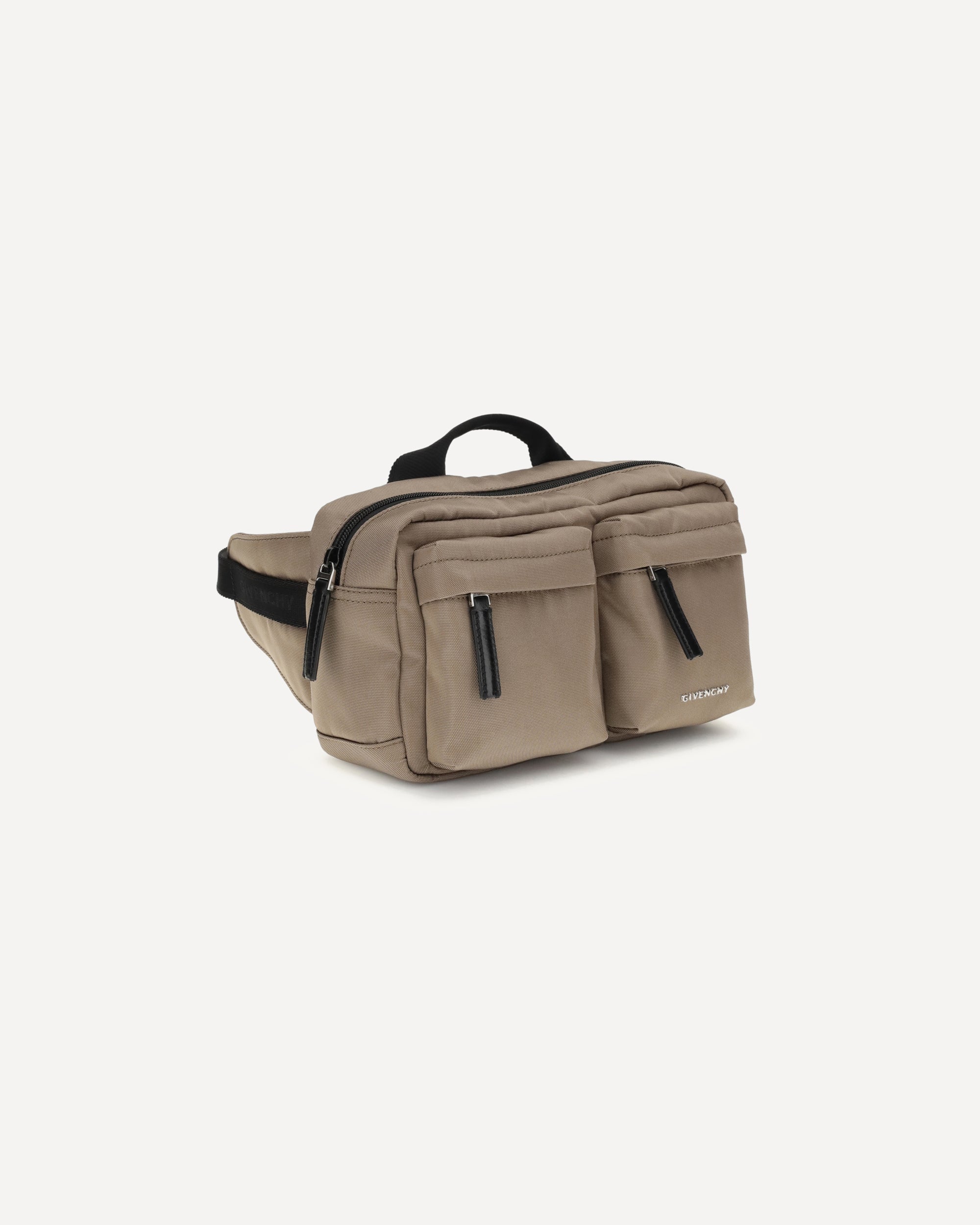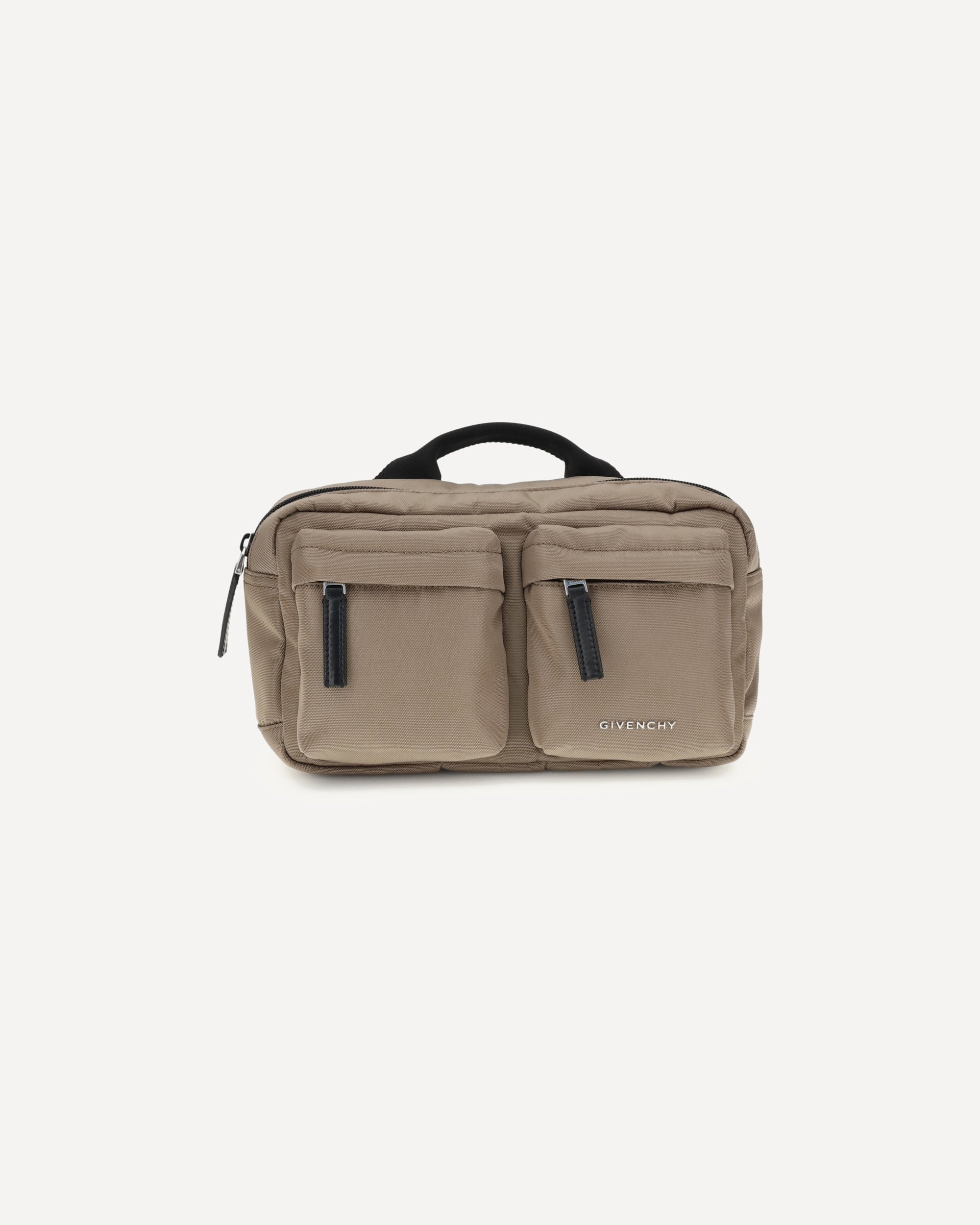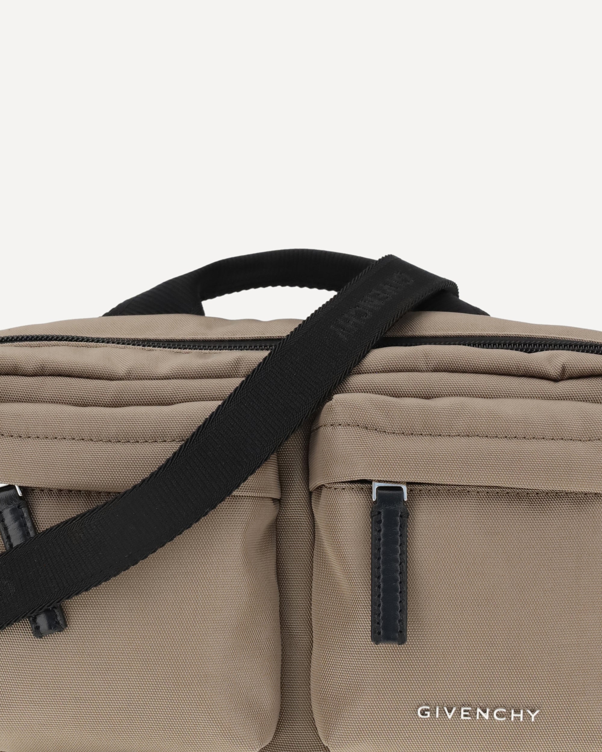 Givenchy's Essential U canvas Fanny Pack combines practicality and urban style. Made of durable canvas, it features a top handle, zipper closure and leather pull tab. The adjustable GIVENCHY webbing shoulder strap allows for crossbody wearability. Signature metal and silver details add a distinctive touch. A main compartment and two front zipper pockets complete the design.
