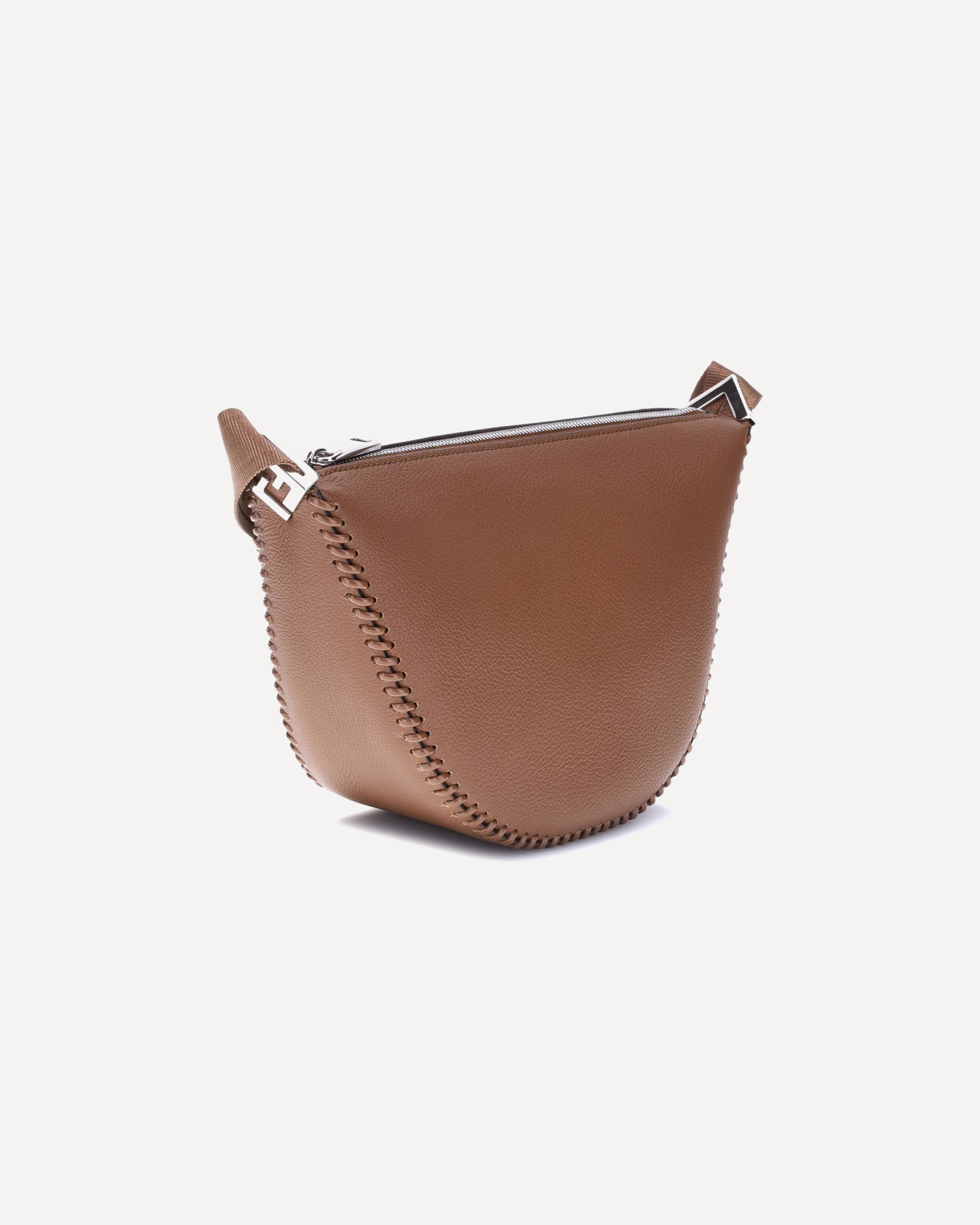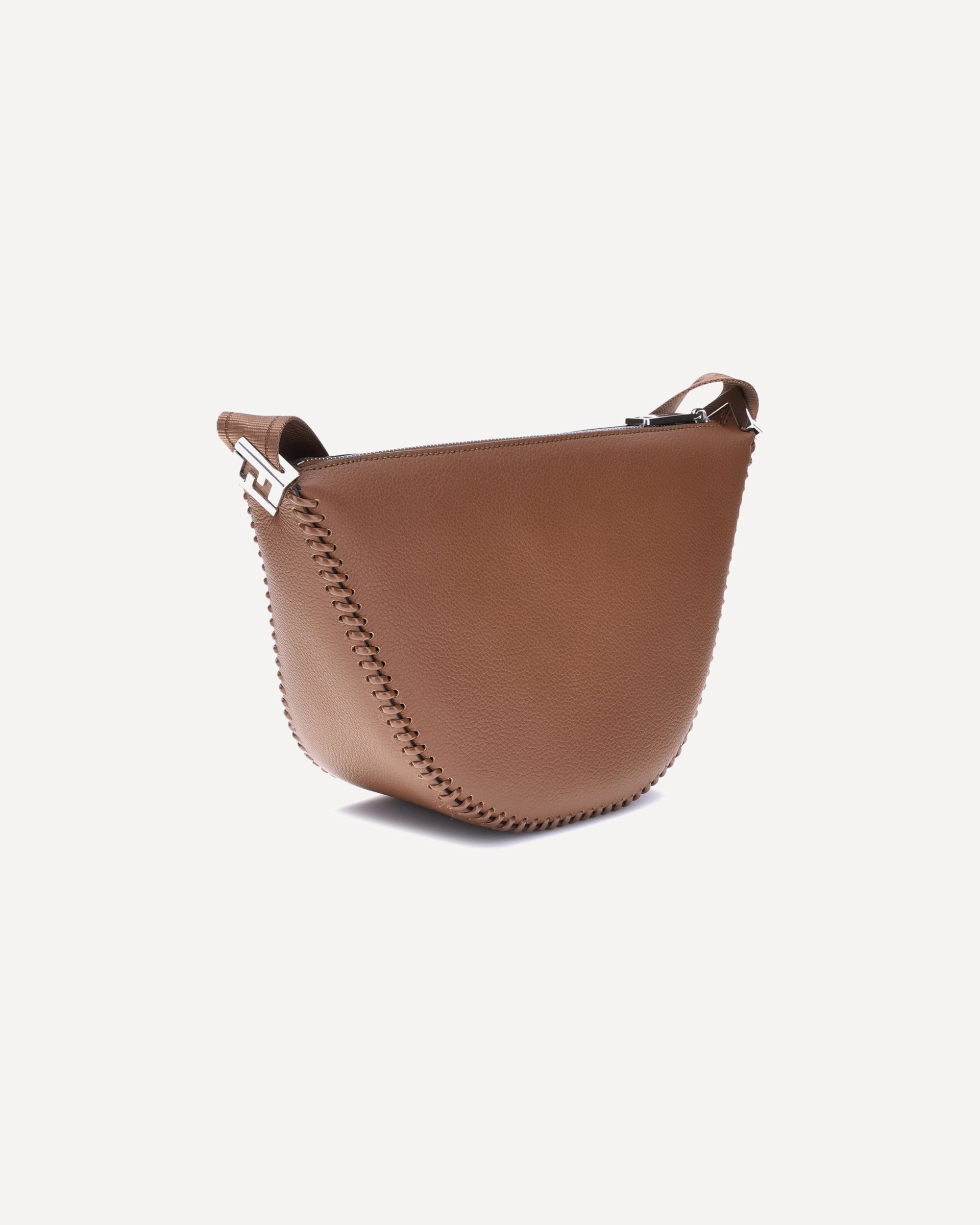 Fendi's Melon small Shoulder Bag is distinguished by its elegant crescent shape and refined brown full-grain leather with tone-on-tone hand threading. Embellished with FF metal appliqués on the corners and palladium-finish hardware, it features a practical zipper closure and an adjustable shoulder strap in technical fabric with FENDI lettering for a modern and distinctive touch.