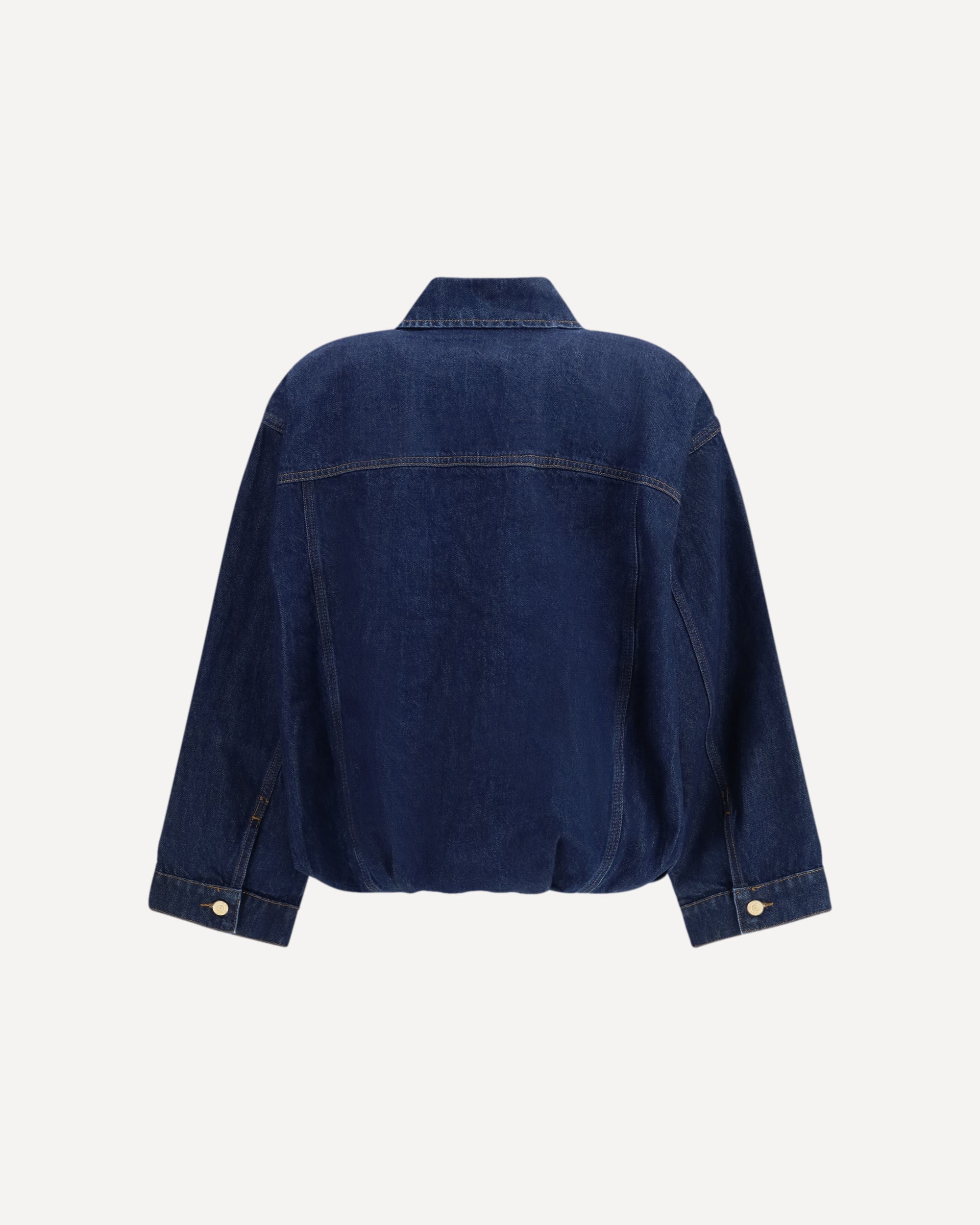 The denim Jacket by 7For is a modern and sophisticated garment, featuring a front closure with gold-colored buttons that add an elegant touch. The flap chest pockets and side welt pockets offer practicality, while the gathered hem adds volume and a soft shape that gives the design a dynamic effect. Contrast stitching emphasizes the details, completing a unique and fashionable look. Perfect for those looking for a versatile garment that combines elegance and comfort.