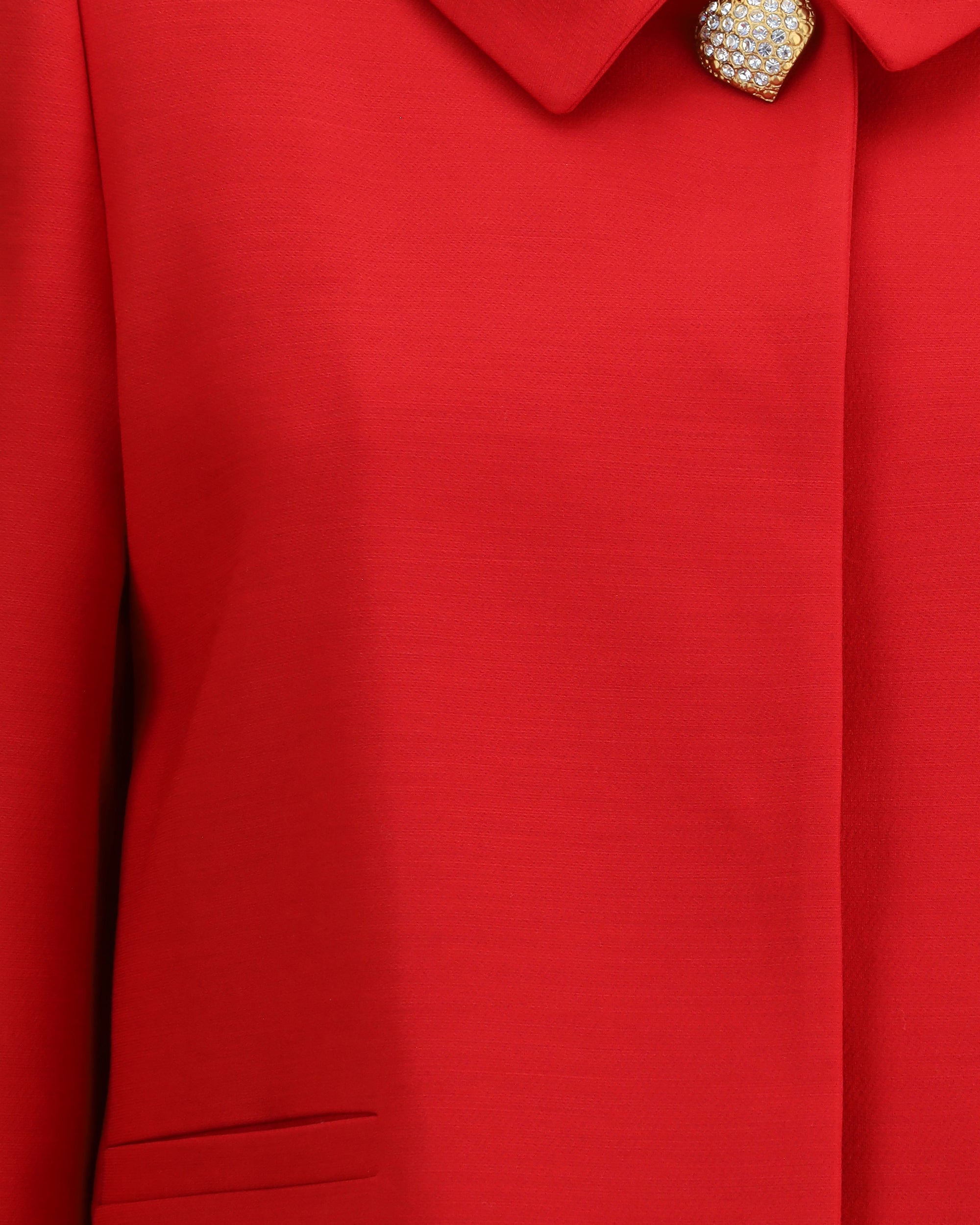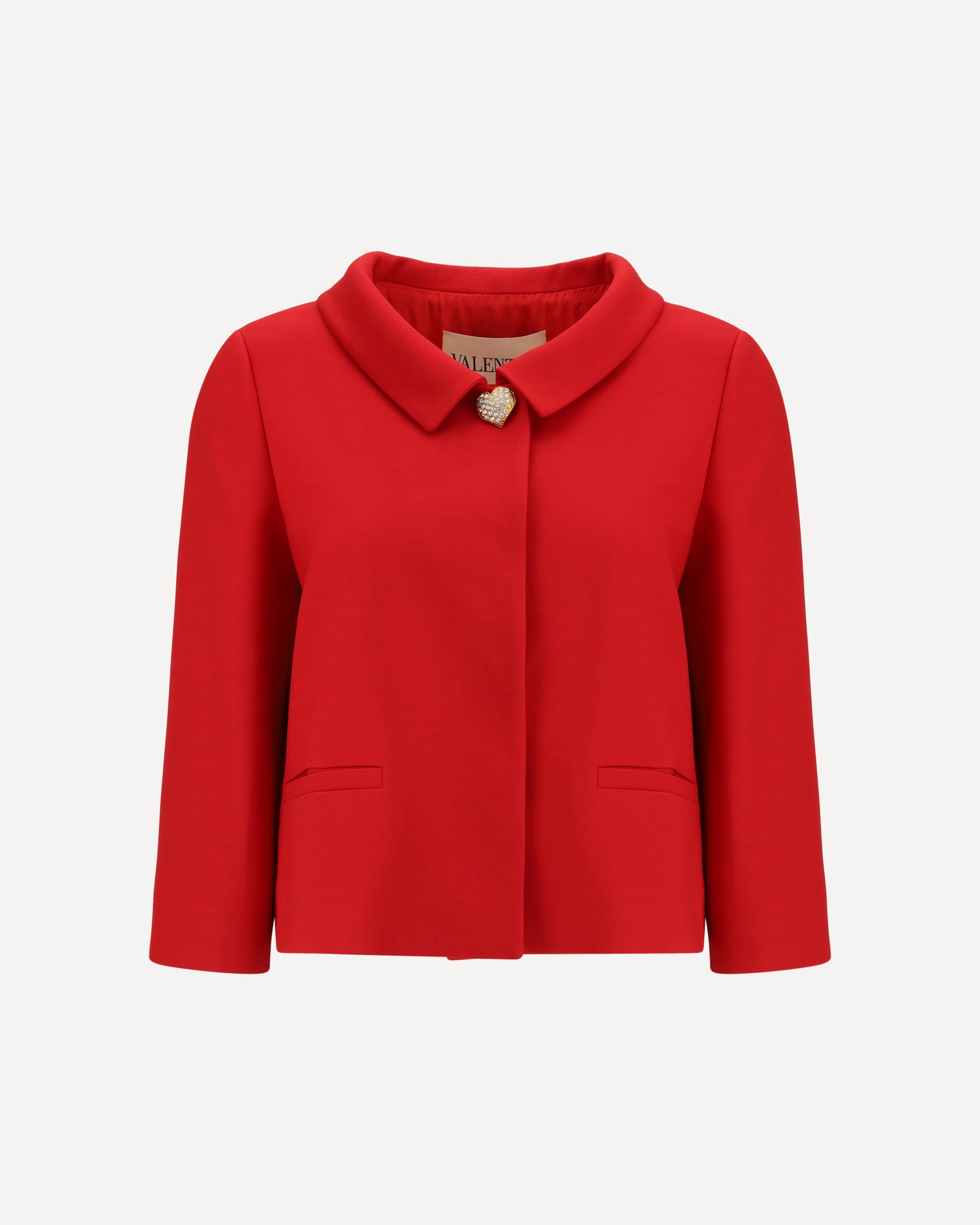 Valentino's Blazer is a sophisticated and sophisticated piece, perfect for adding elegance to any look. The classic collar and front snap-button closure give it a clean, formal cut. The two front welt pockets add a touch of functionality, while the heart-shaped button with rhinestones on the front gives a distinctive and shiny detail, making the blazer unique and irresistible.