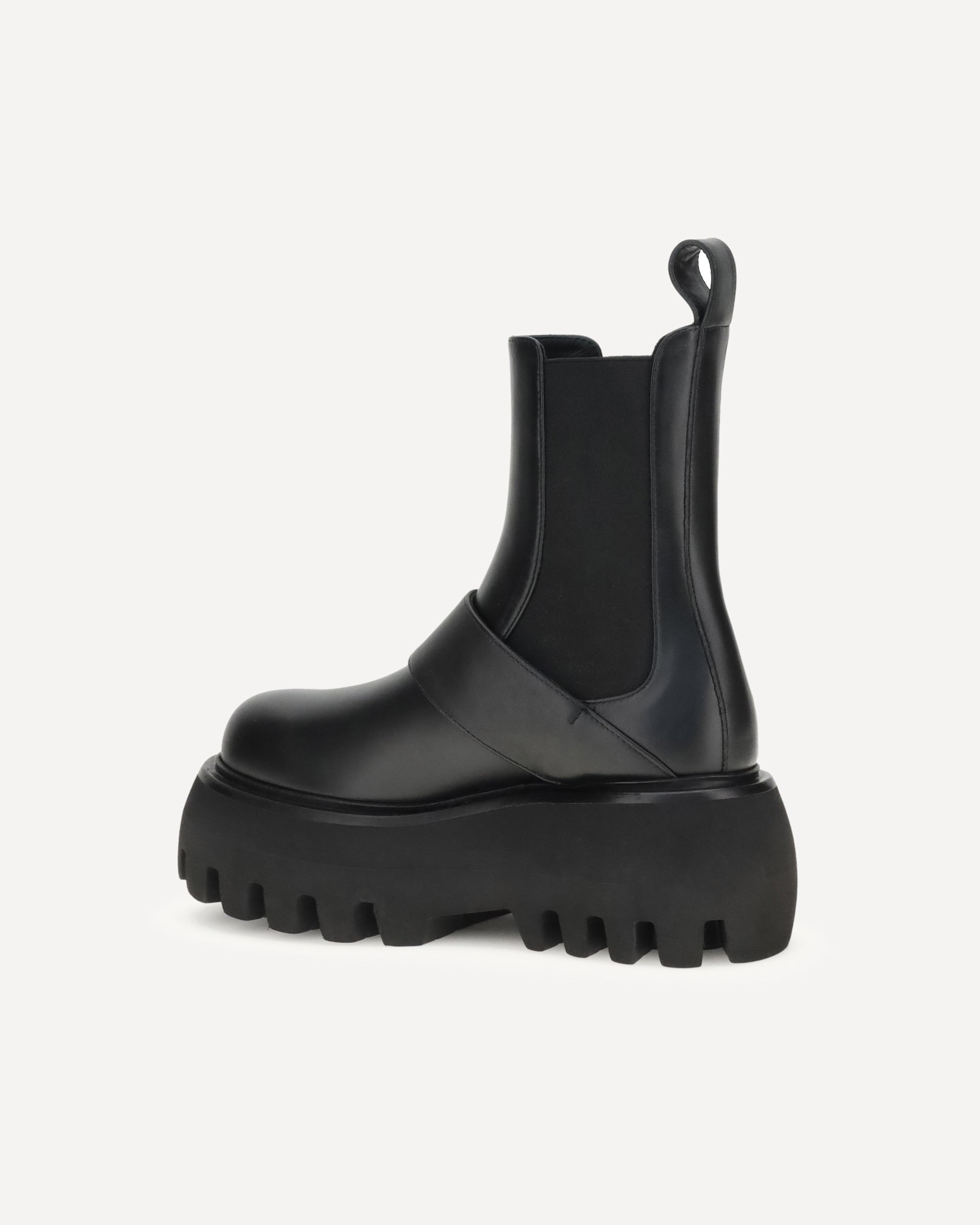 The Sofa Ankle Boots by McQueen feature a strap across the instep. They have a round toe, elastic side inserts, and a convenient heel pull tab. The interior is accented with the printed logo, while the platform adds both style and comfort.