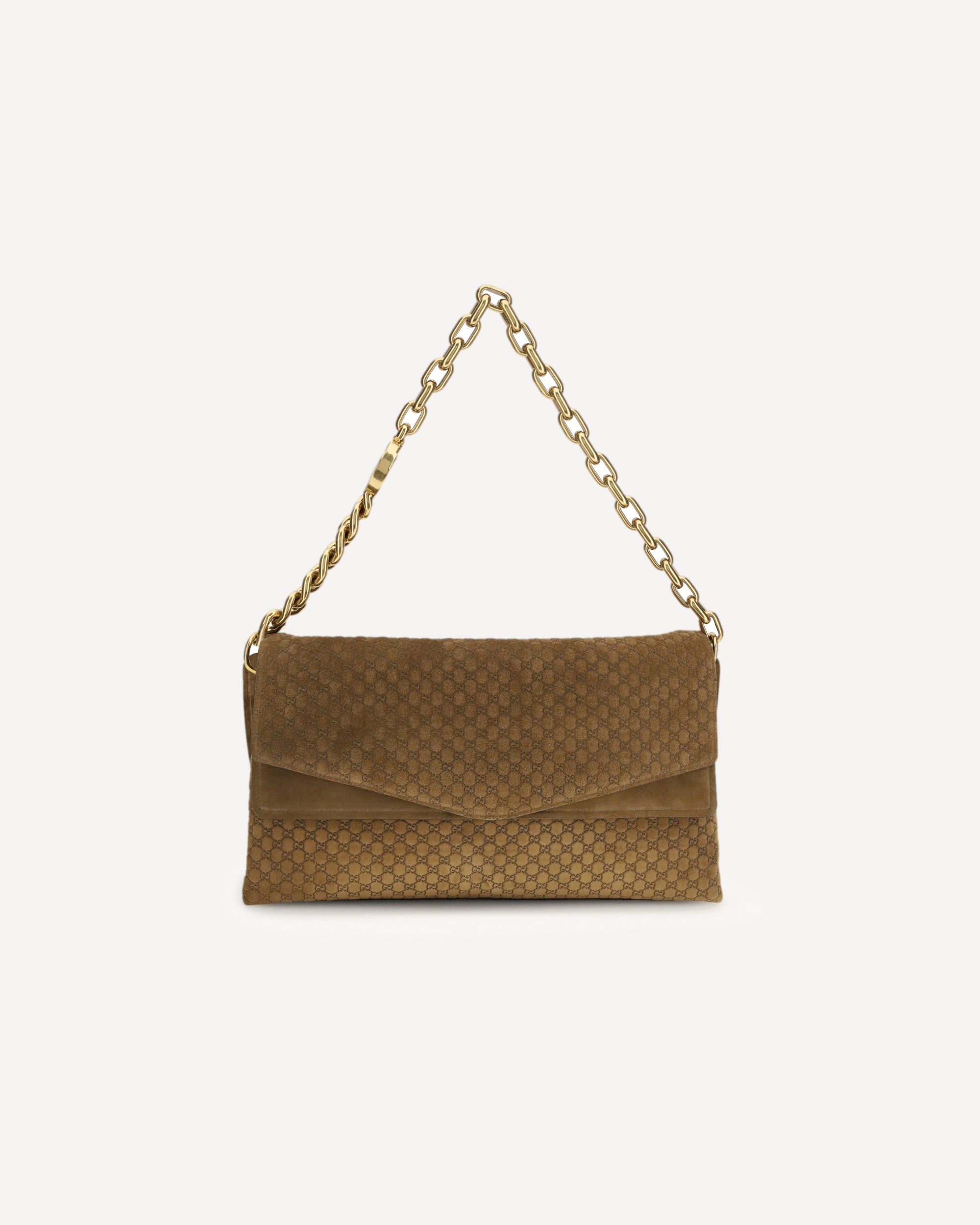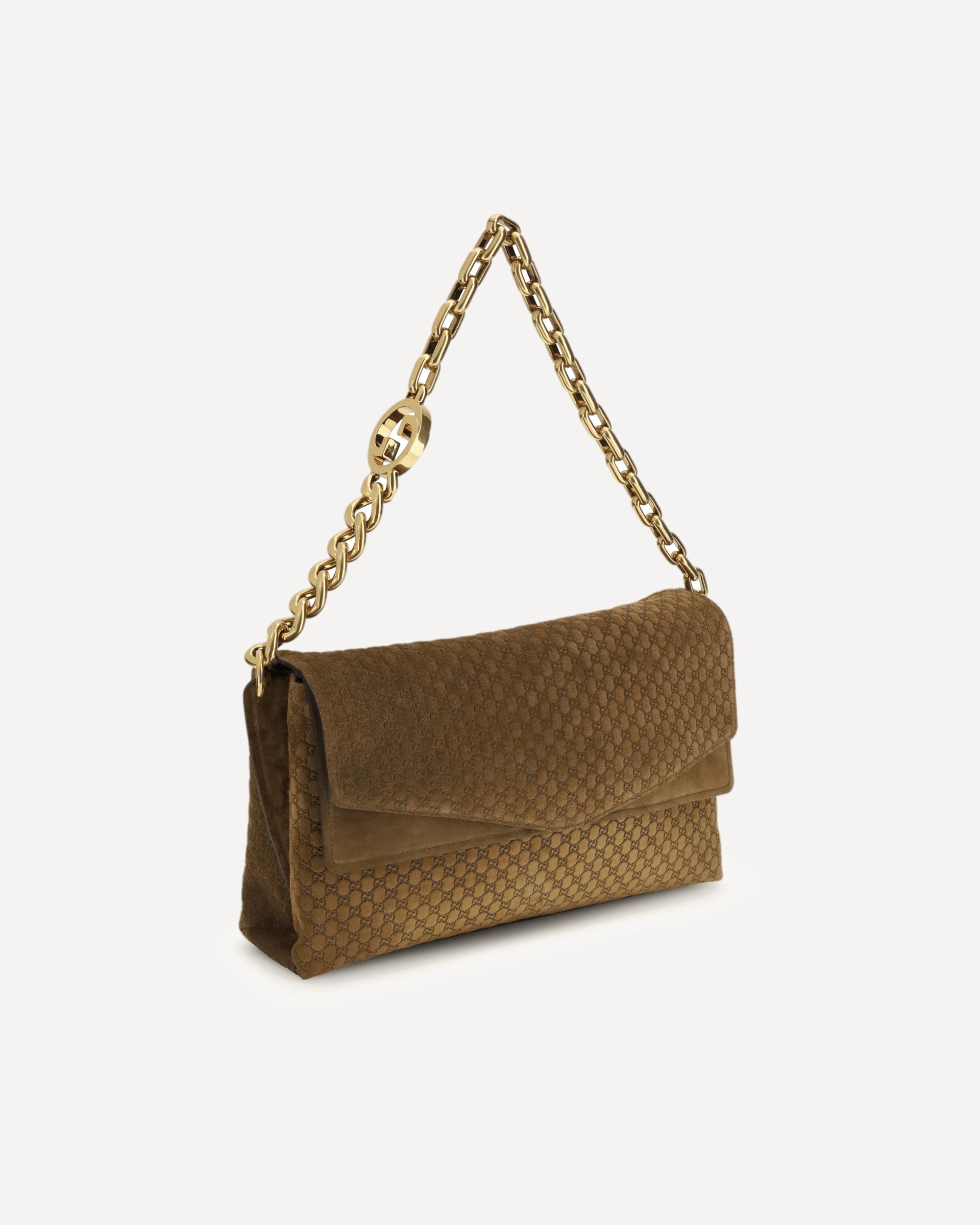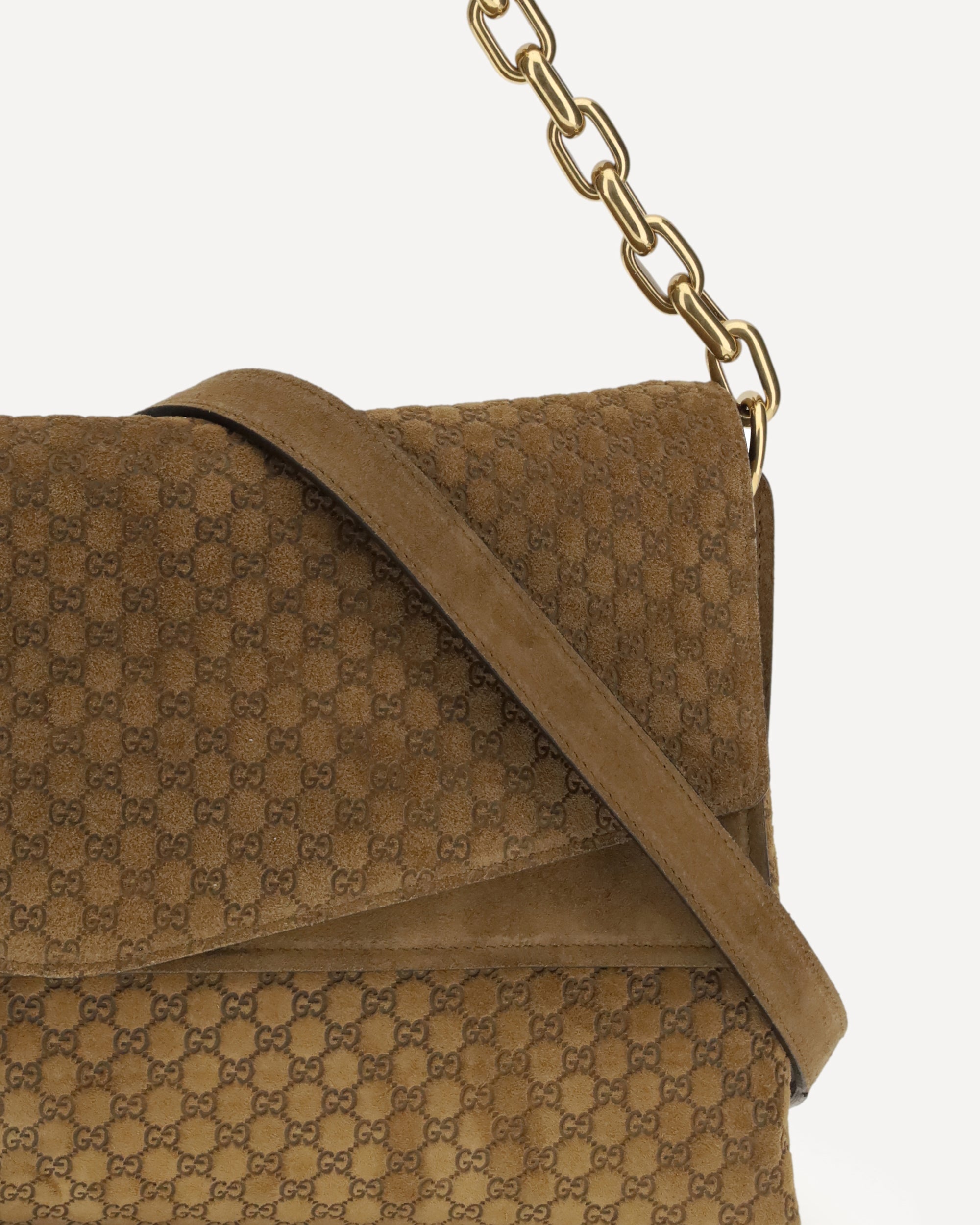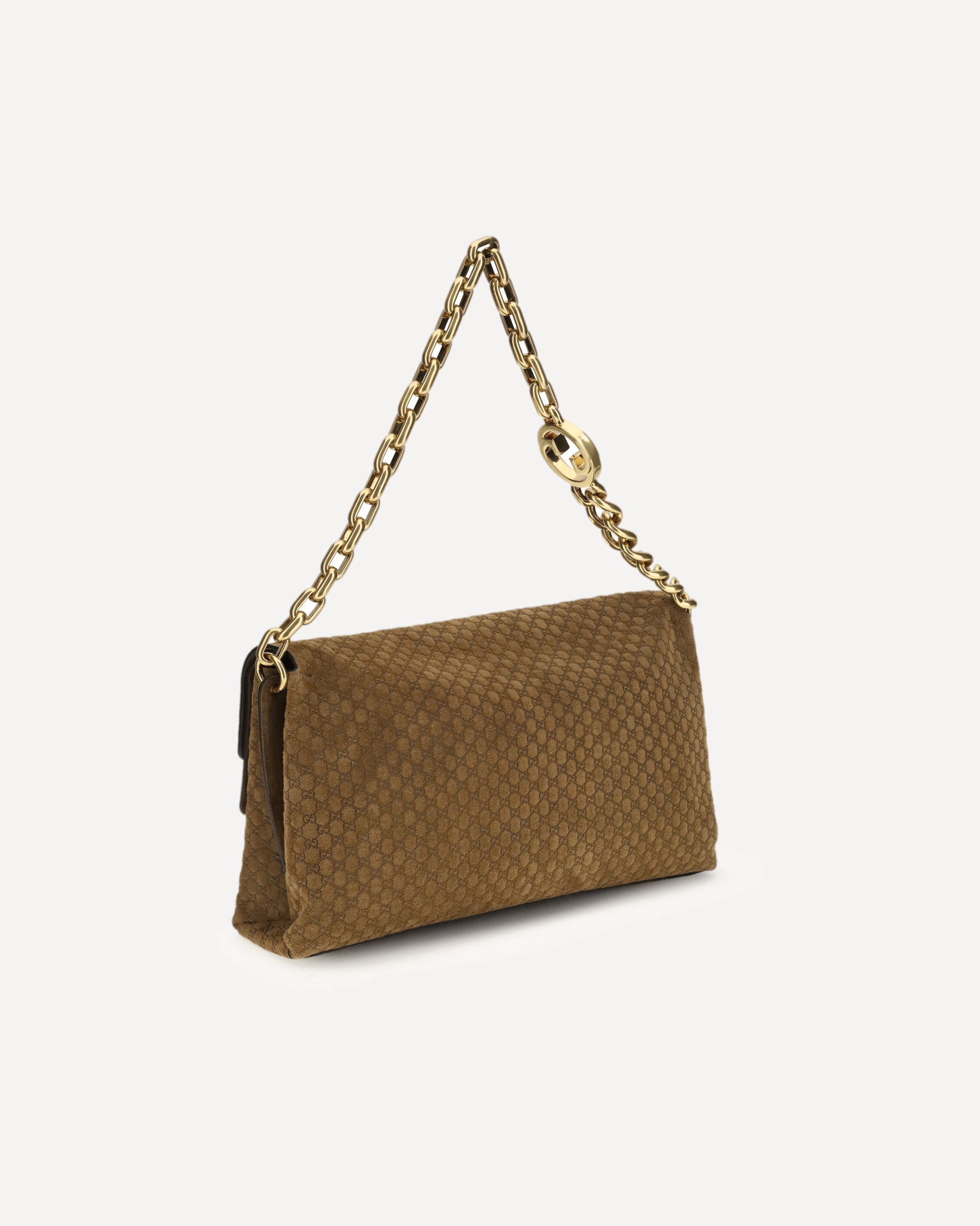 The large suede shoulder Bag is crafted from soft camel suede and defined by the all-over embossed GG design. The metal chain shoulder strap features the iconic Double G detail, adding a refined signature element. A concealed magnetic button secures the flap closure, while the lined interior includes both a slip pocket and a flap pocket for optimal organization. A timeless, sophisticated accessory that elevates any outfit with unmistakable Gucci style.