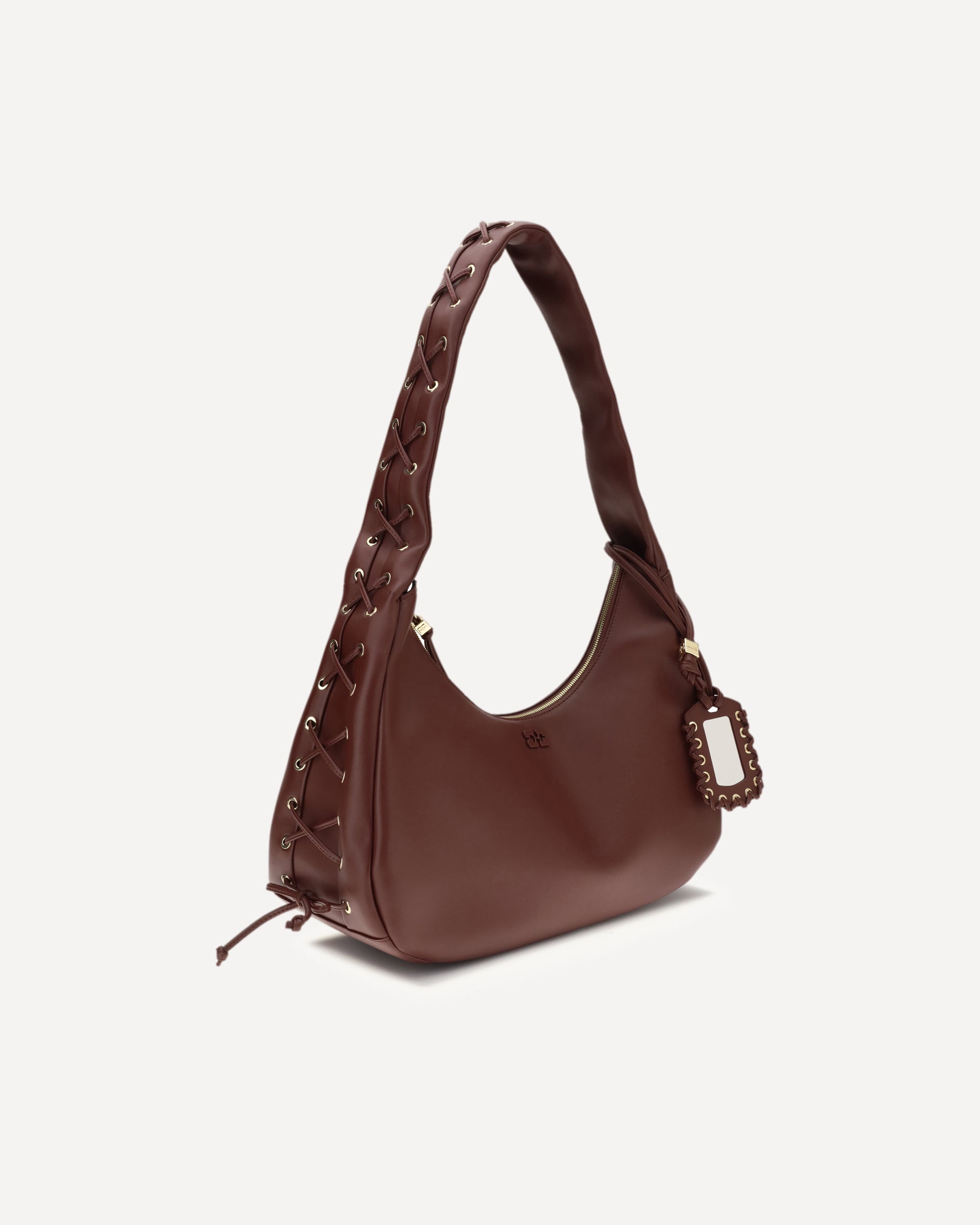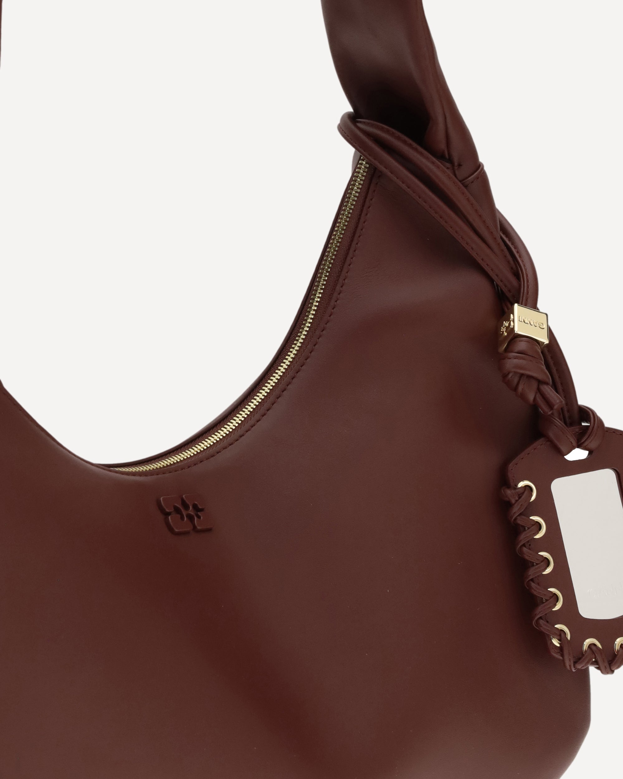 The Laced Shoulder Bag by Ganni combines contemporary style with sophisticated details. Crafted with a shoulder strap and zipper closure, it features a gold-tone butterfly logo, metallic dice with Ganni and Butterfly engravings, and an embossed logo on the back. Laced corset details, a mirrored label, a main compartment and an interior zippered pocket complete the design, making it practical and distinctive.