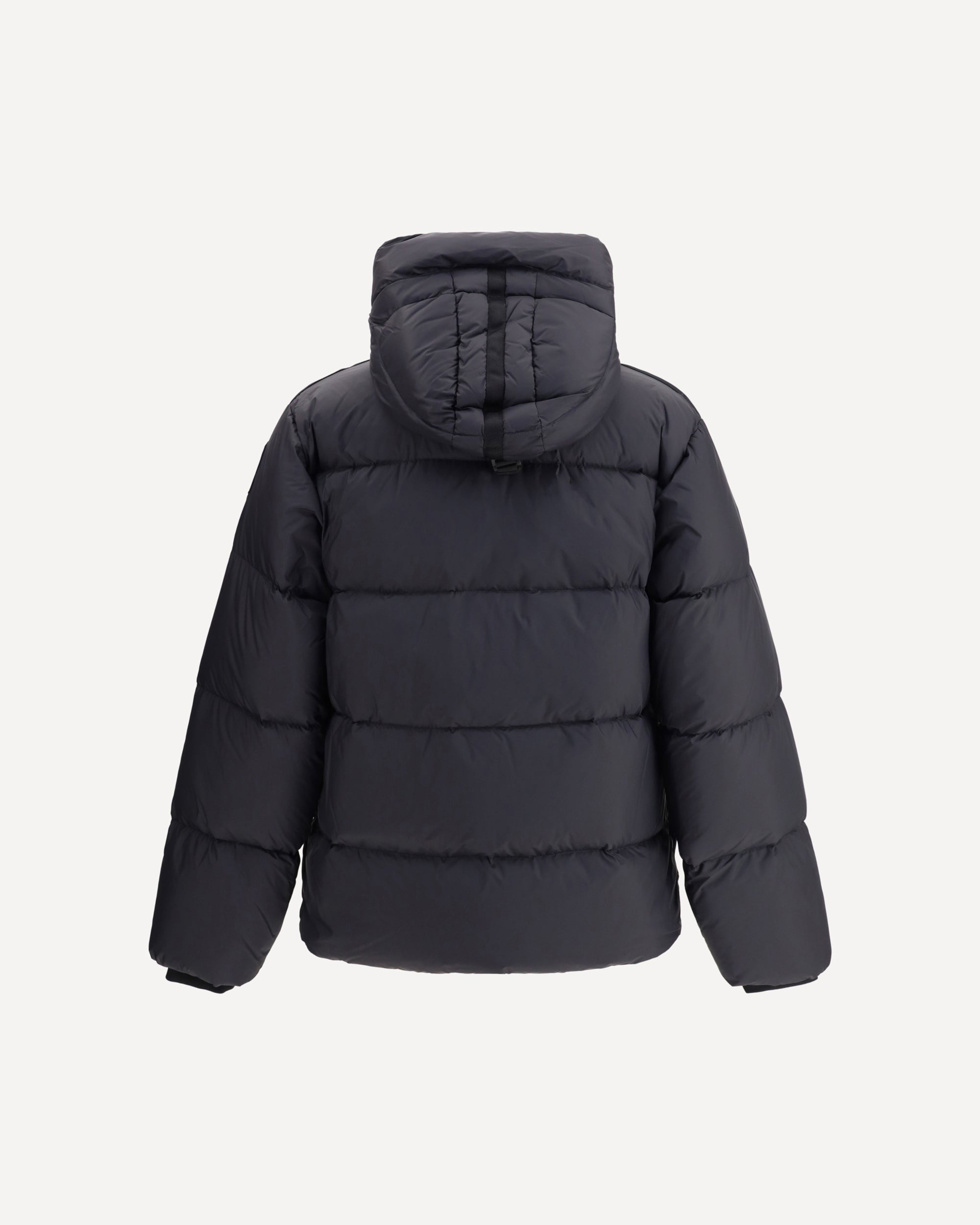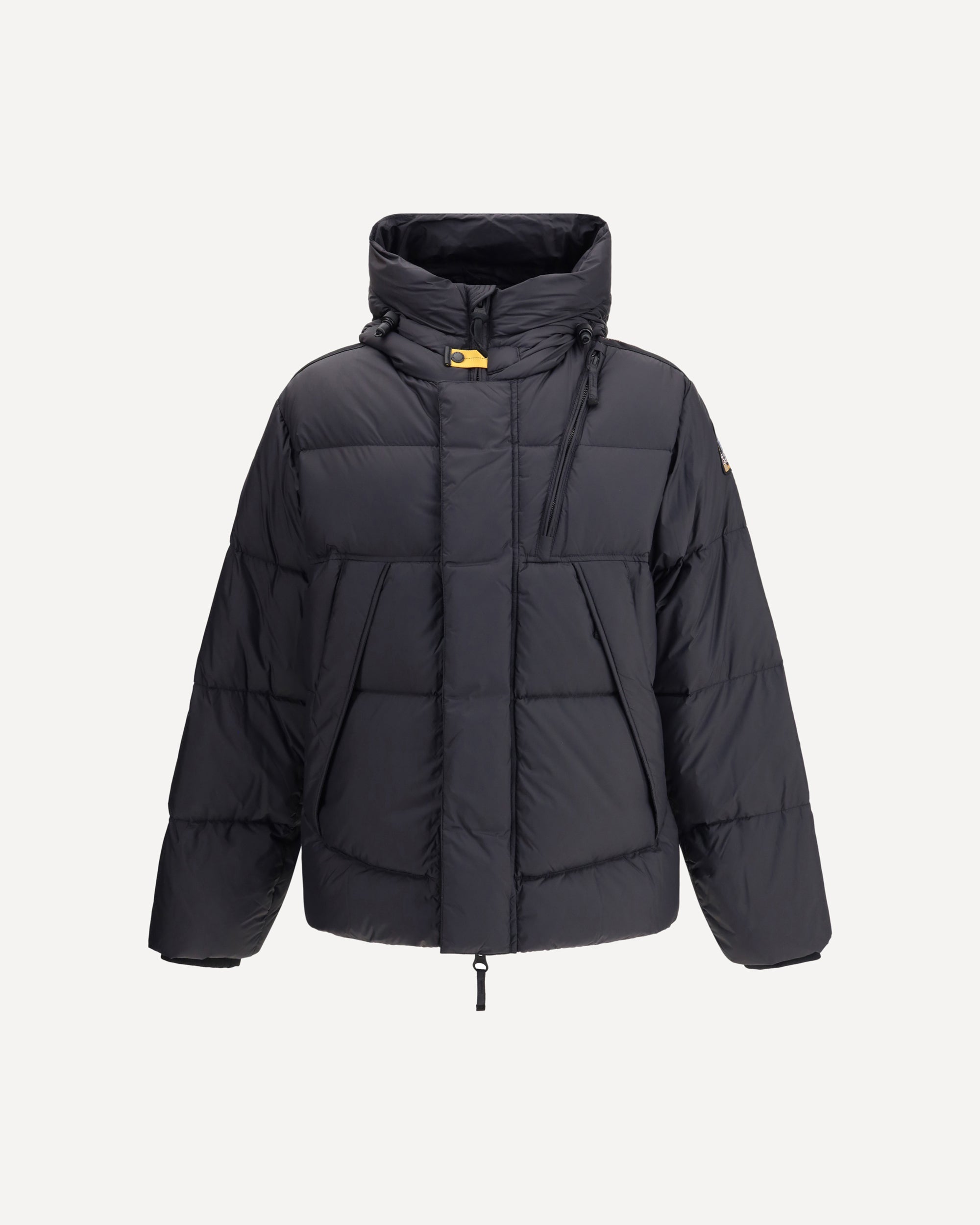The Down hooded Down Jacket by Parajumpers features a double-slider front zipper closure, protected by a windproof flap with snap buttons. The hood is adjustable with drawstrings, while the garment offers three exterior zippered pockets and two interior pockets. The waist and bottom are adjustable with drawstrings, and the cuffs are made of elastic rib for a better fit. Completing the design is the reflective PJS logo on the back yoke, the Parajumpers patch on the sleeve, and the iconic removable yellow tape at the neck closure.