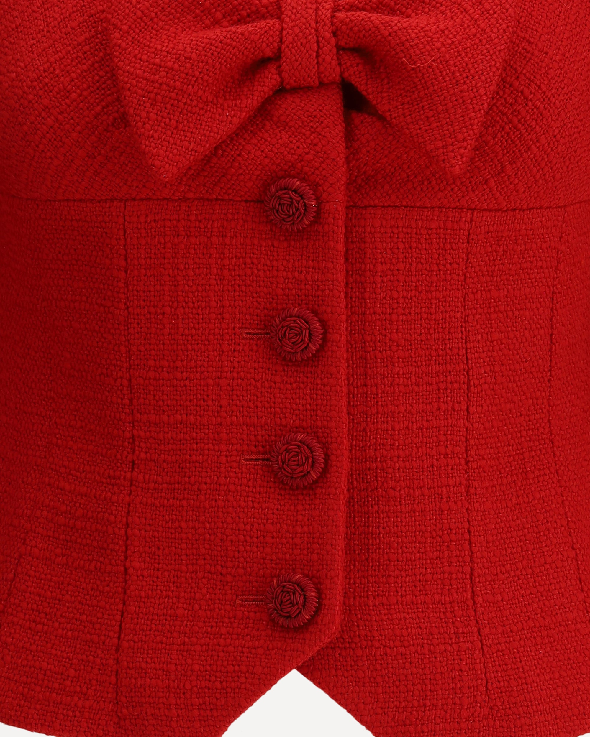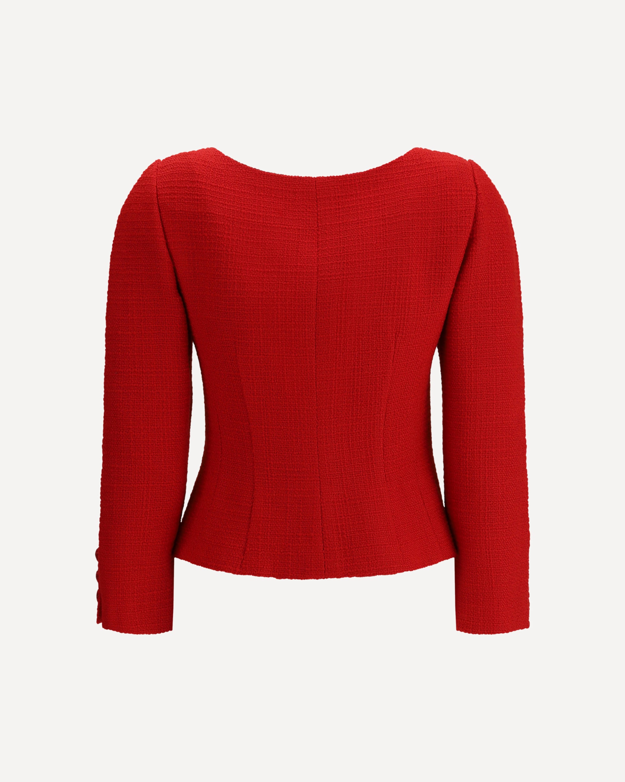 The Short Jacket in Plain Wool Tweed by Valentino captures classic elegance with a romantic twist. The structured fabric enhances the compact silhouette, enriched by a wide neckline that balances femininity and poise. The front soutache button fastening adds a refined sartorial detail, while the bow introduces a delicate and distinctive accent. A sophisticated piece, ideal for completing elegant looks.