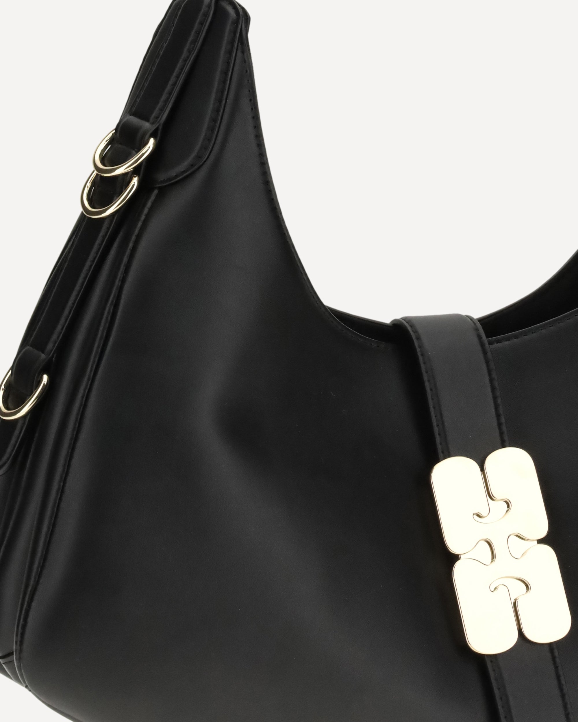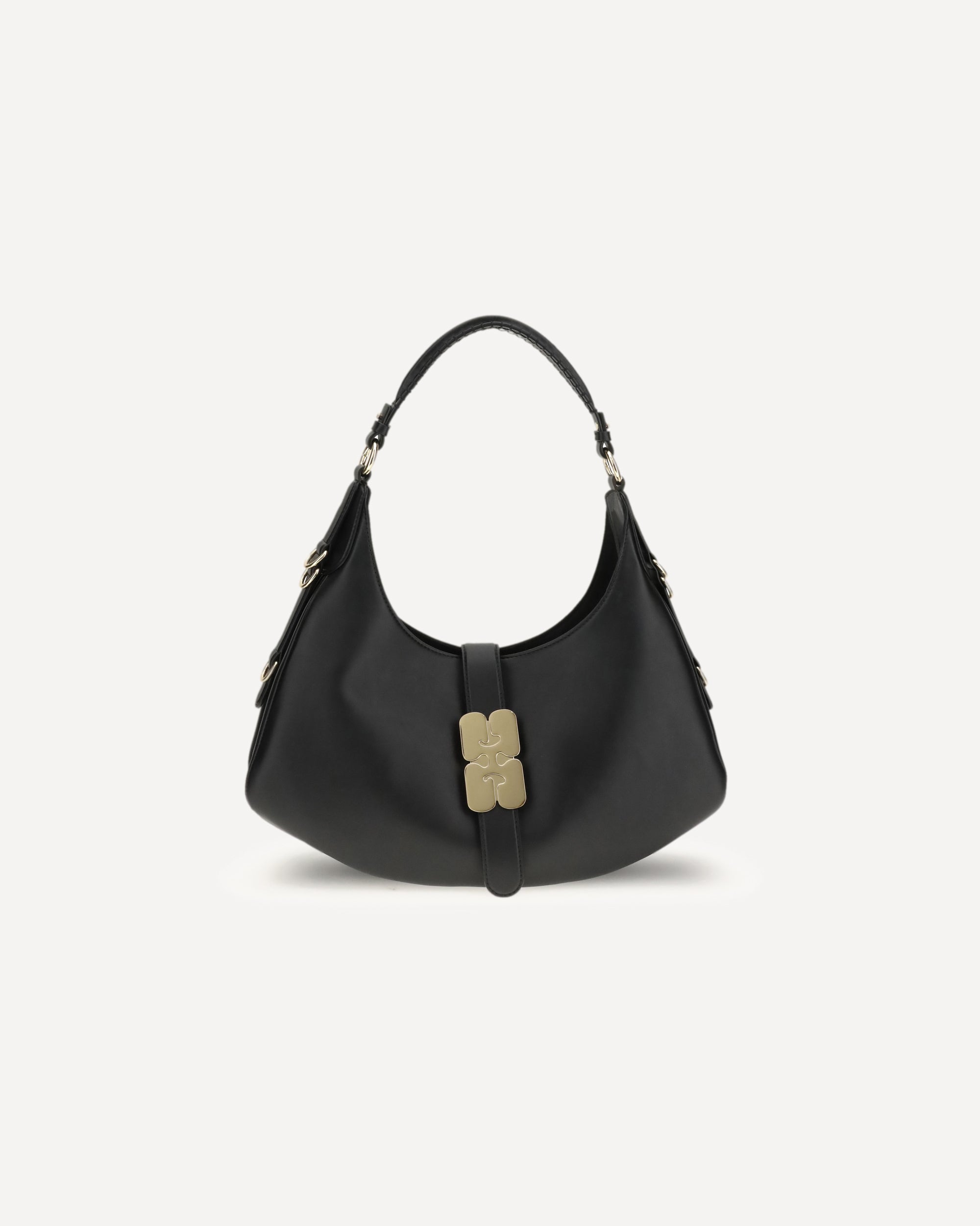 The Small Kat Bag by Ganni features a soft soufflet-style silhouette, enhanced with a shoulder strap and D-ring detailing along the sides. The tab closure is finished with the signature gold-tone GANNI Butterfly clasp, opening to a main compartment with an internal open pocket. A compact yet practical design, crafted to elevate everyday wear with understated elegance.