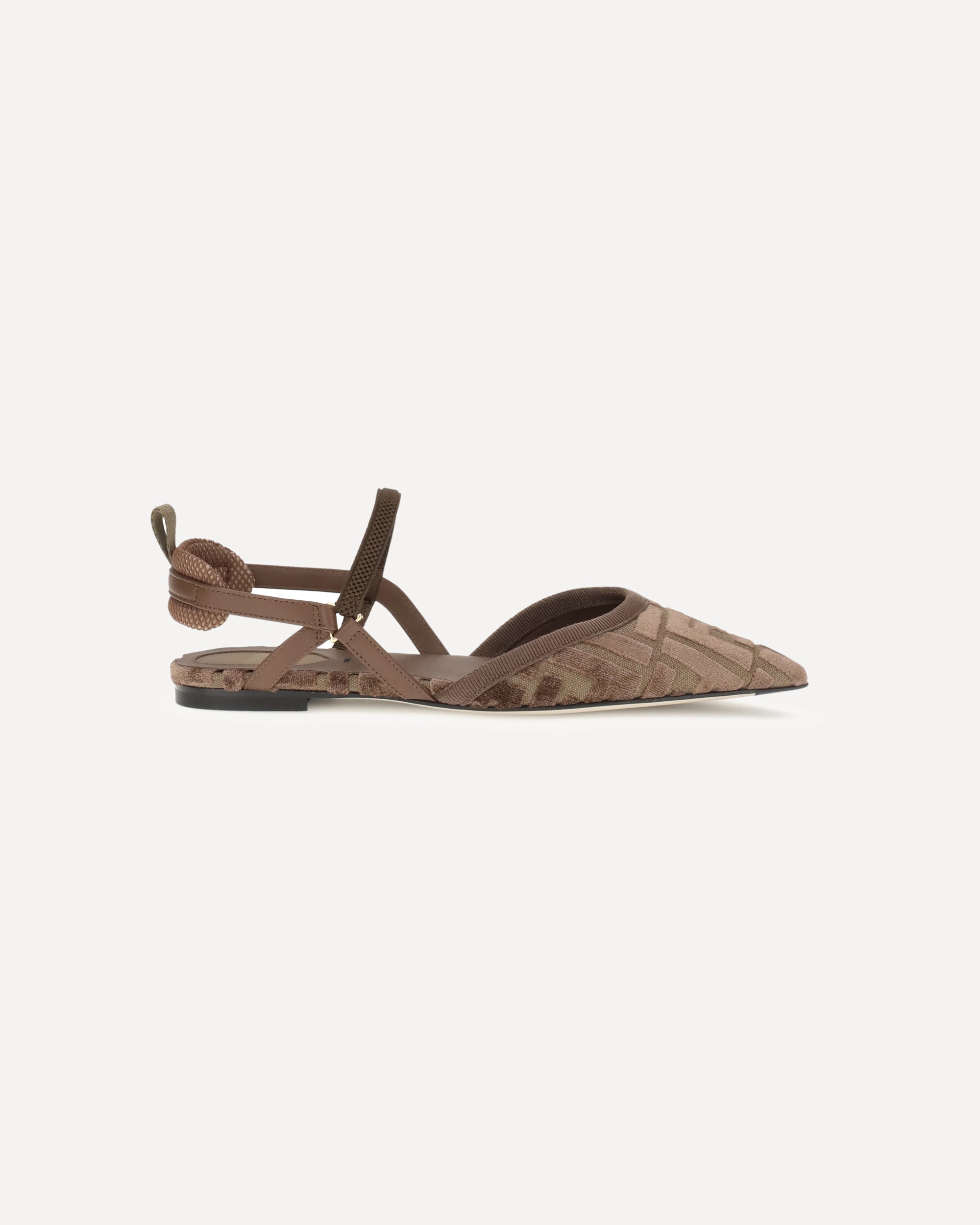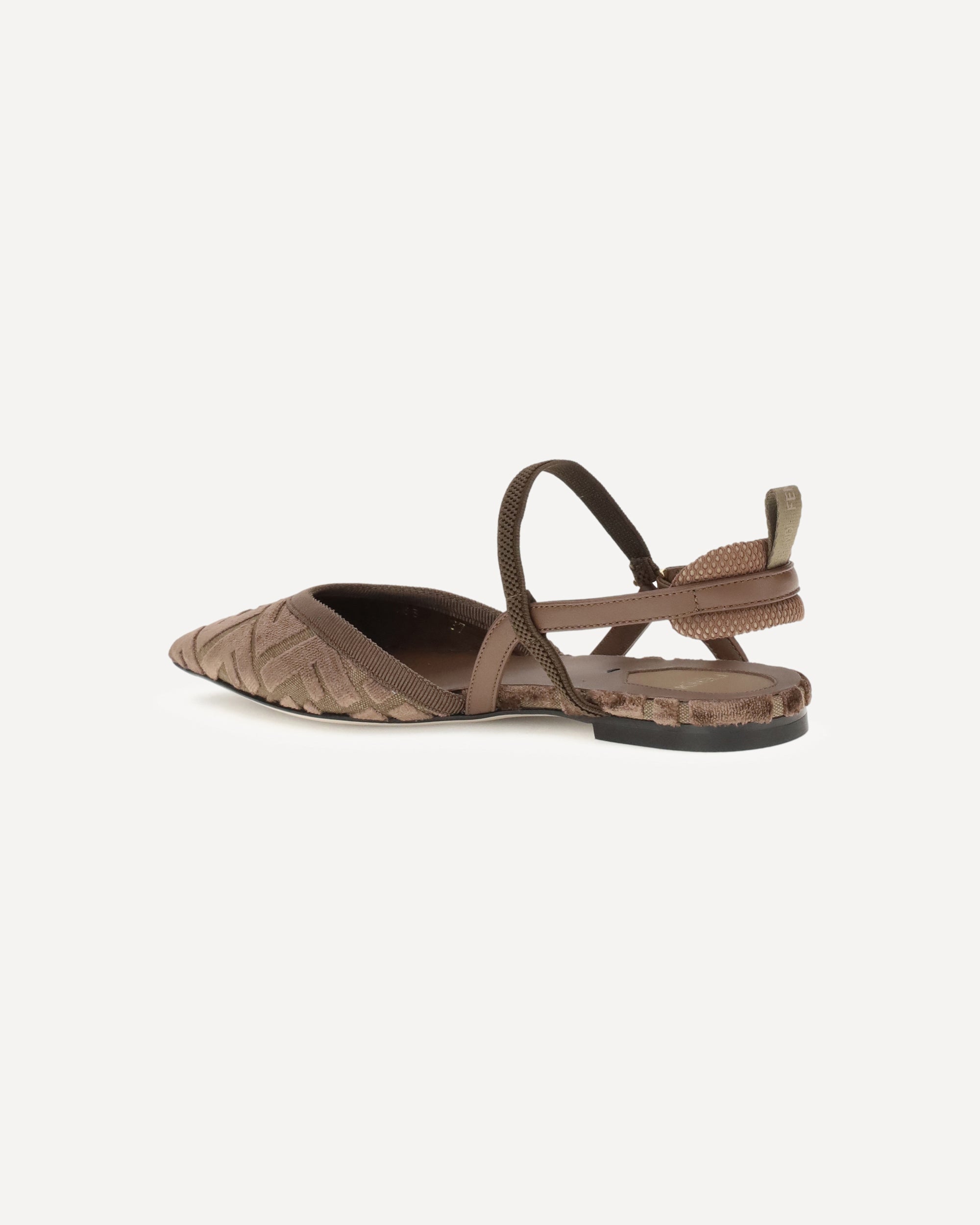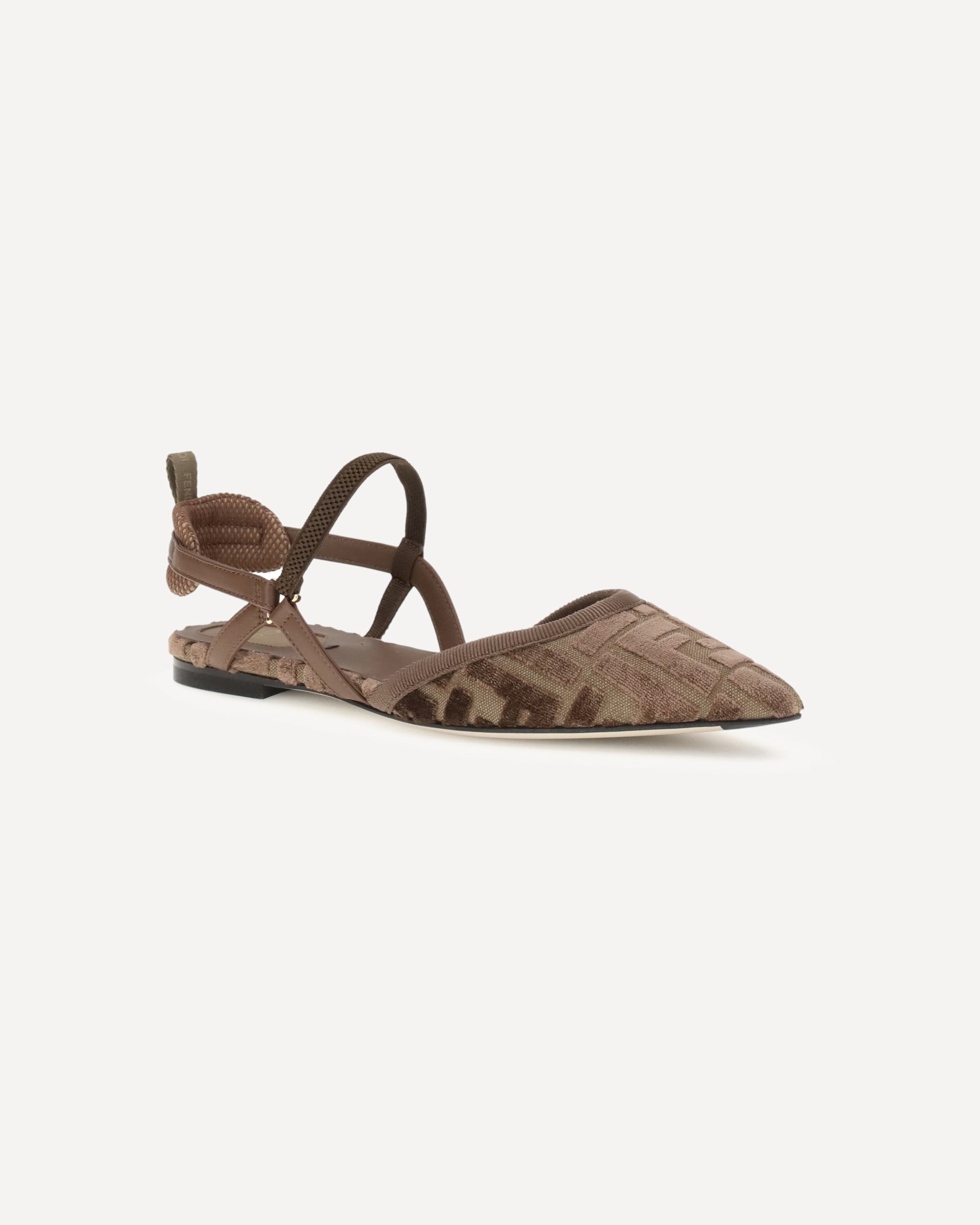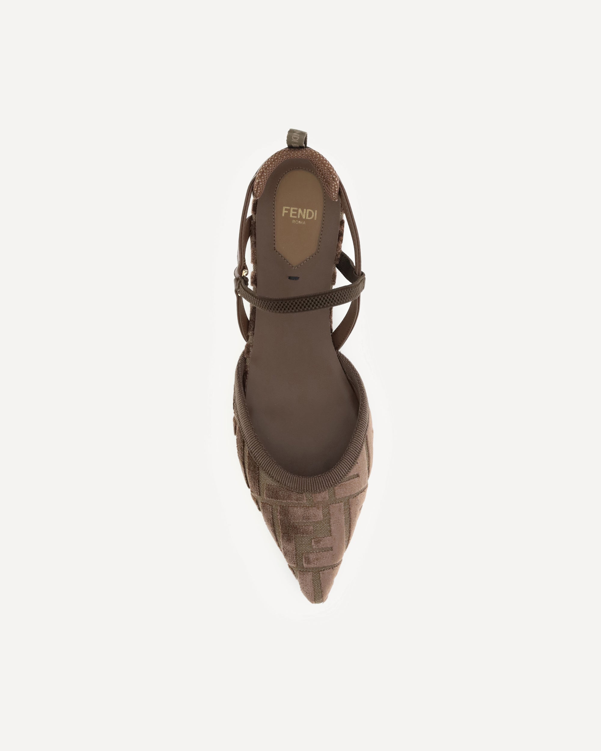 Fendi's Colibrì Lite slingback Ballerinas are distinguished by a tapered, feminine silhouette enhanced by thin elastic ribbons that gently wrap around the foot. Made of mesh, they are decorated with multicolor embroidery of the FF motif in shades of blue. The sole features a rubber island for added grip, while the padded cushioning and trekking hook lend a sporty and functional touch, combining comfort and style.