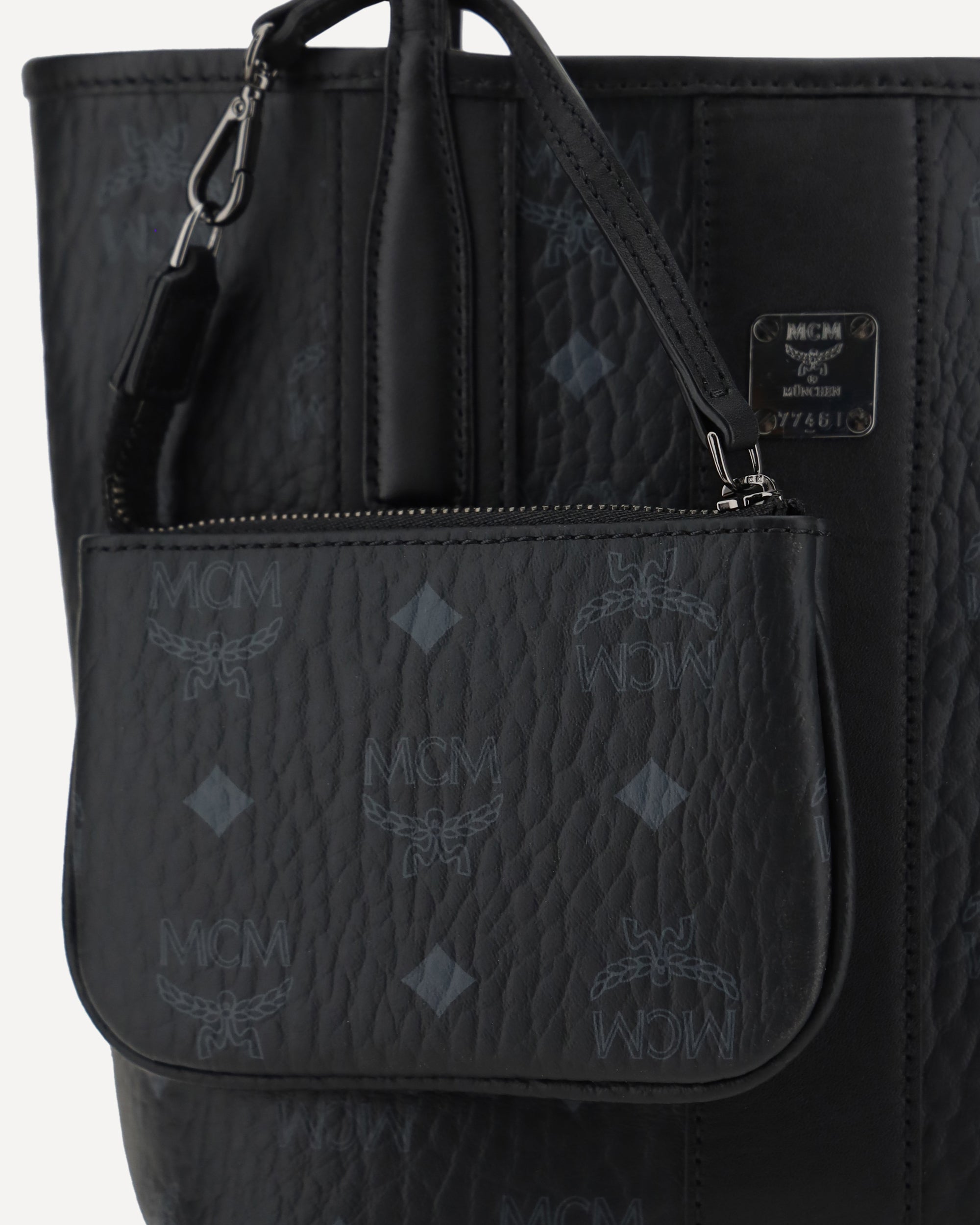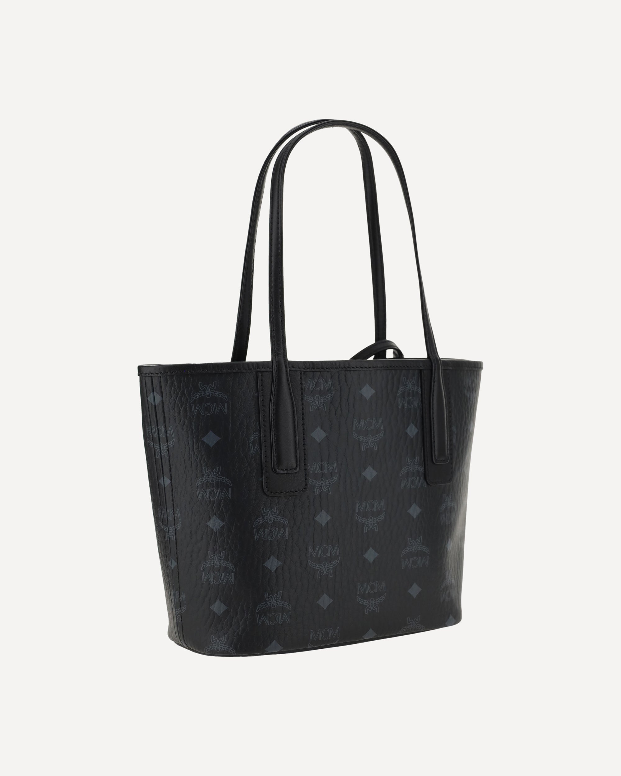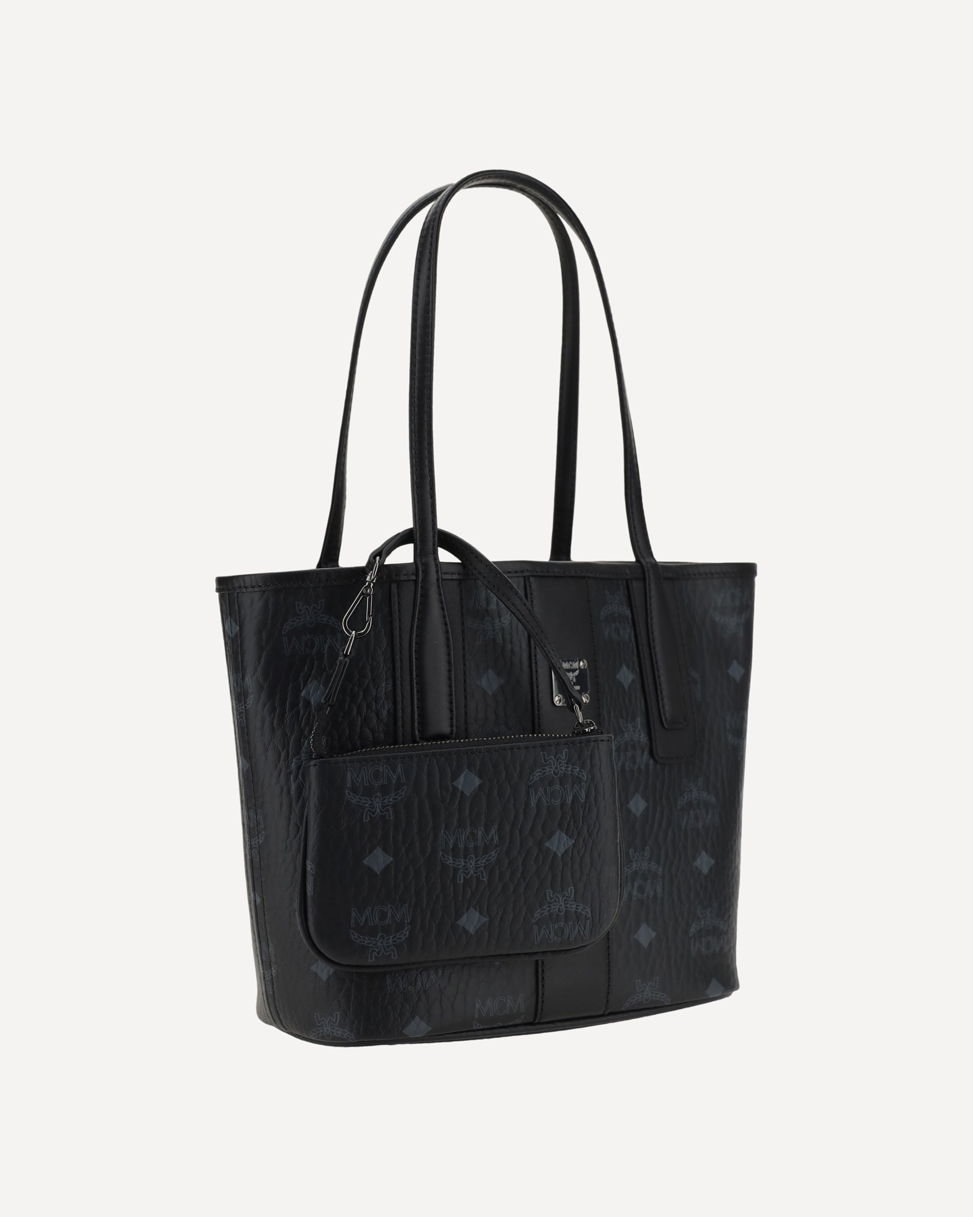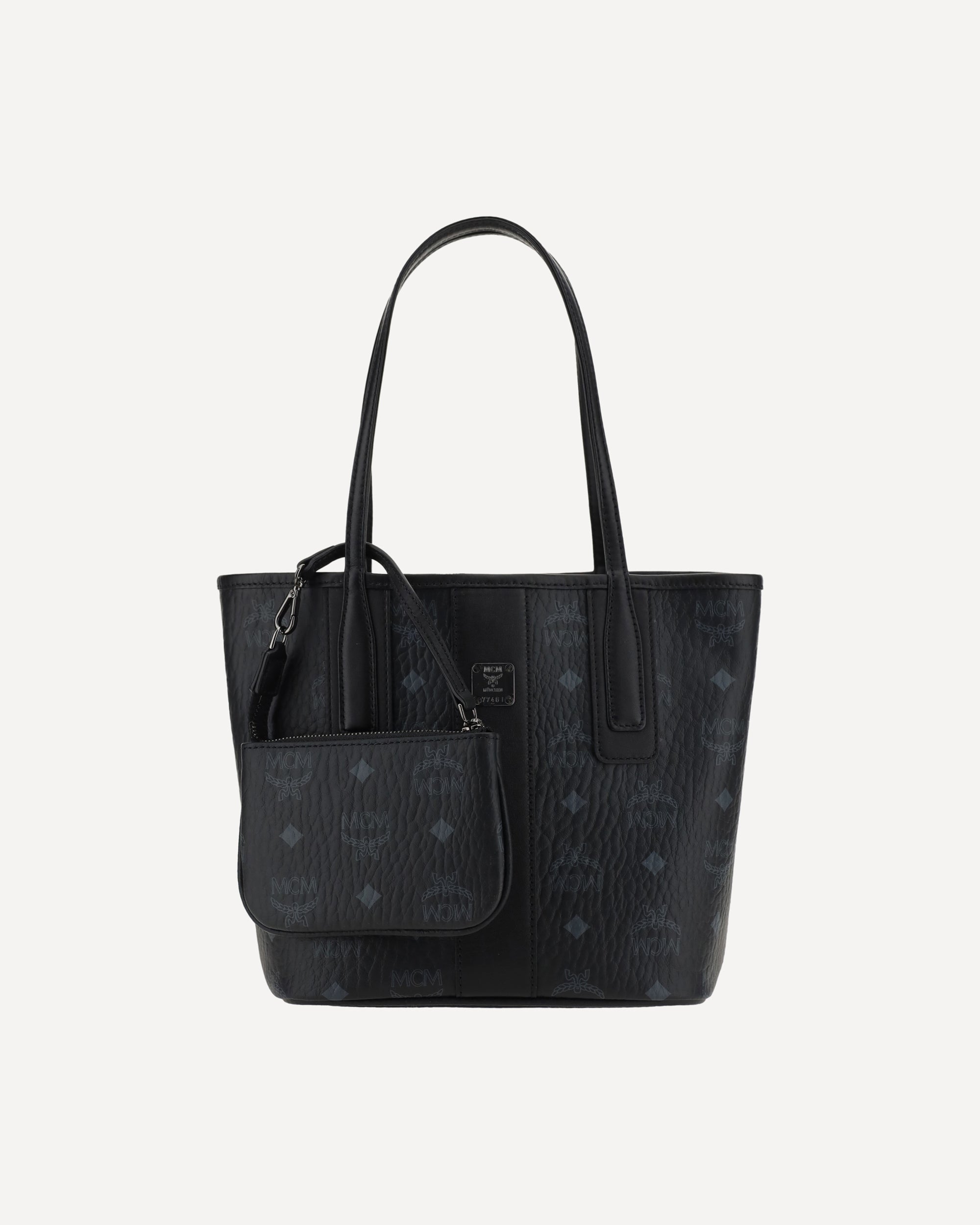 Liz Handbag by MCM, two flat top handles, magnetic button closure, gold plaque on iconic brand logo applied on front, mini pouch with integrated zipper, iconic brand logo printed all-over.