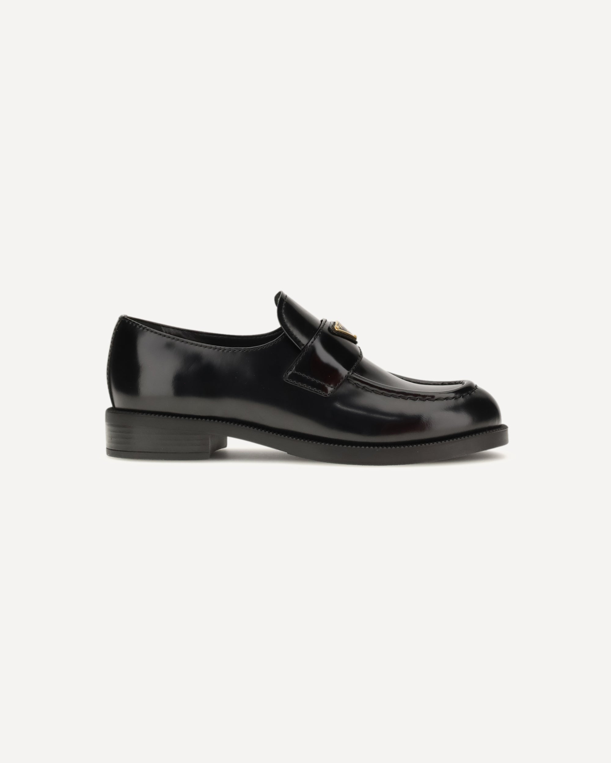 The leather Loafers by Prada are crafted from glossy-finish leather and elevated by the iconic metal triangle logo on the saddle. They feature a rounded toe and a stamped internal logo, offering essential elegance and unmistakable brand identity.