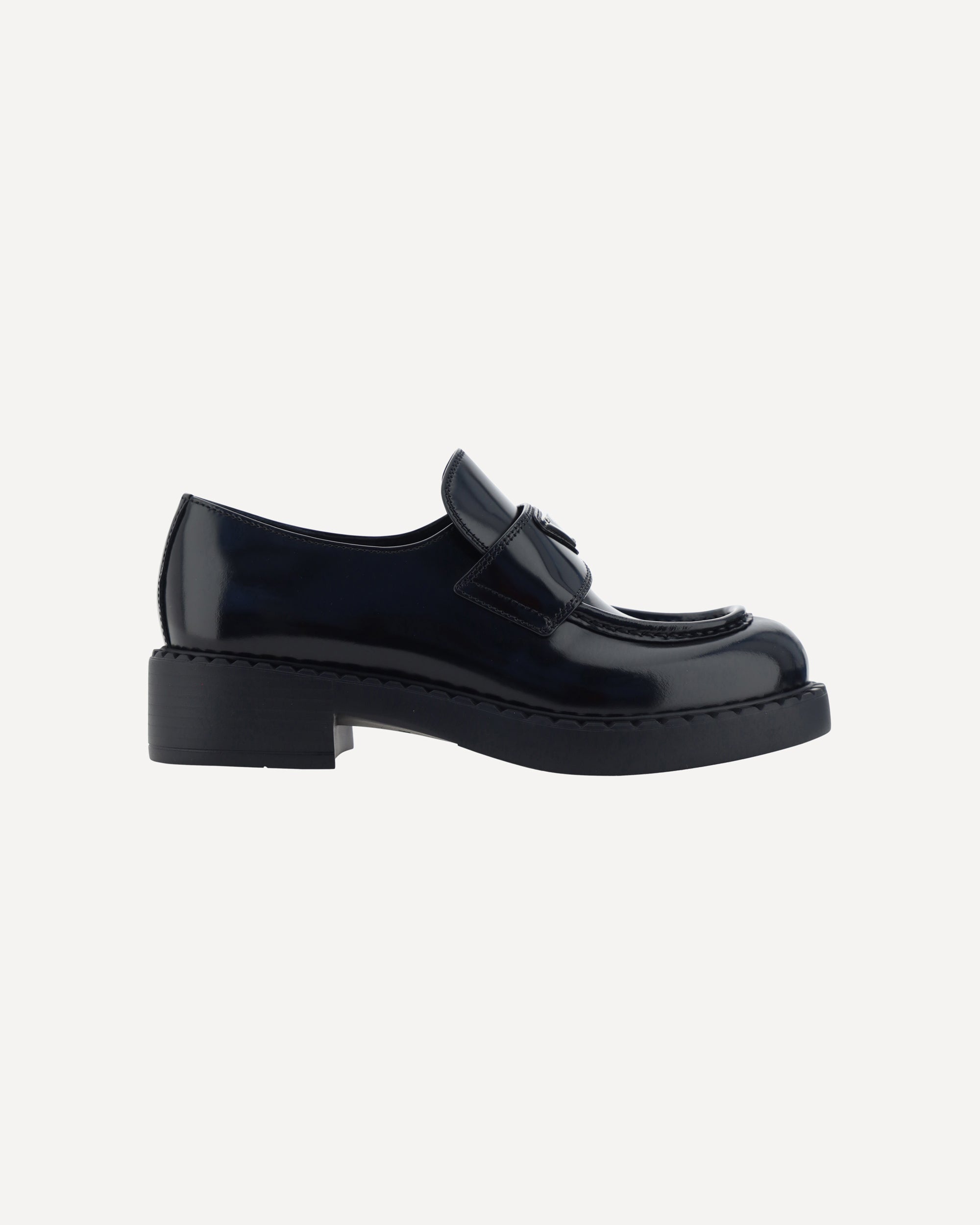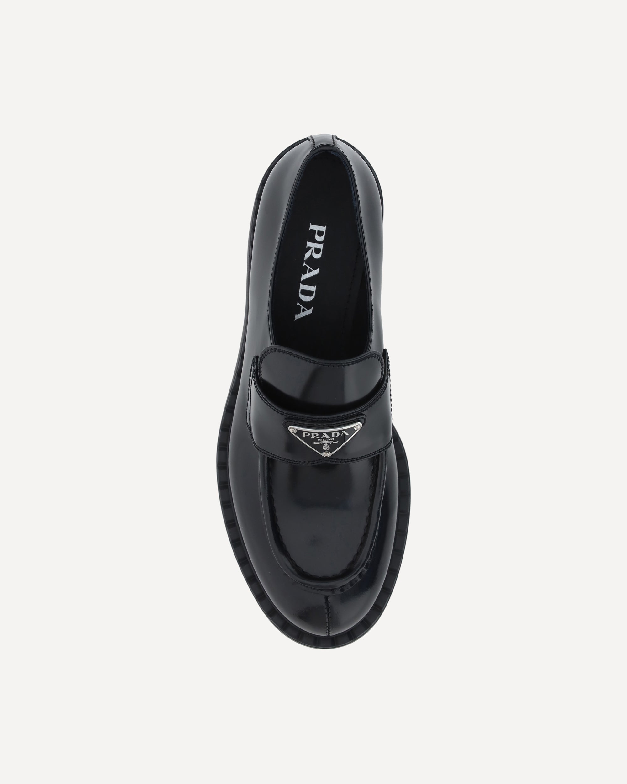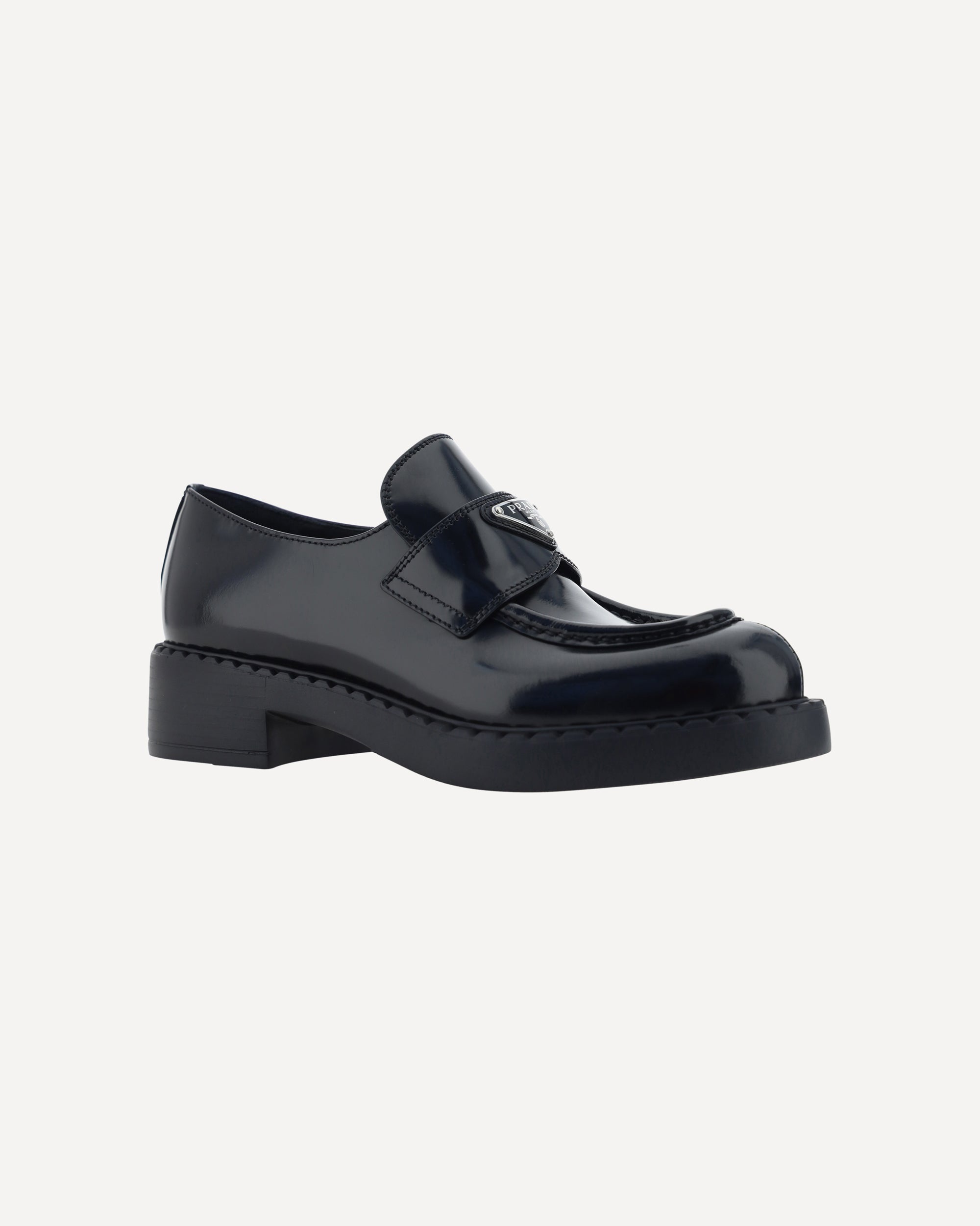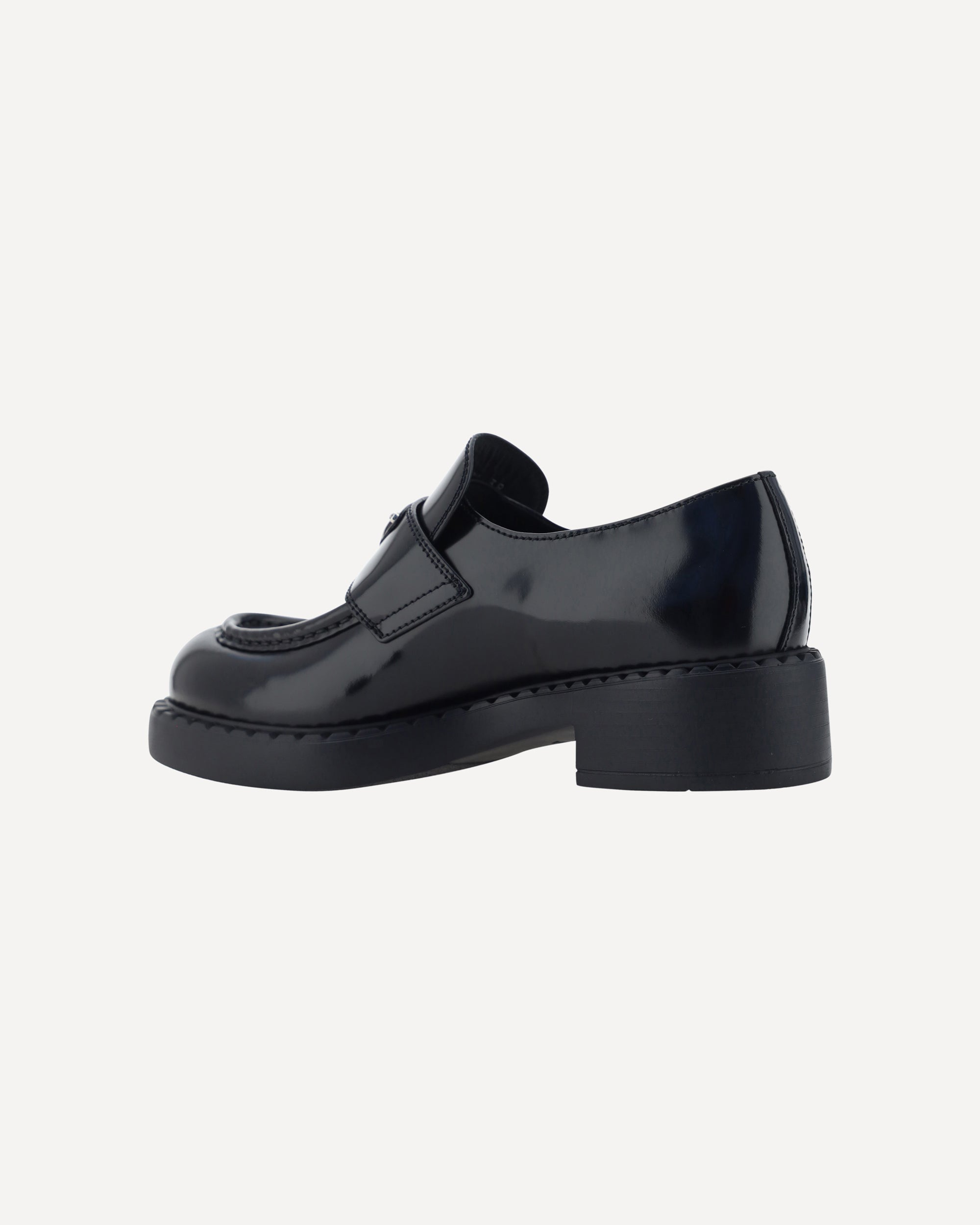 Calfskin Loafers by Prada, patent-effect leather design, leather block heel, iconic glazed triangular plaque with brand signature applied on front.