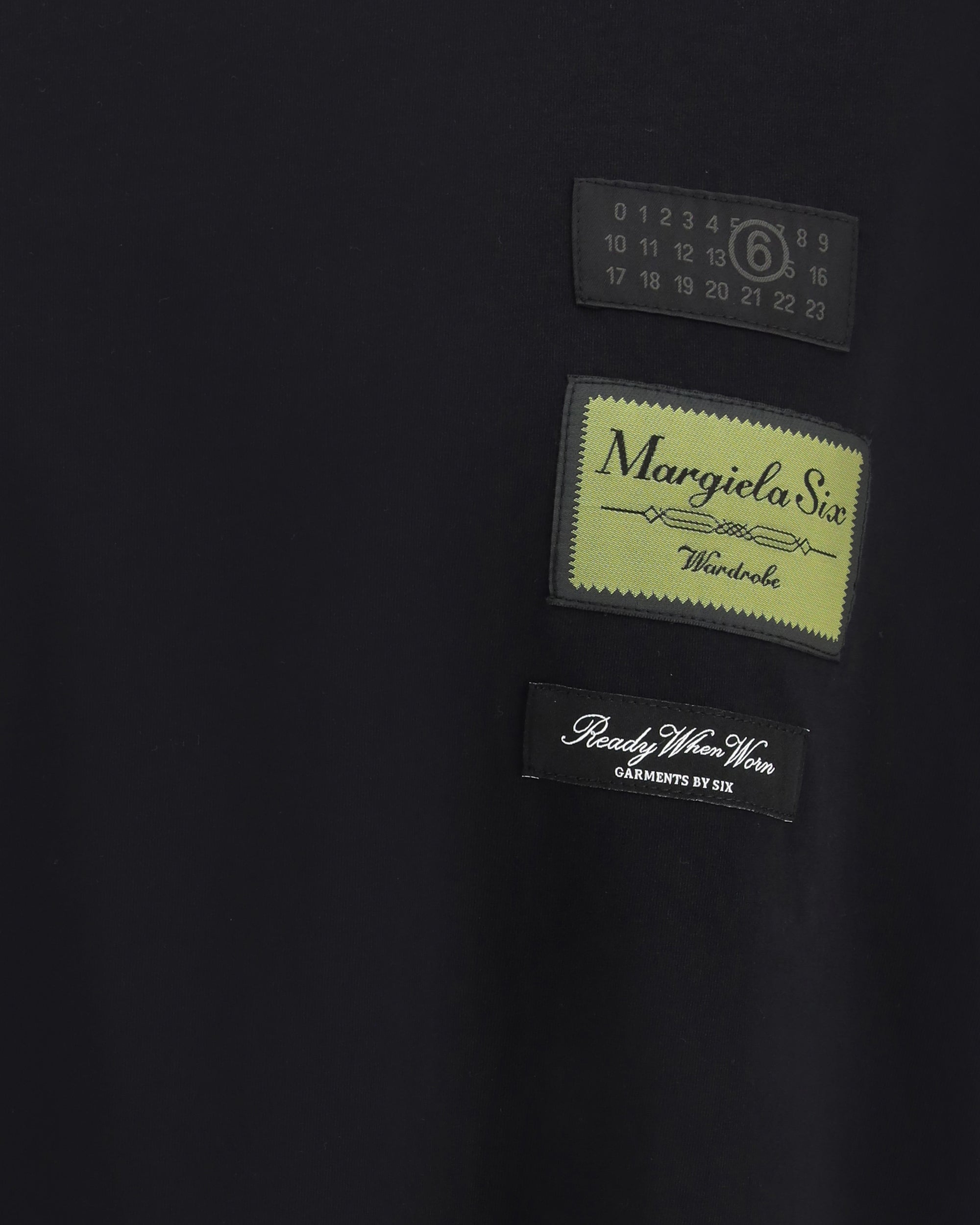 The Long-sleeve T-shirt by MM6 crafted from soft cotton jersey, featuring jacquard label patches on the chest that elevate a functional detail into a refined design element. The clean silhouette is enriched by the round neckline, streamlined long sleeves, and the Maison’s iconic four white stitches on the back, adding a subtle signature touch.