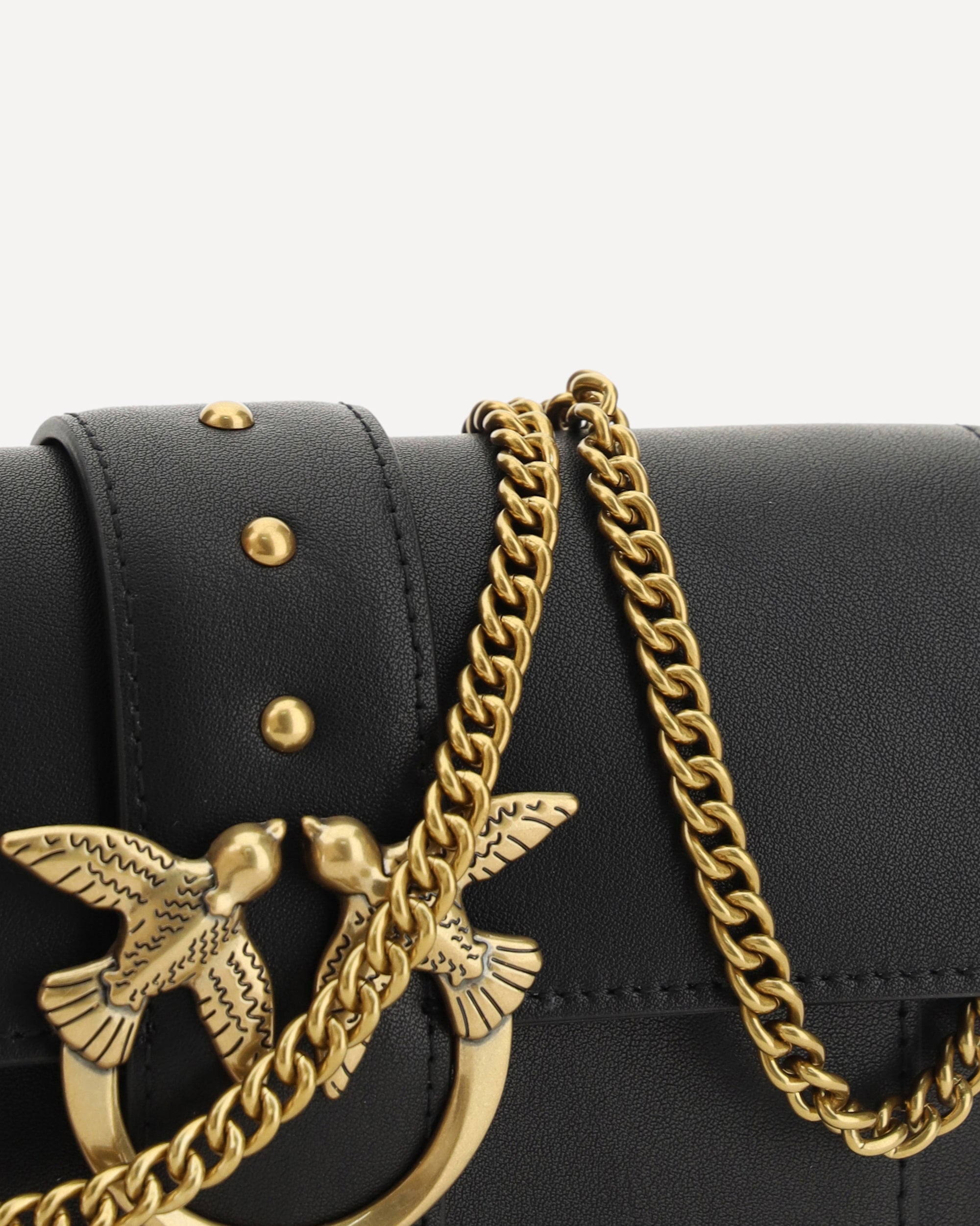The Calfskin Love One Shoulder Bag by Pinko, interlocking front fastening, adjustable and sliding chain shoulder strap, iconic Love Birds buckle embossed on the front, double internal compartment, internal zipped pocket, flat card pocket, iconic tone-on-tone embroidered brand monogram on the back.