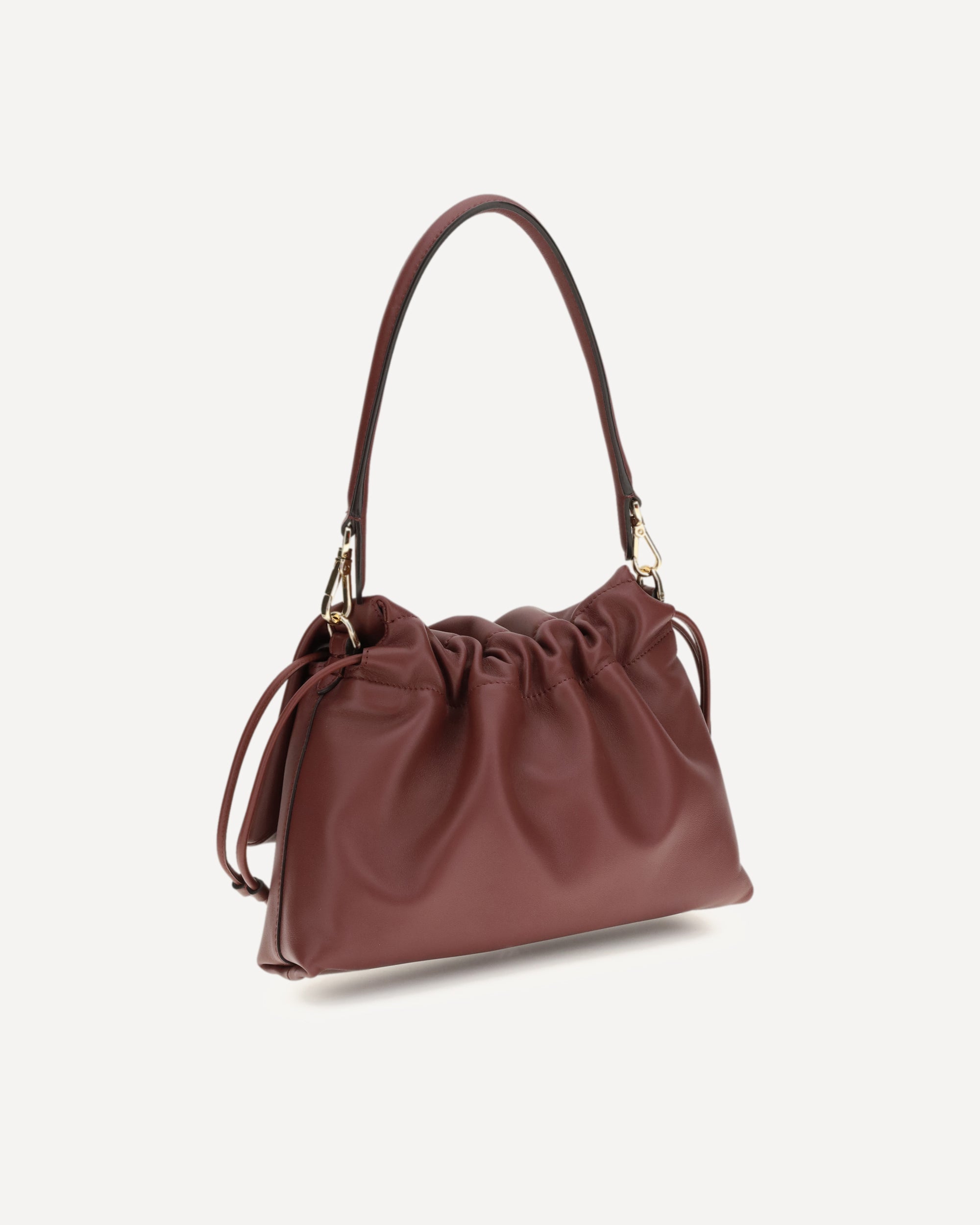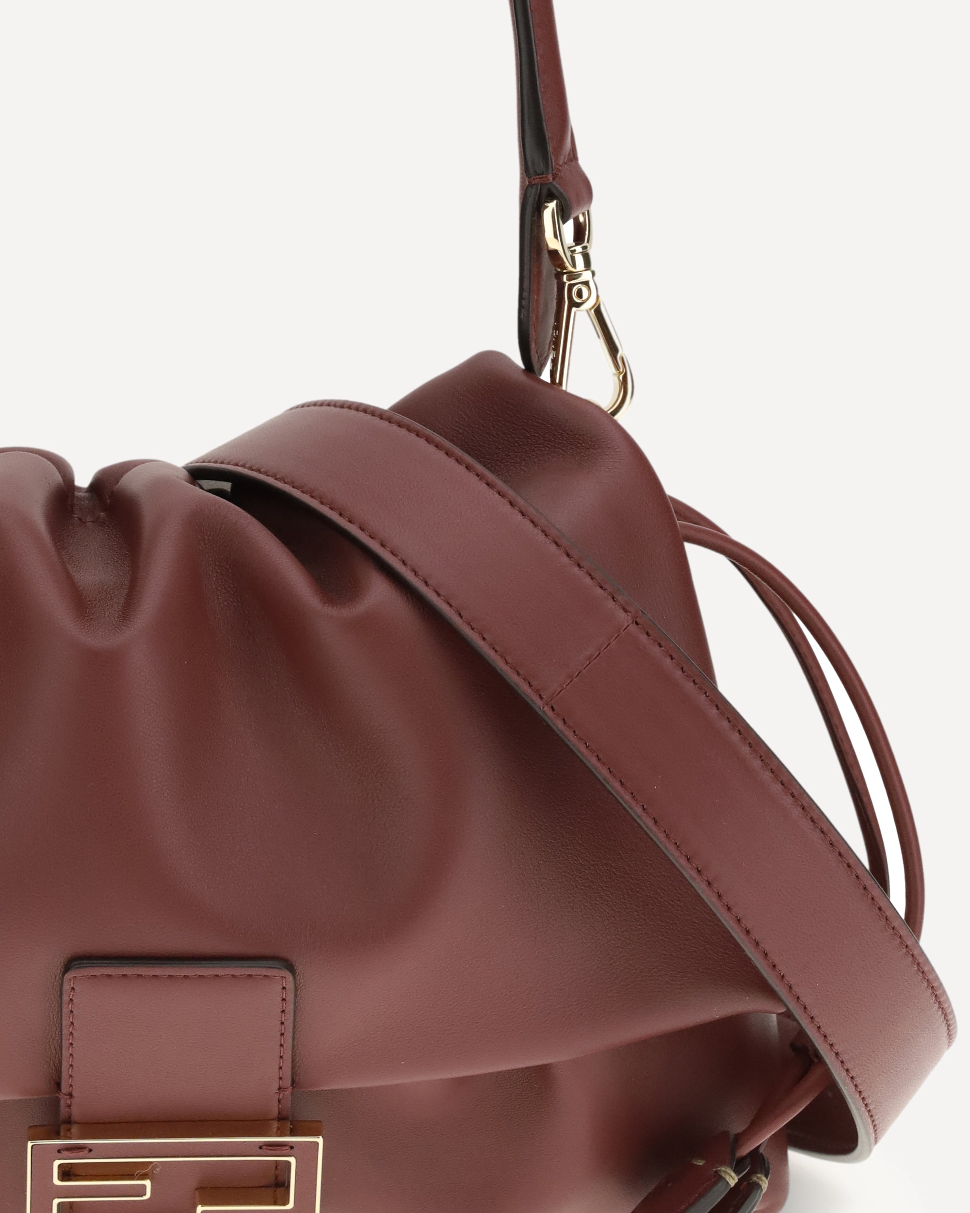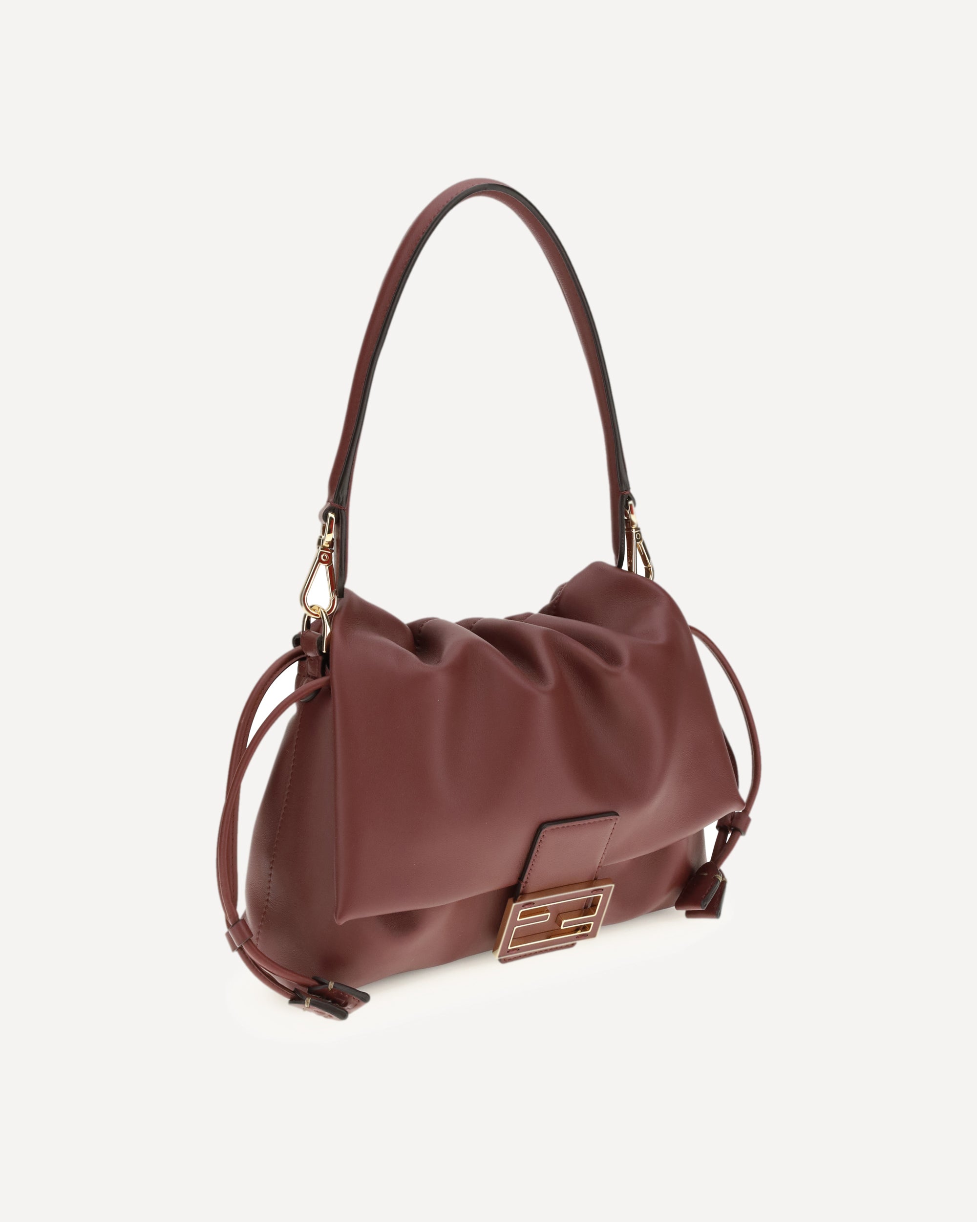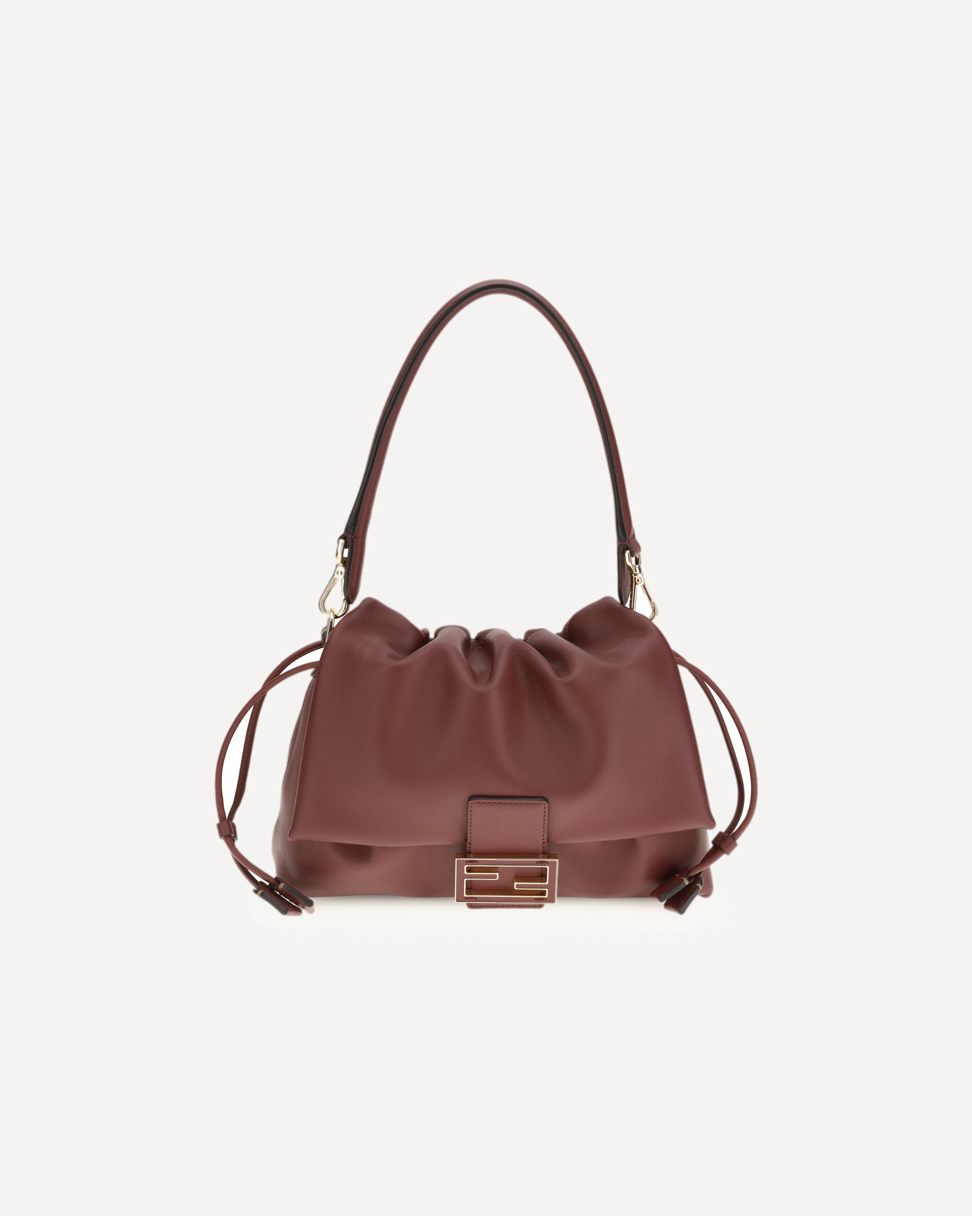 The Mamma Baguette Shoulder Bag by Fendi is a style icon reimagined with contemporary elegance. Crafted with a decorative FF closure and tone-on-tone leather insert, it features a large suede-lined interior compartment enhanced by a drawstring closure with cream leather laces and custom details. Featuring a front flap with magnetic closure, it offers versatility with a handle and shoulder strap, both removable, to suit different occasions and styles.