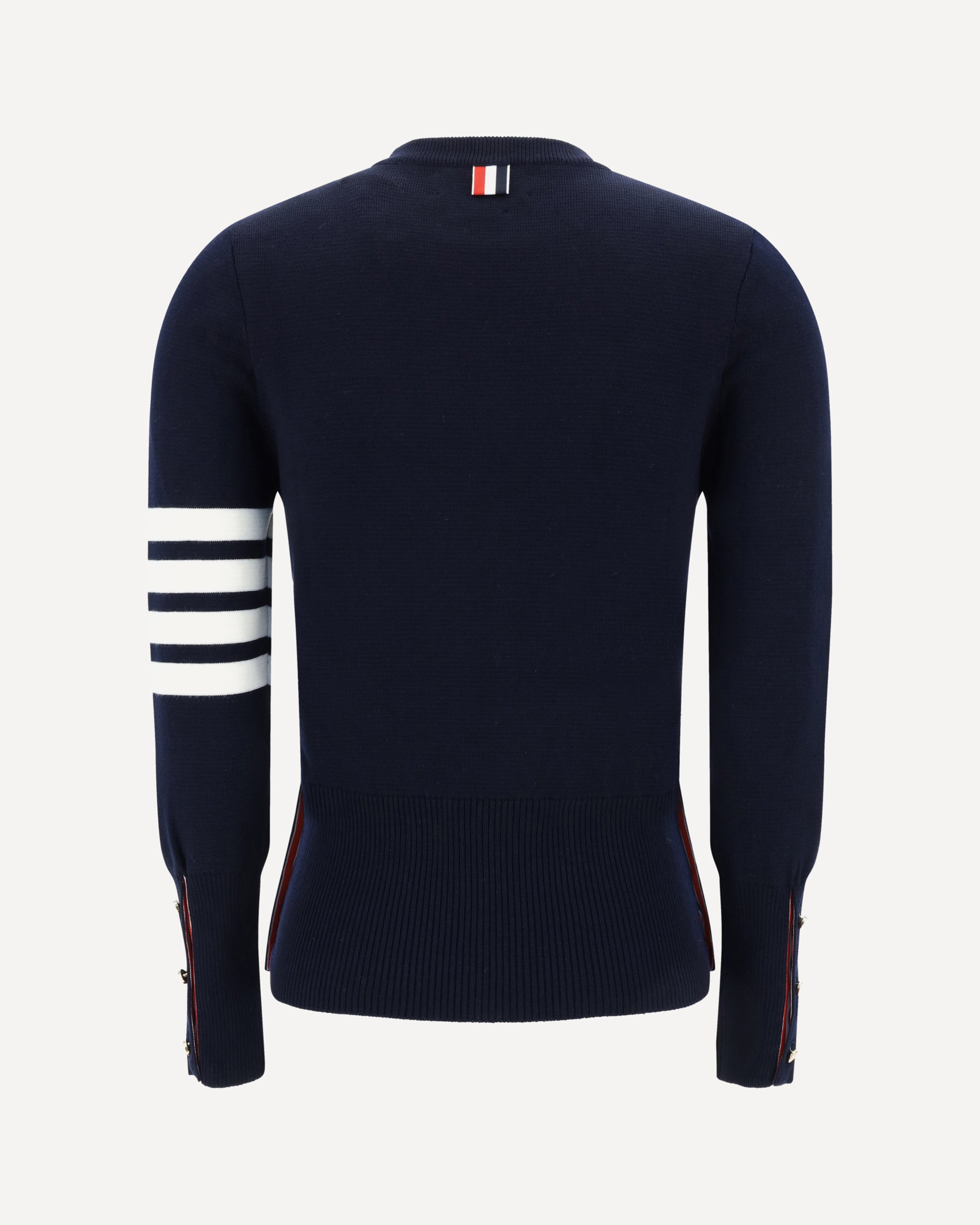 Thom Browne's virgin wool Sweater is an iconic piece with a clean yet richly tailored design. A classic crew neck combines with a ribbed high hem, featuring practical side buttons that allow you to adjust the slits with discretion and functionality. The cuffs, also ribbed and button-fastened, add a touch of structured elegance. Distinguishing the sweater are the brand's iconic horizontal bands, positioned on the left arm, which lend instant recognition and a graphic accent typical of the Thom Browne style.