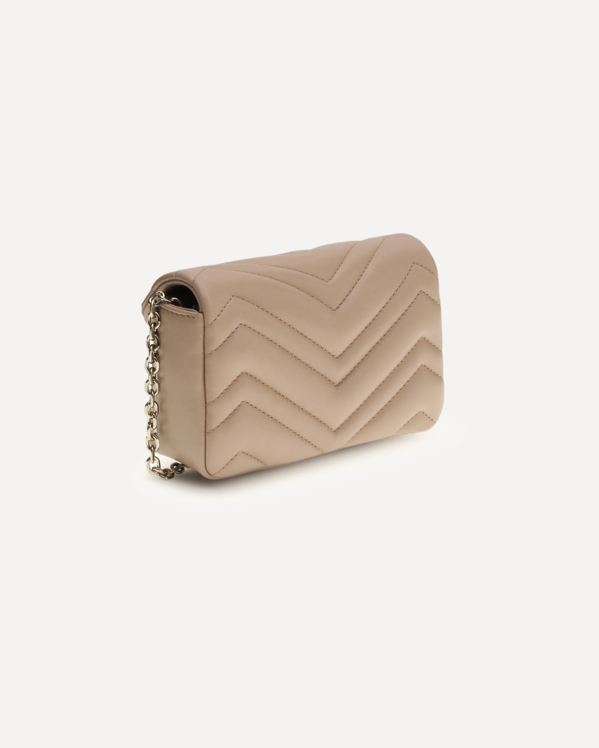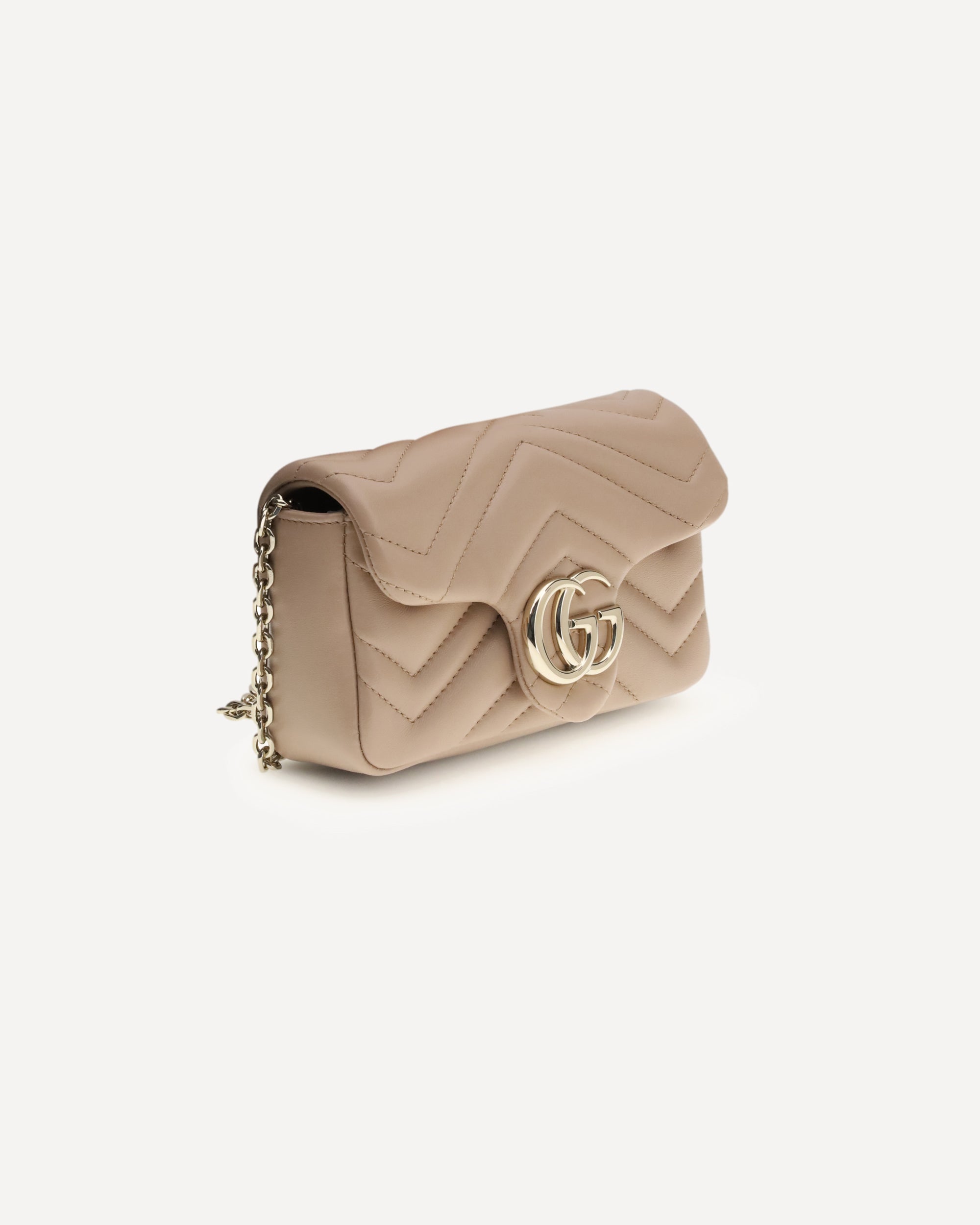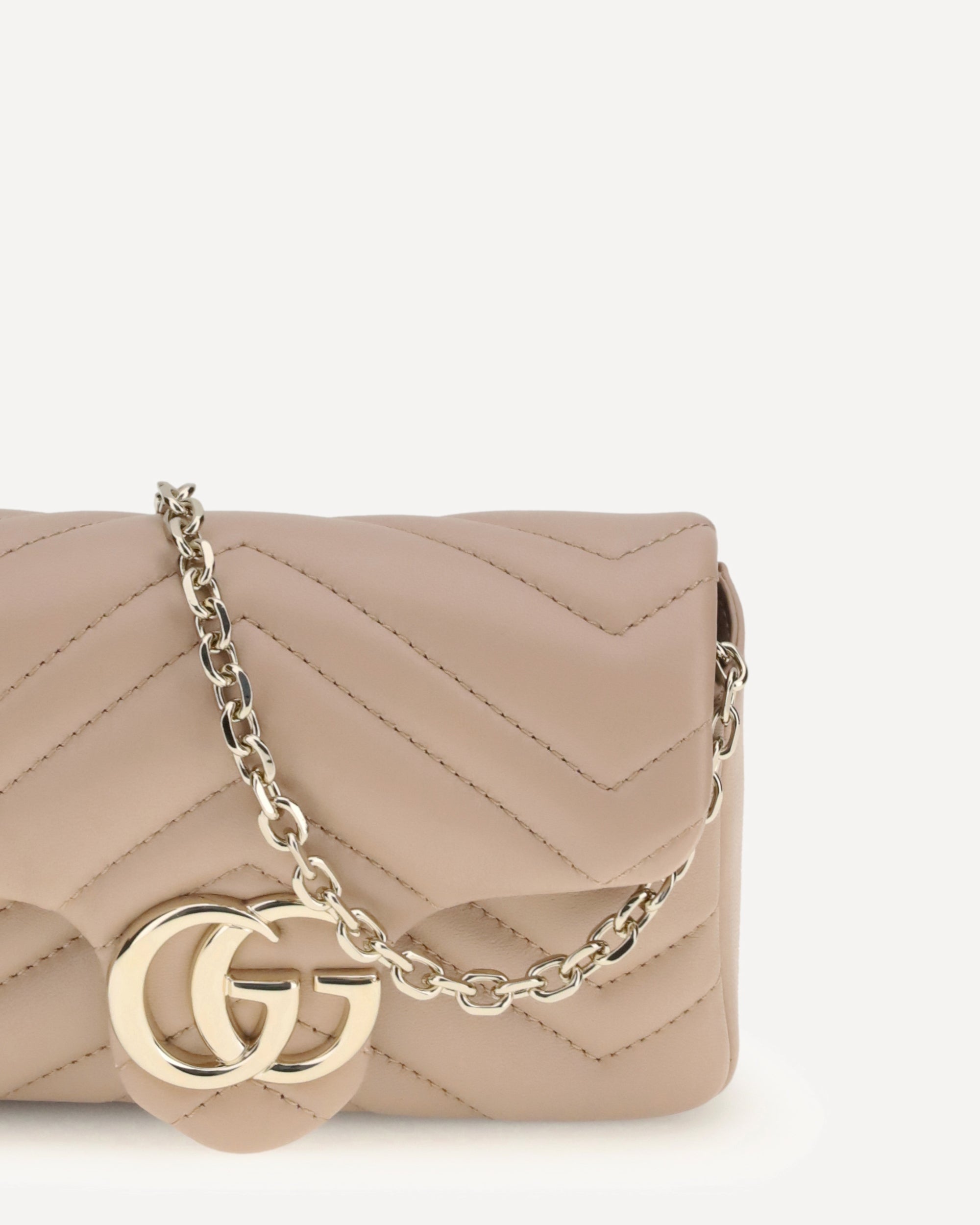 The GG Marmont mini shoulder Bag by Gucci is one of the brand’s most iconic designs, distinguished by its metal Double G emblem, faceted chain shoulder strap, and exceptionally soft leather construction. Crafted from matelassé lambskin with a chevron pattern, it features refined metal accents and a practical magnetic snap closure. Compact yet sophisticated, it blends archival charm with modern functionality, making it the ideal accessory to elevate any outfit.