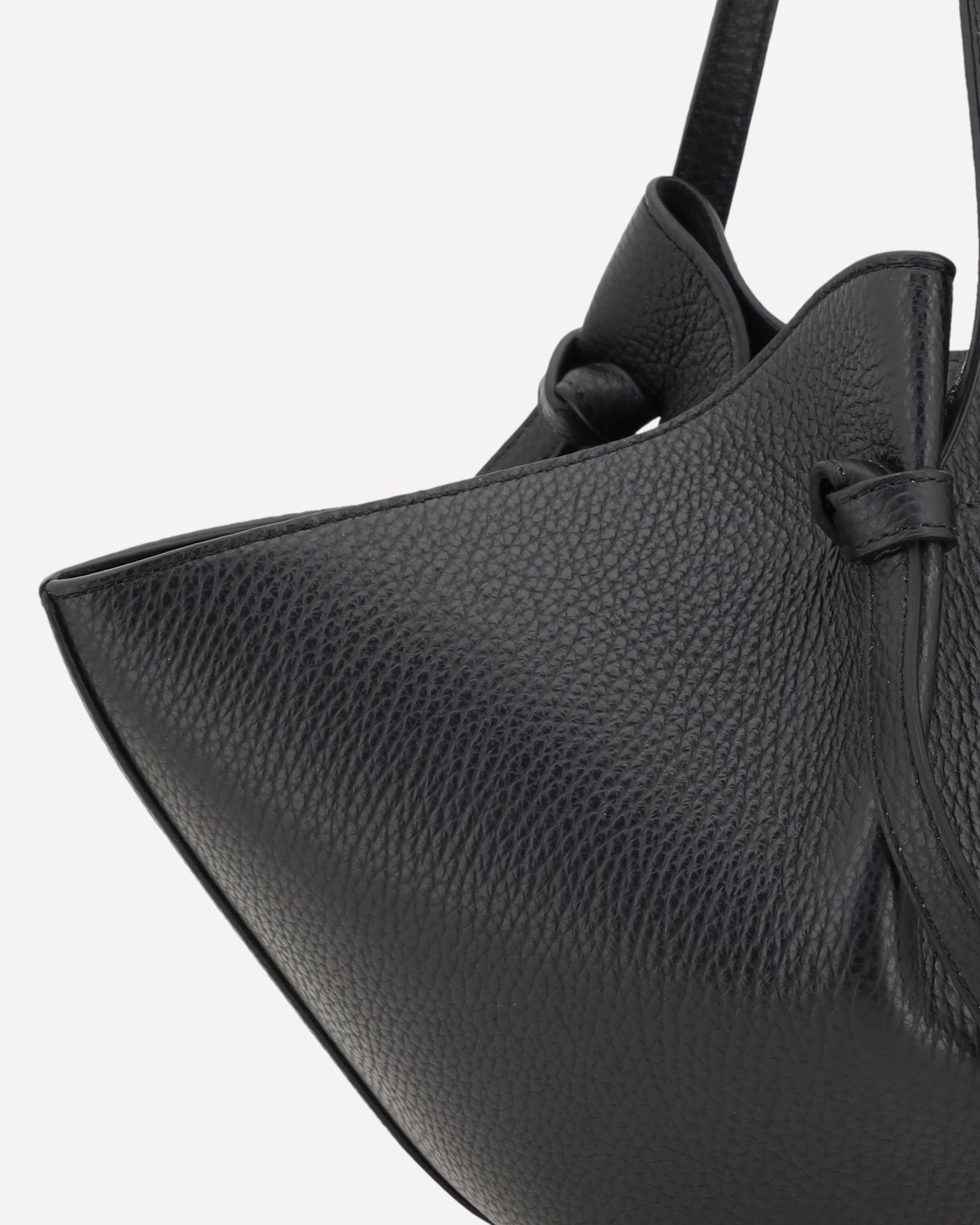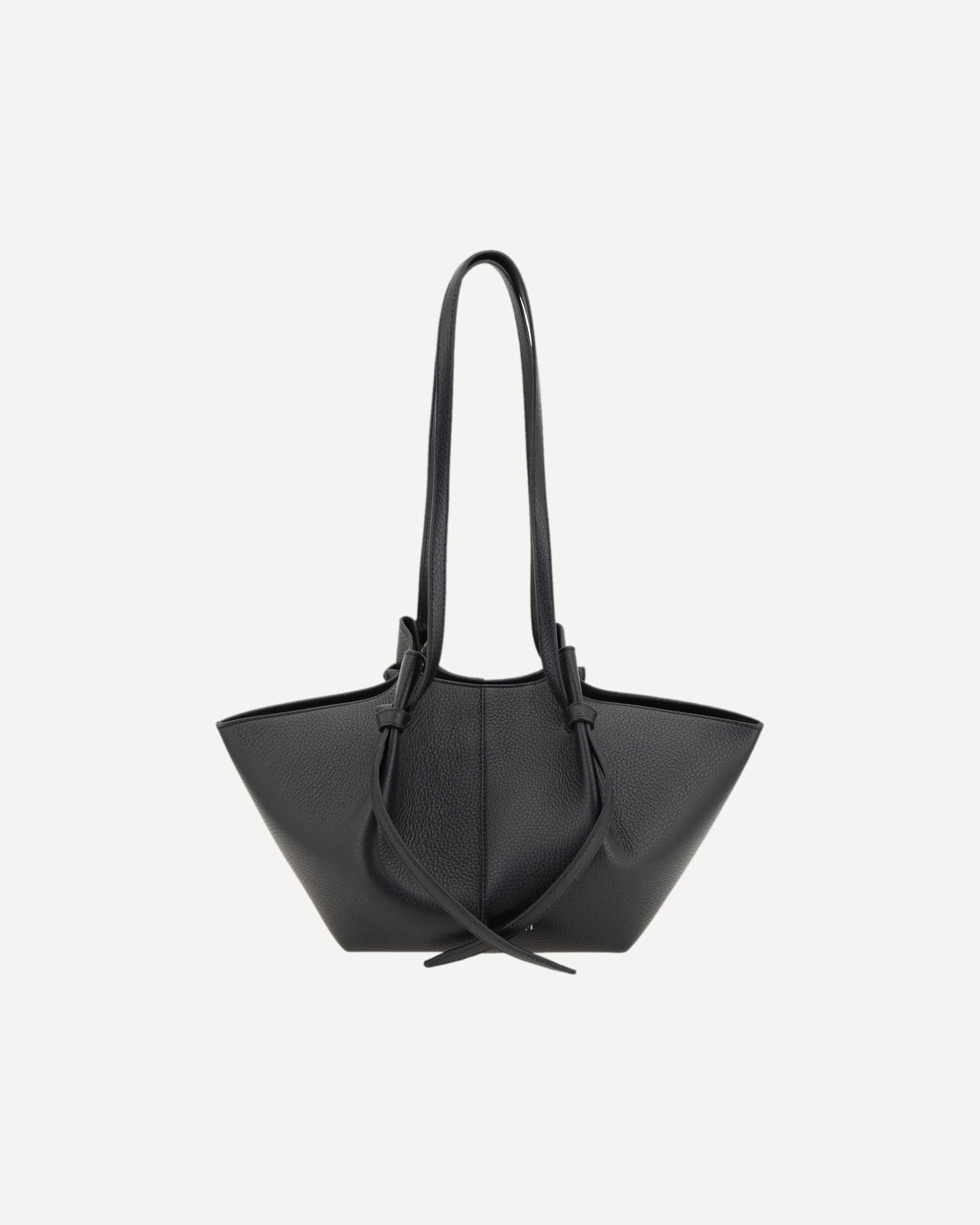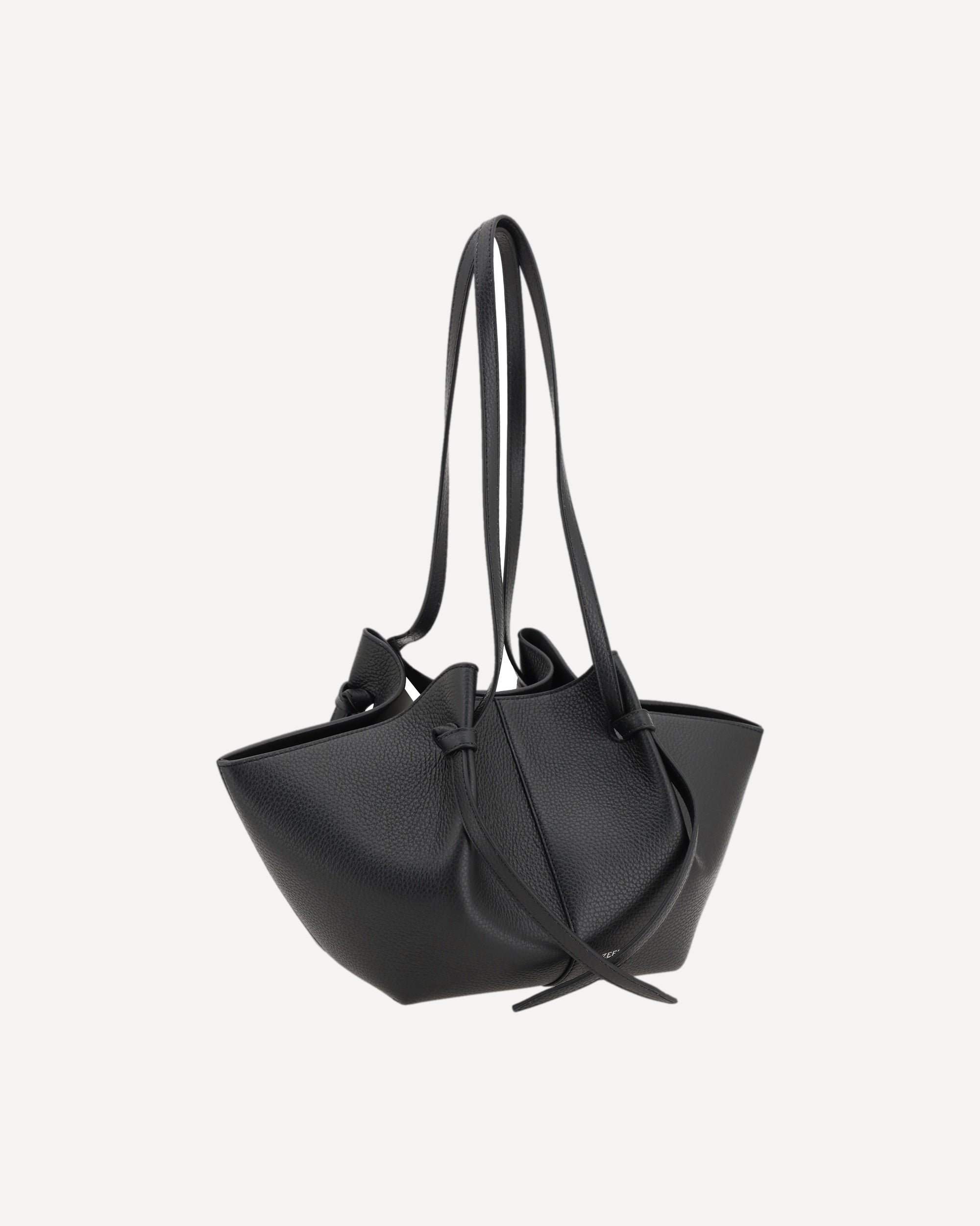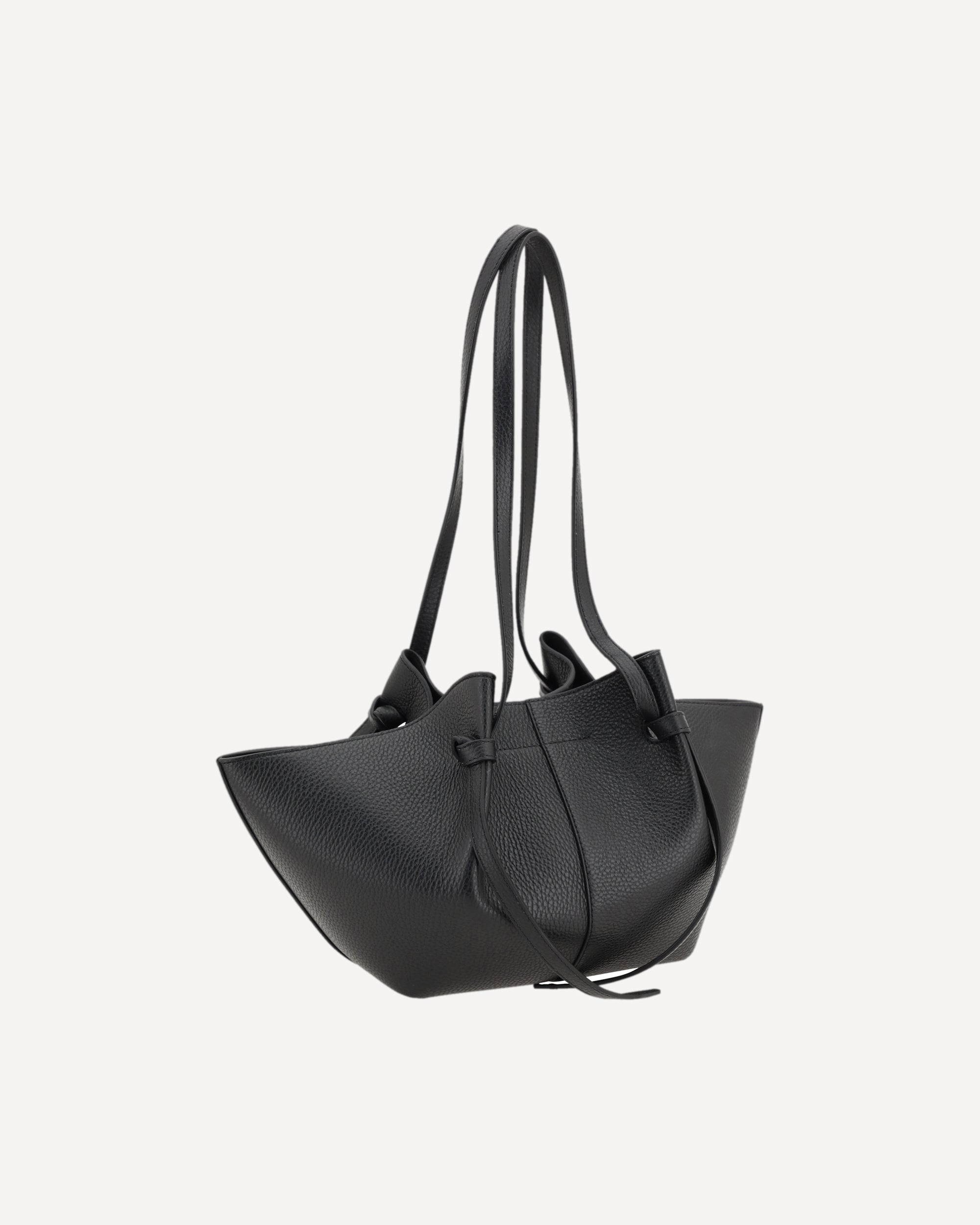 The Mochi leather Shoulder Bag by Yuzefi features a stylish leather design with a magnetic button top closure. Double flat handles ensure practicality, while the interior, with a single compartment, offers ample space. The brand's iconic signature is contrastingly printed on the front. The soft, fold-over geometric design adds a touch of modernity and versatility to this refined accessory.