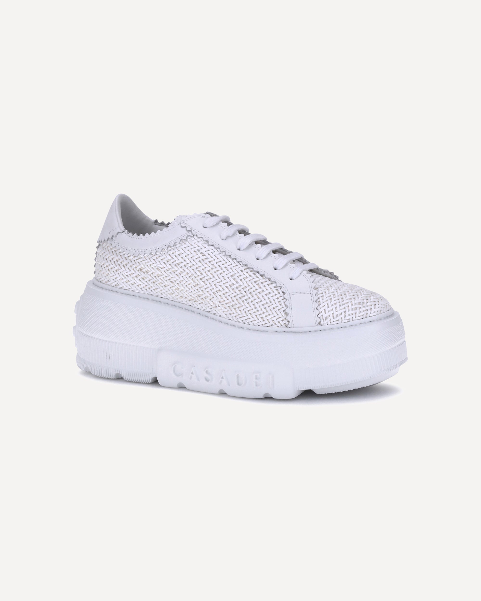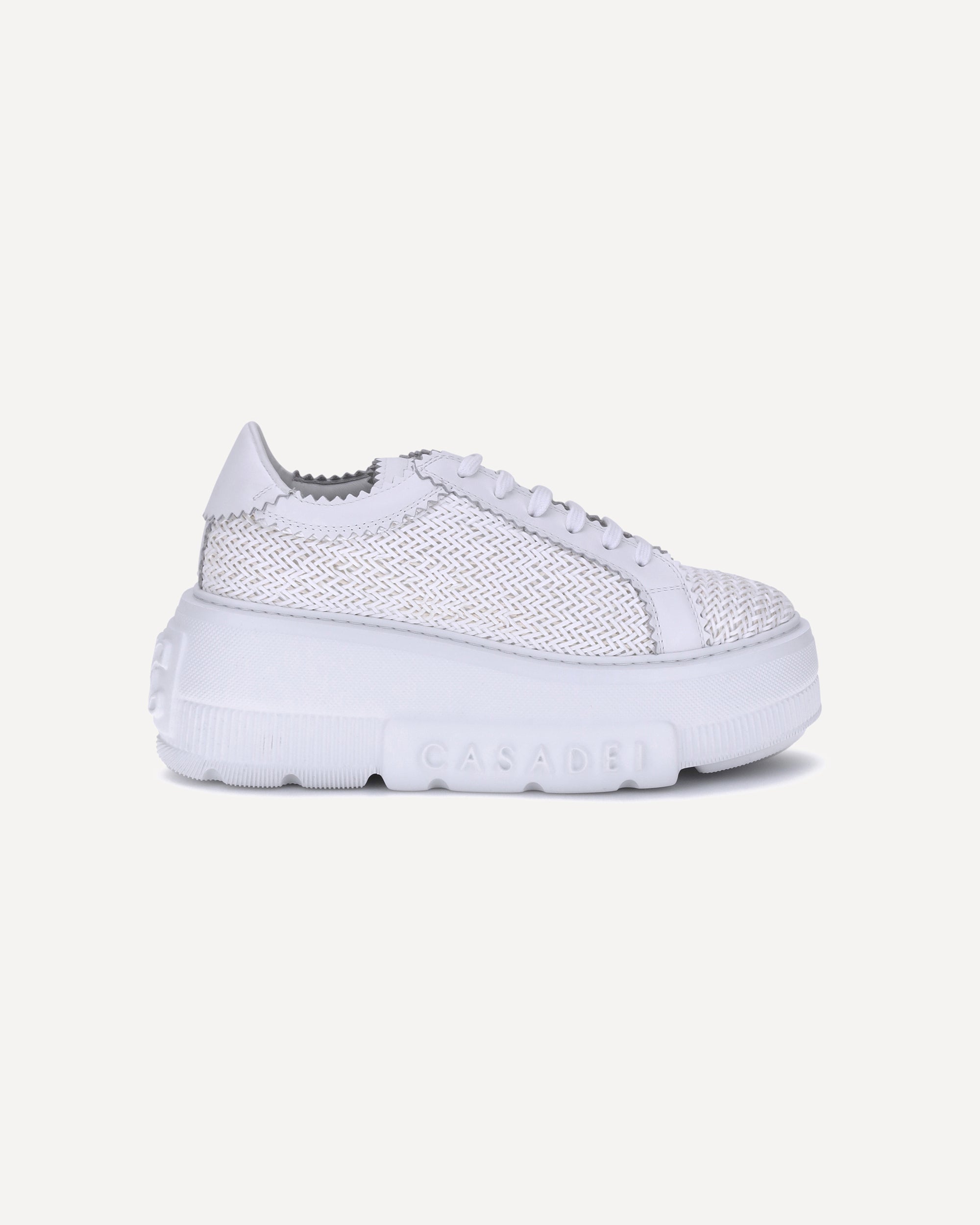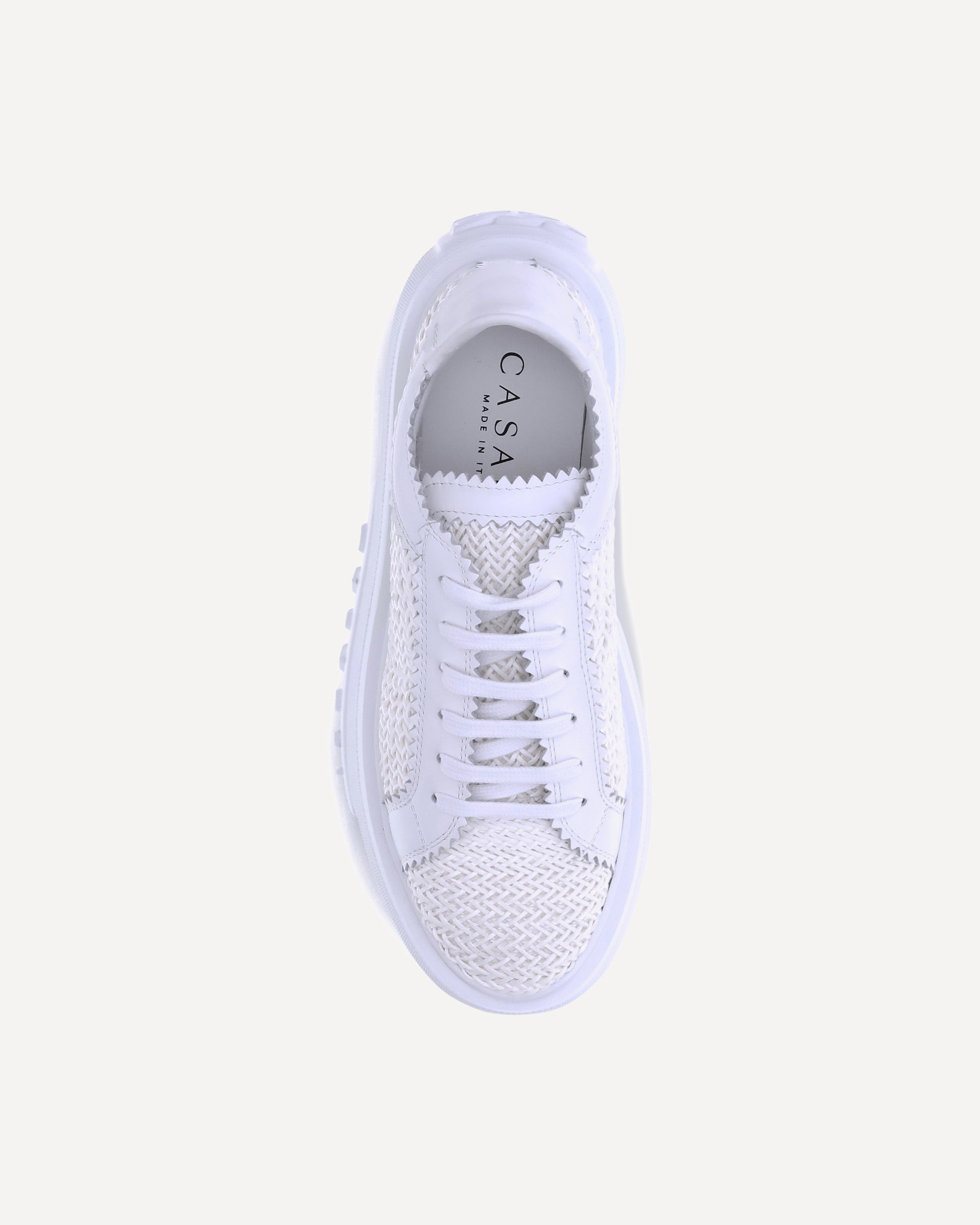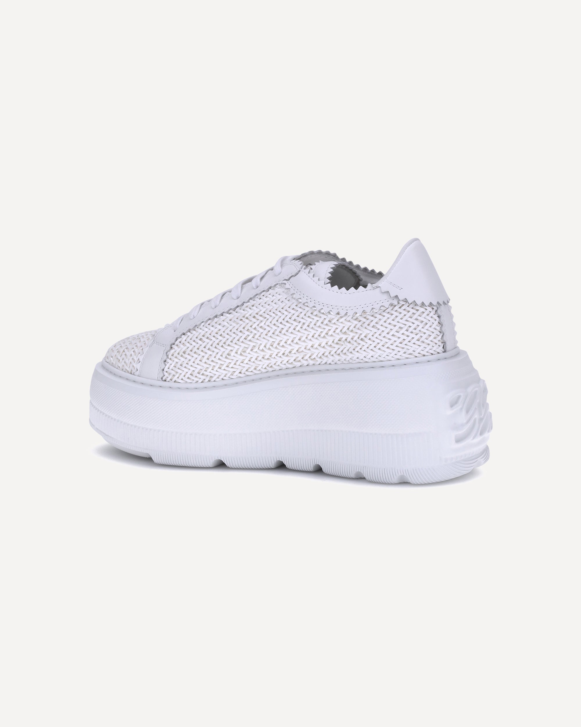 Casadei's vegan leather Nexus Sneakers combine style and sustainability. They feature a round toe and a lace-up front closure for a comfortable fit. The textured rubber sole, embossed with the brand's monogram, adds a distinctive touch, while the all-over repeated mesh design offers a modern and dynamic effect. A stylish and functional model, perfect for a casual-chic and environmentally conscious look.
