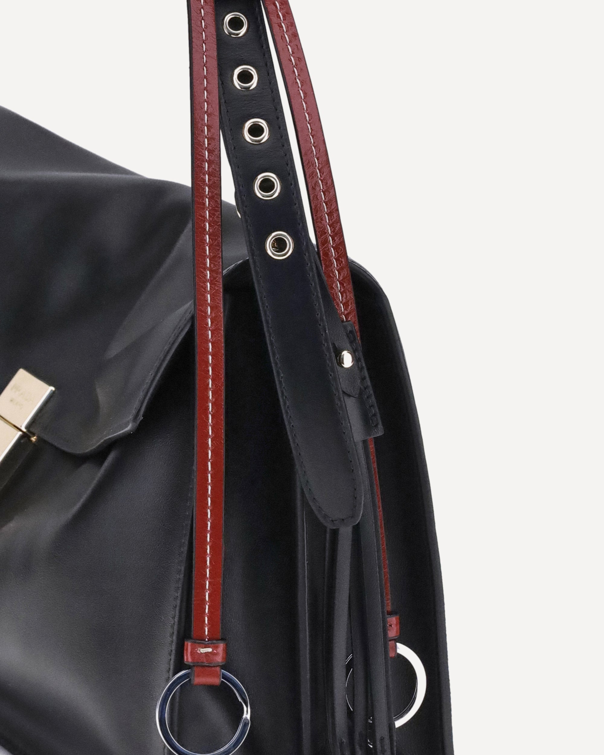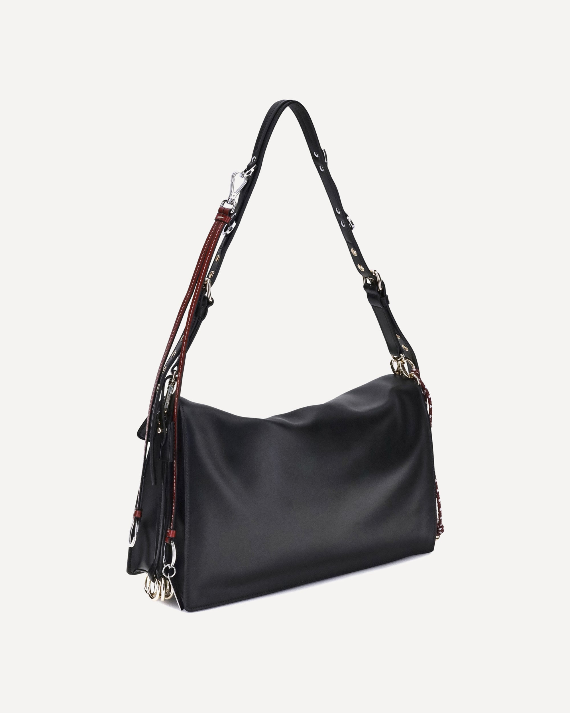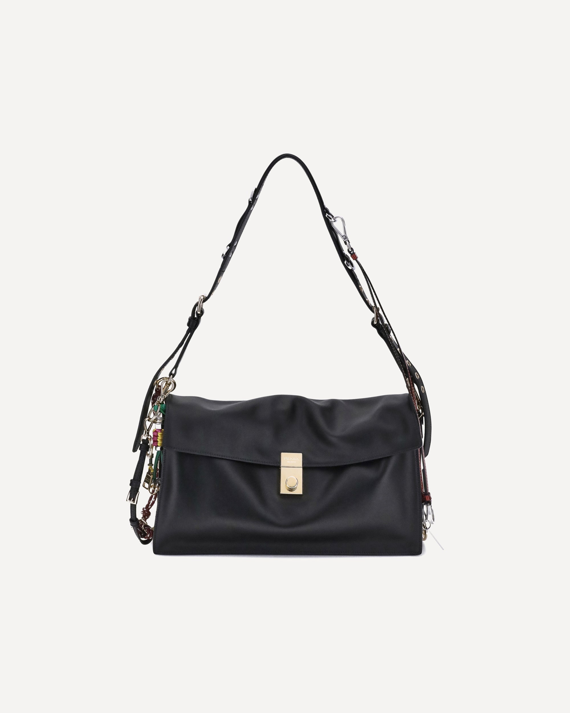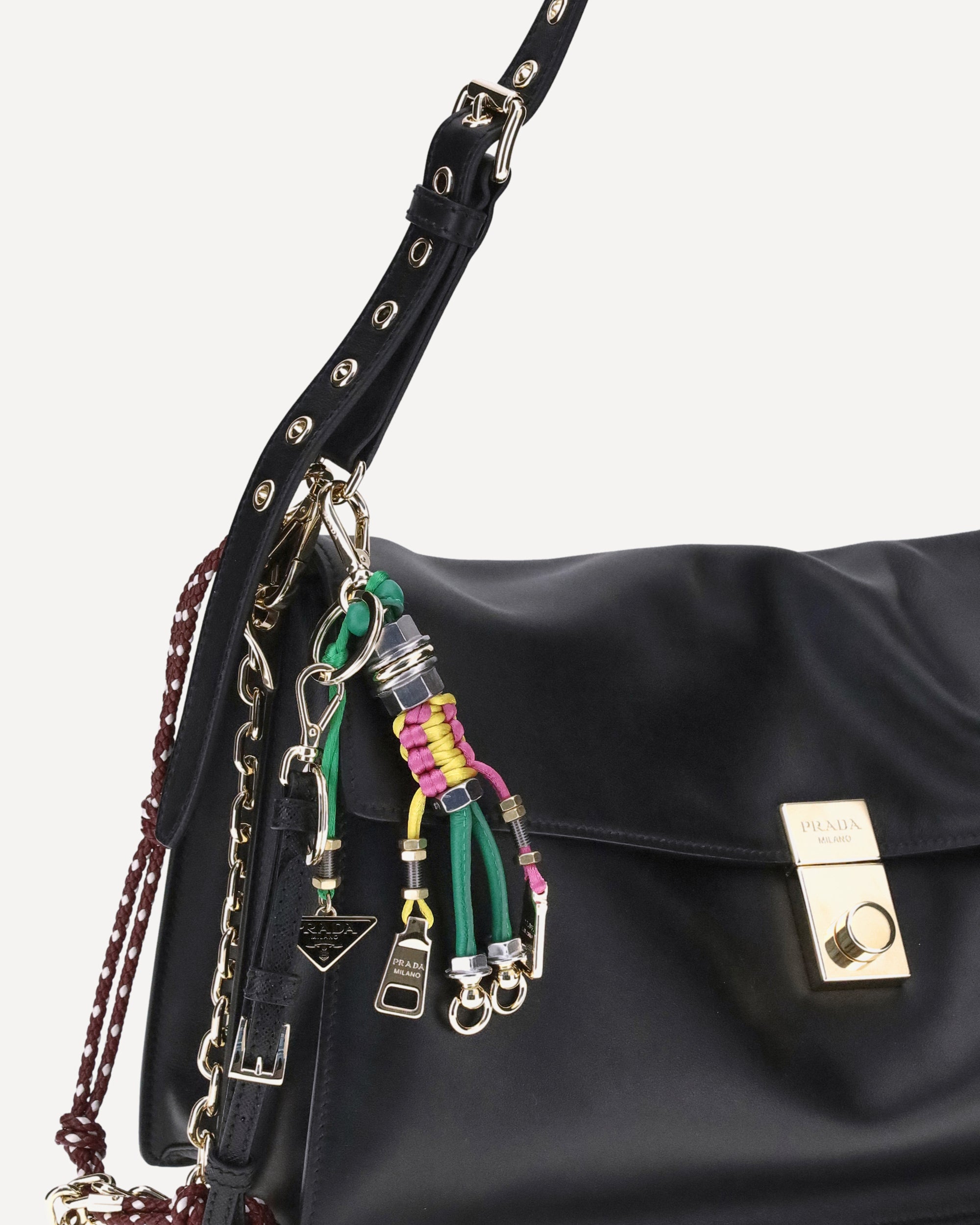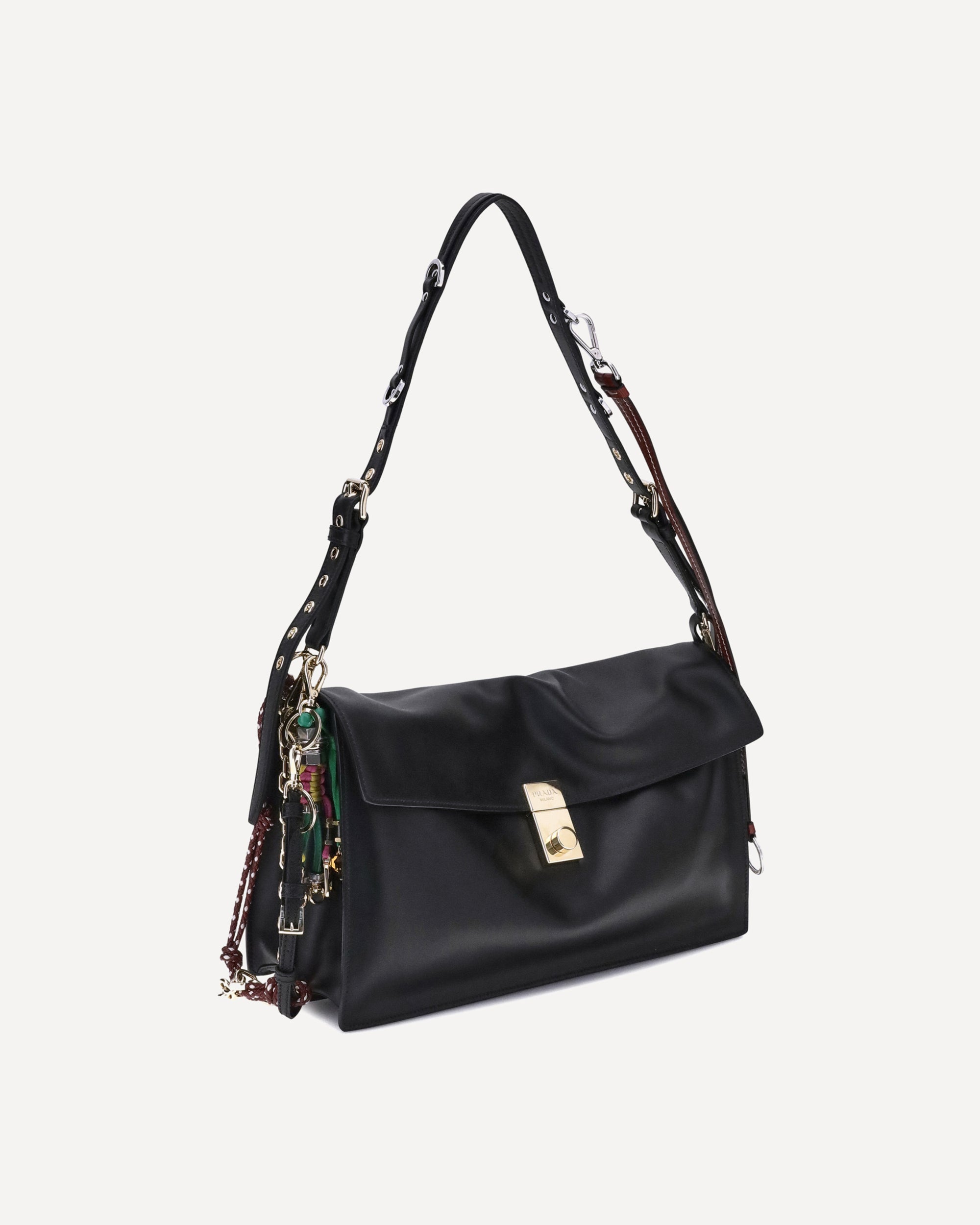 The large Soft Sound Shoulder Bag by Prada combines soft lines and refined details in a compact and functional design. Made of lightly grained leather, it is embellished with a metallic logo detail on the front and removable accessories that enrich the shoulder strap. The adjustable and removable tonal leather shoulder strap allows for versatile portability. The interlocking closure protects a lined interior, organized with two compartments, a zippered pocket and a patch pocket. An elegant accessory, ideal to accompany everyday life in style.