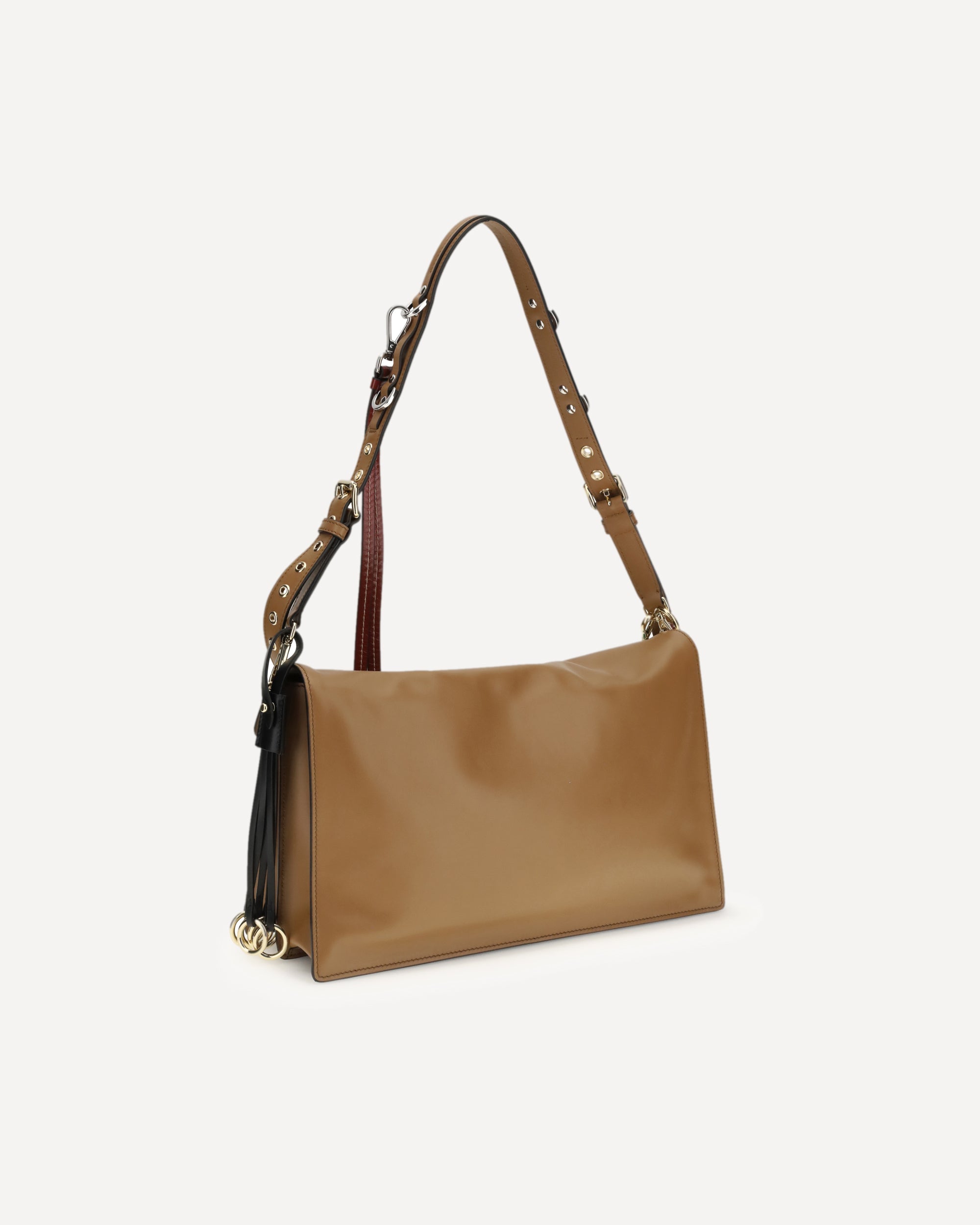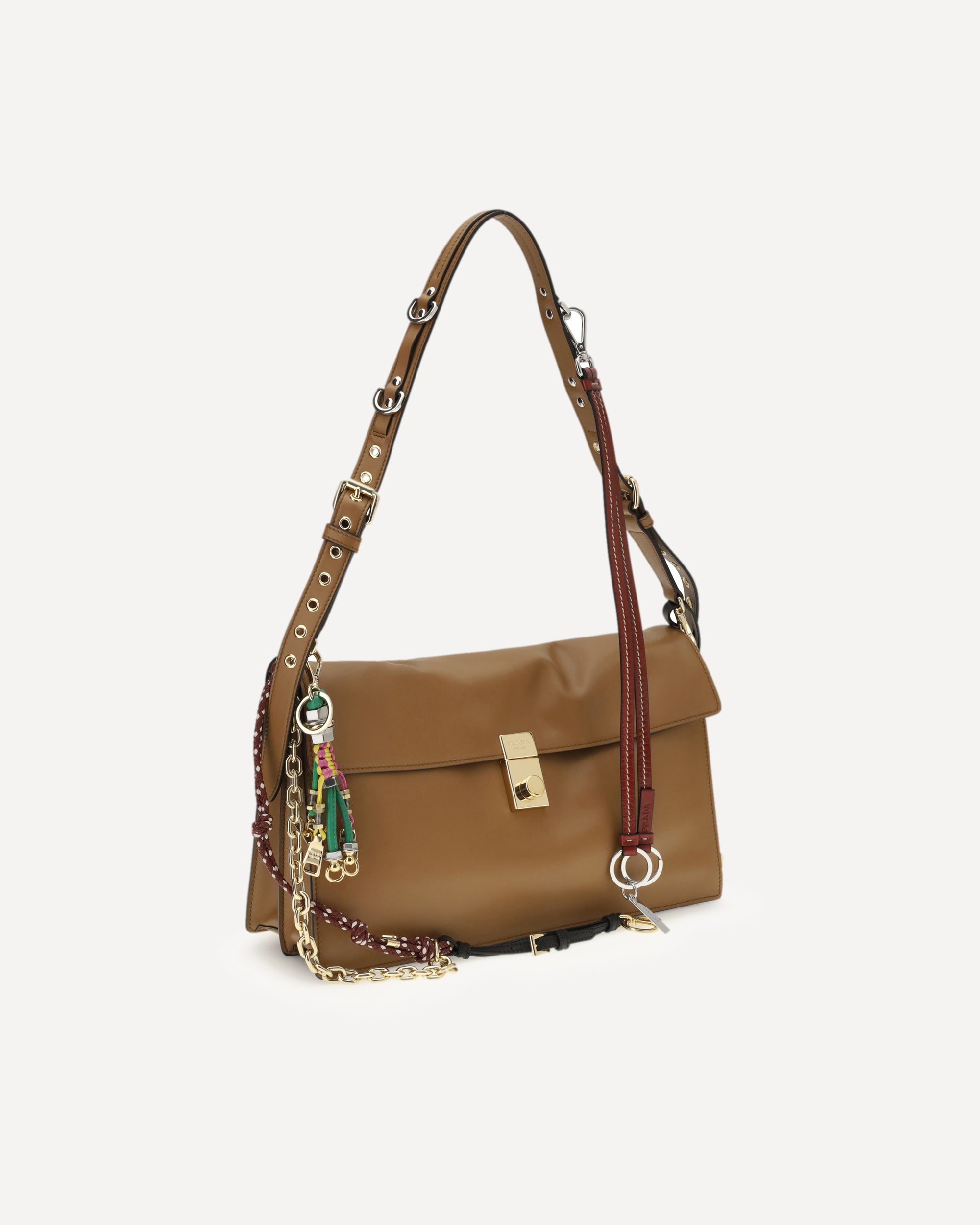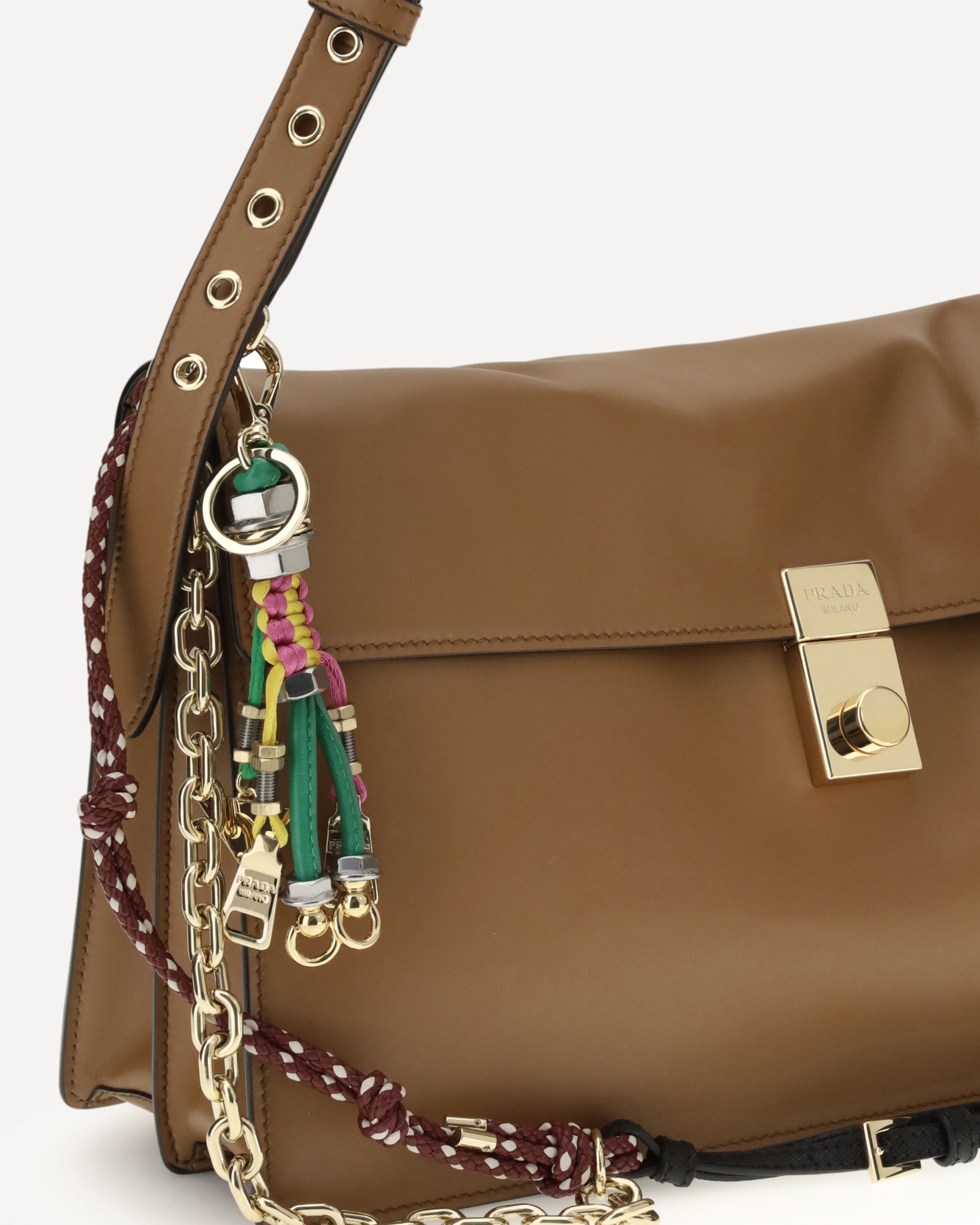 The large Soft Sound Shoulder Bag by Prada combines soft lines and refined details in a compact and functional design. Made of lightly grained leather, it is embellished with a metallic logo detail on the front and removable accessories that enrich the shoulder strap. The adjustable and removable tonal leather shoulder strap allows for versatile portability. The interlocking closure protects a lined interior, organized with two compartments, a zippered pocket and a patch pocket. An elegant accessory, ideal to accompany everyday life in style.