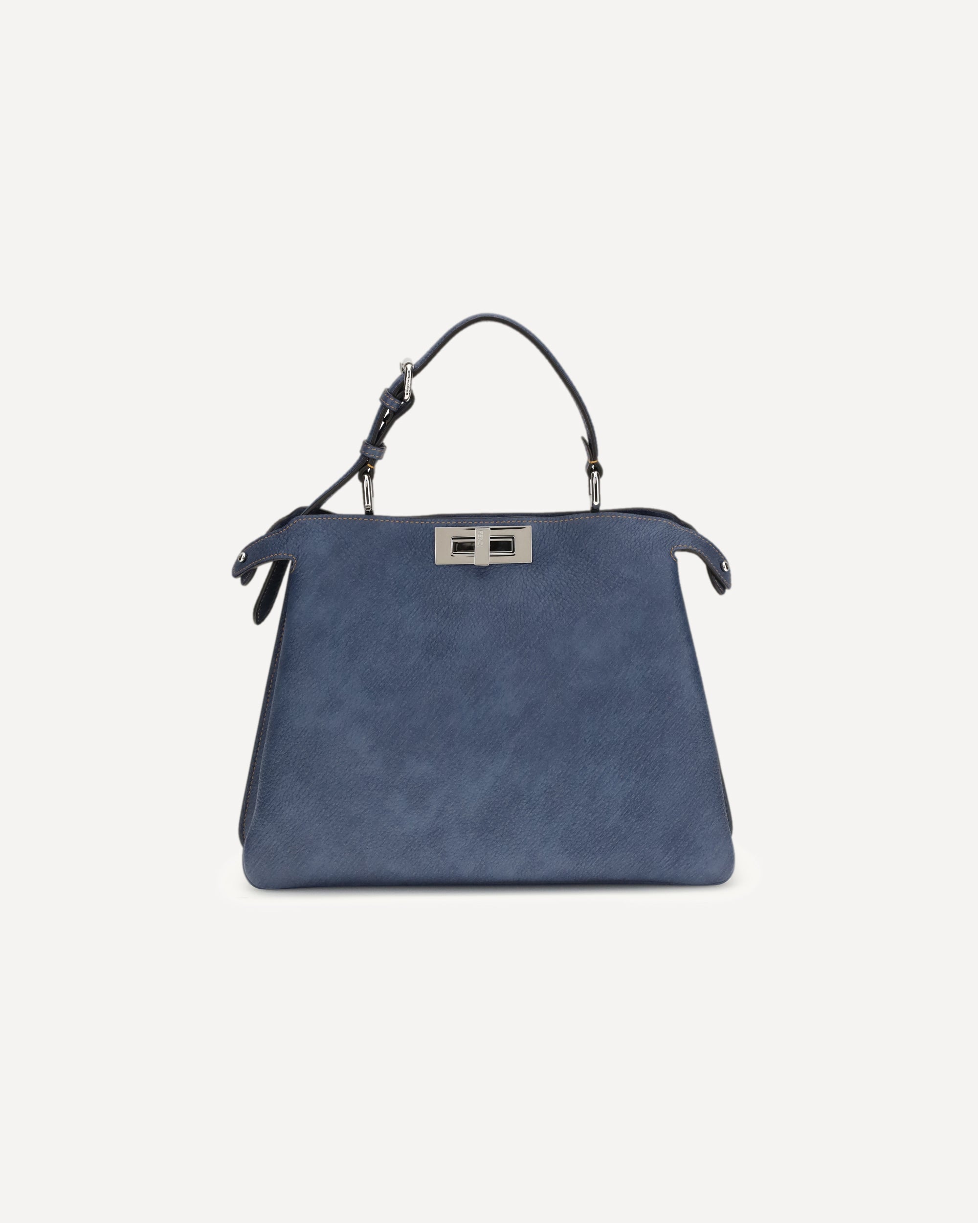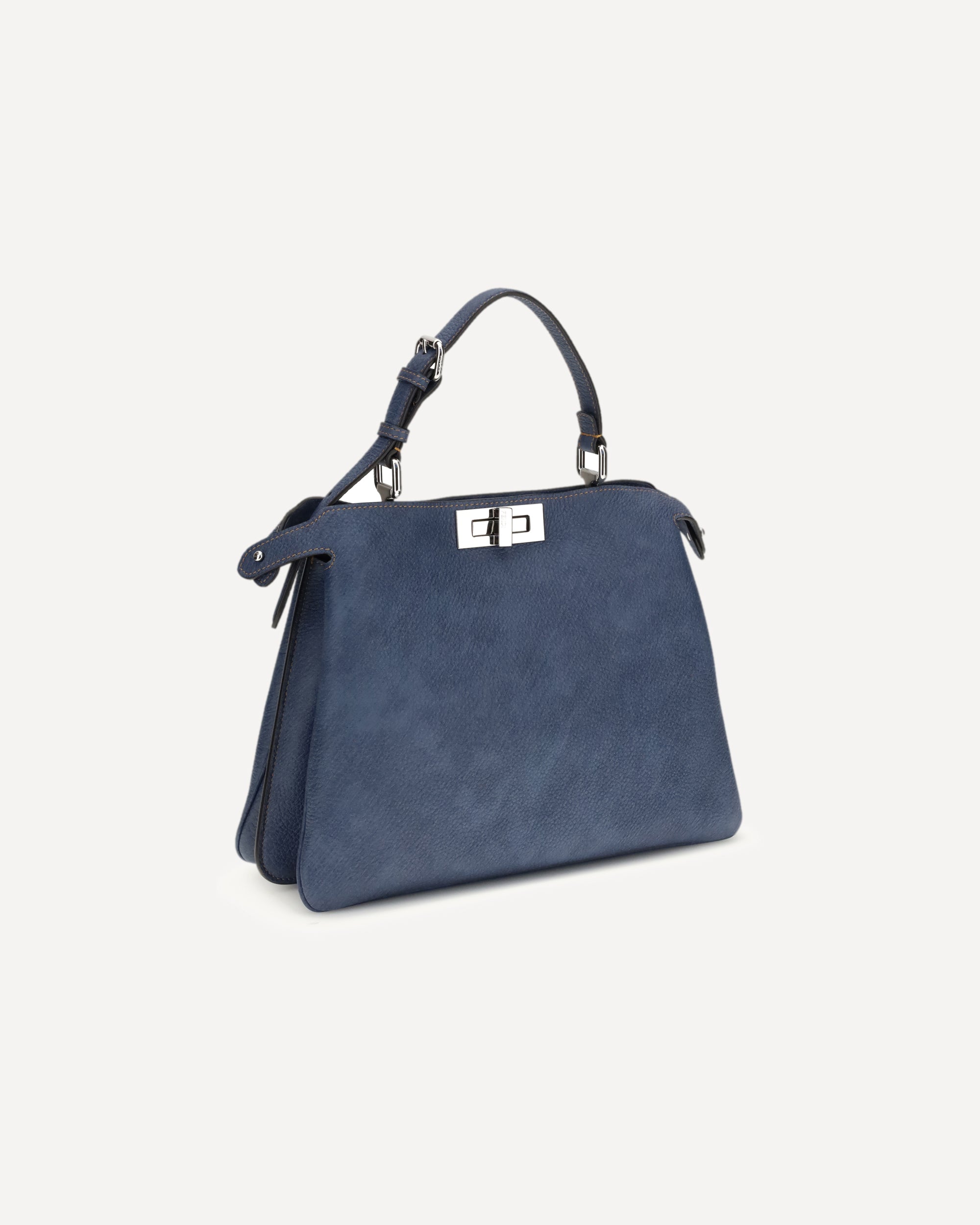 The Peekaboo soft medium Handbag by Fendi is made of Cuoio Romano, a calfskin leather with a distinctive natural grain. The suede-lined interior is divided into two compartments by a rigid partition and includes a leather pocket with palladium-colored logo. The structure is made lighter by the leather-covered aluminum bar, while the iconic swivel clasp on either side signs the design. The adjustable handle allows it to be carried either by hand or on the shoulder, combining elegance and practicality.