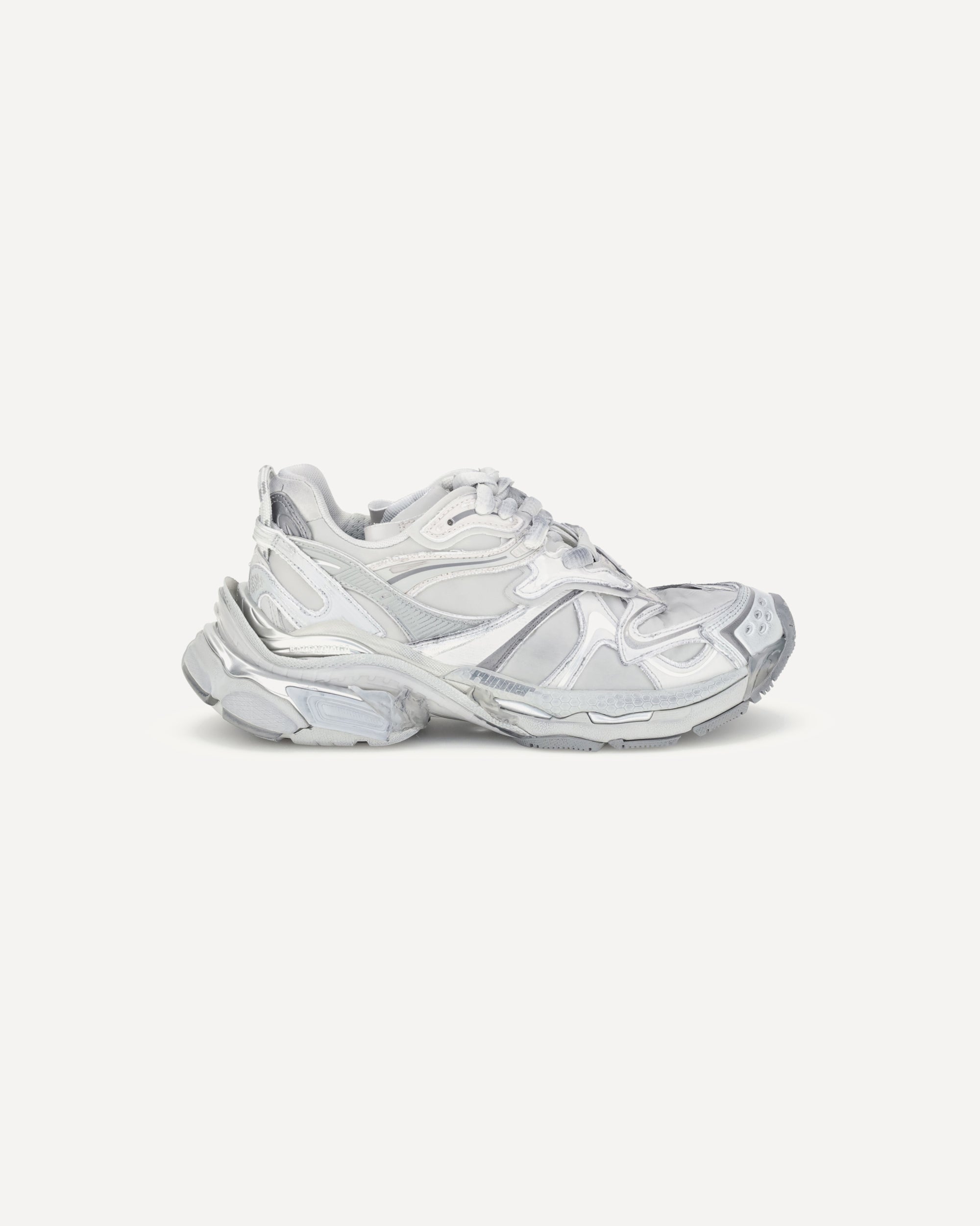 Balenciaga's Runner 2.0 Sneakers stand out for their worn-in effect, recalling a grunge and lived-in aesthetic typical of the brand. They feature the size printed on the toe and embossed on the back, along with the "Runner" logo printed on the outer side. The design is completed by the Balenciaga logo imprinted on the tongue, on the back of the heel, and a back loop that facilitates the fit. A bold model that blends sporty style and urban spirit.
