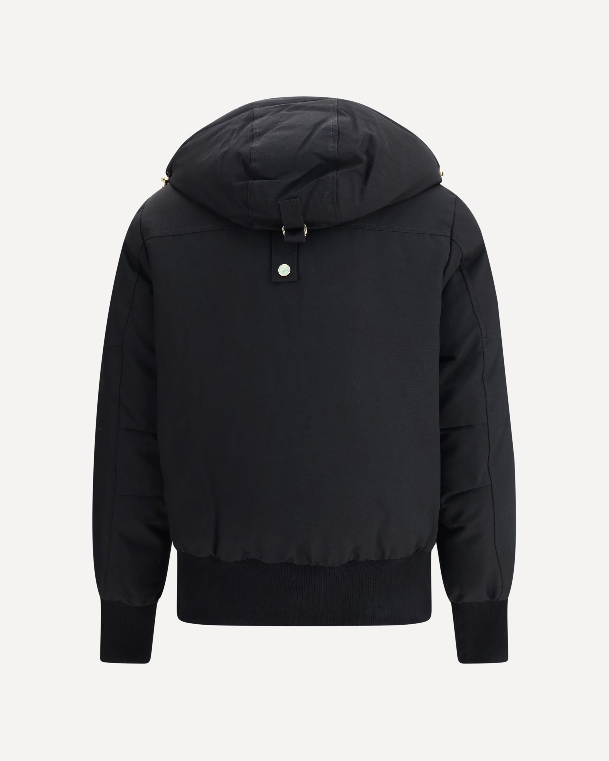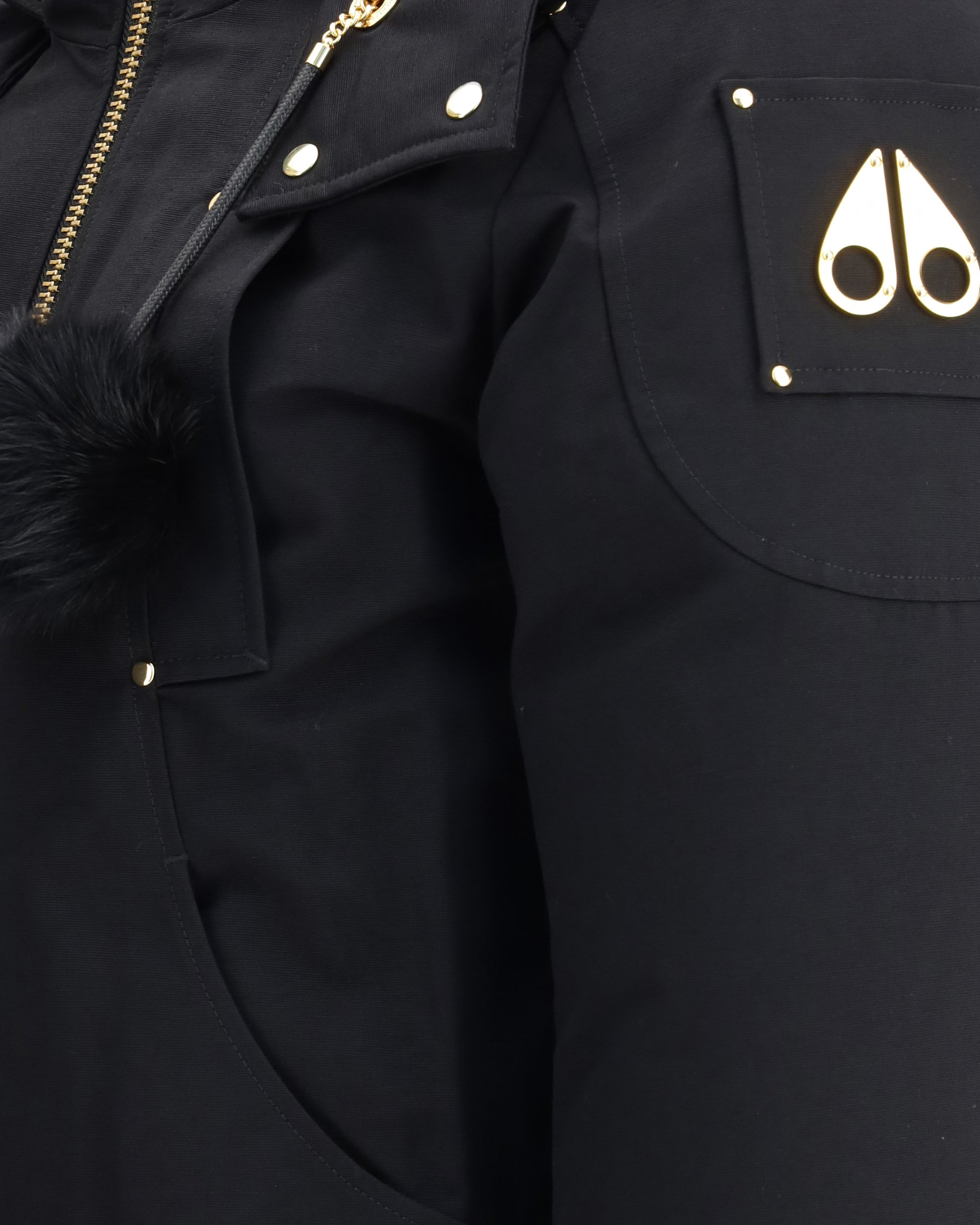 The Gold Series Original Sainte Flavie Bomber Jacket by Moose Knuckles offers a refined take on a timeless silhouette. Crafted from a water-repellent, wind-resistant shell, it is padded with 90/10 down for warmth and comfort even on the coldest days. The hood, enriched with a removable shearling trim and signature decorative pom poms, adds a distinctive and feminine touch. A down-filled collar, front zip fastening, functional front pockets, and the iconic gold metal logo complete this elegant piece from the Gold Series.