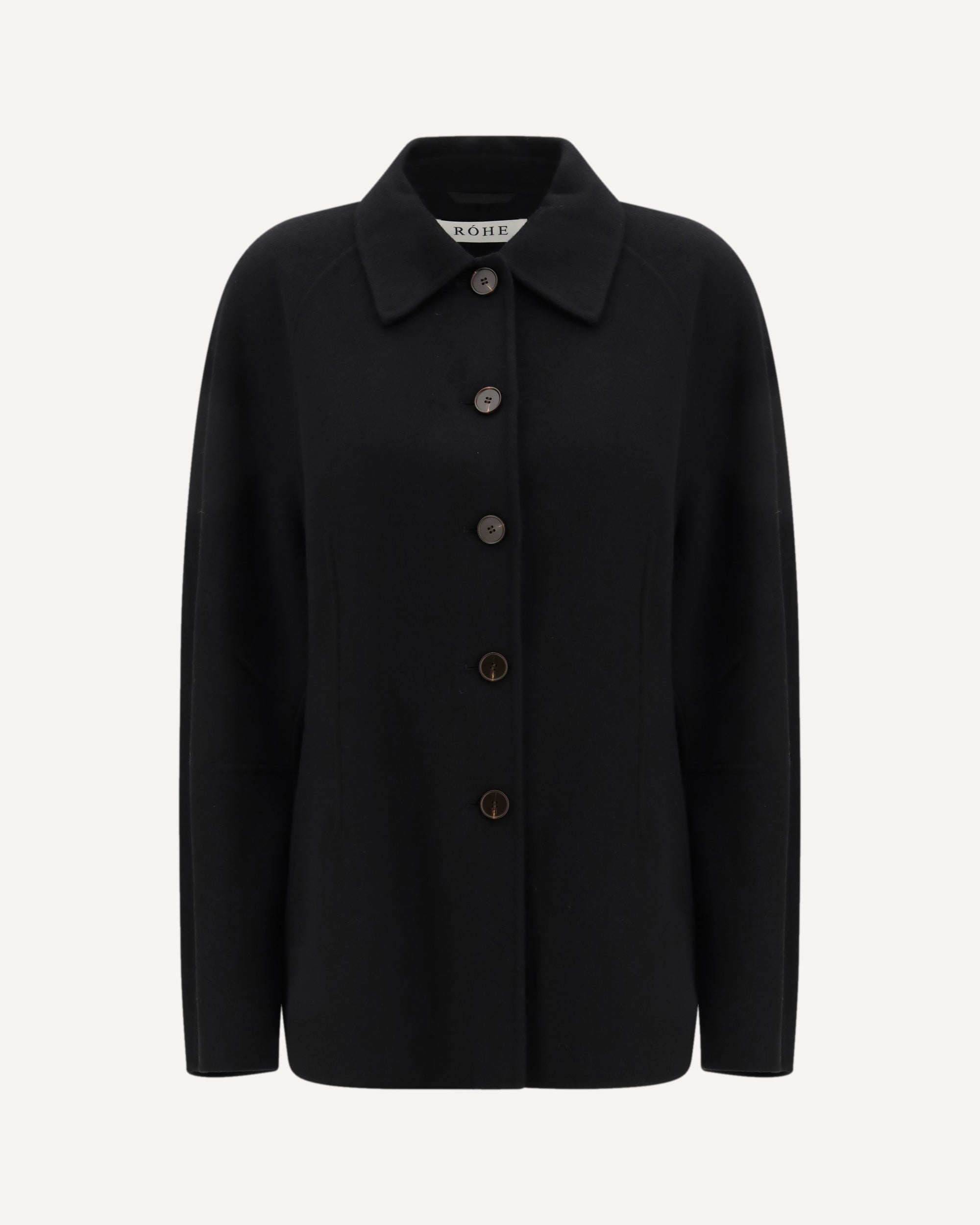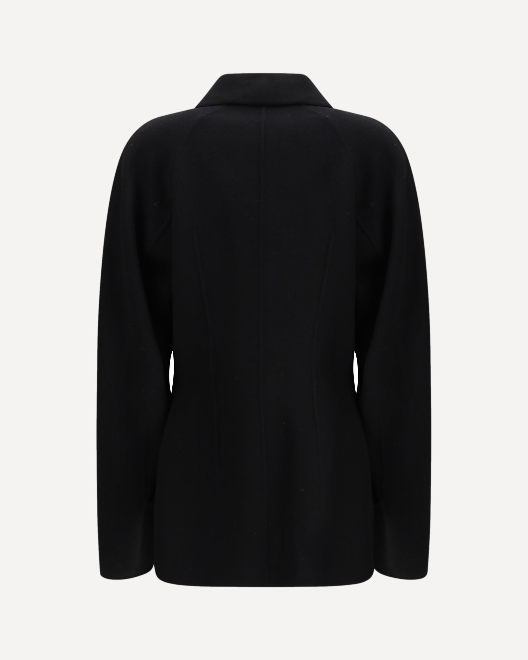The double faced sculptural Jacket by ROHE is an architectural spring jacket crafted from double-faced wool, defined by a cinched waist and oversized sculptural sleeves. It features four button closures, side-seam welt pockets, and subtle front and back dart detailing, creating a tailored yet sculpted silhouette.