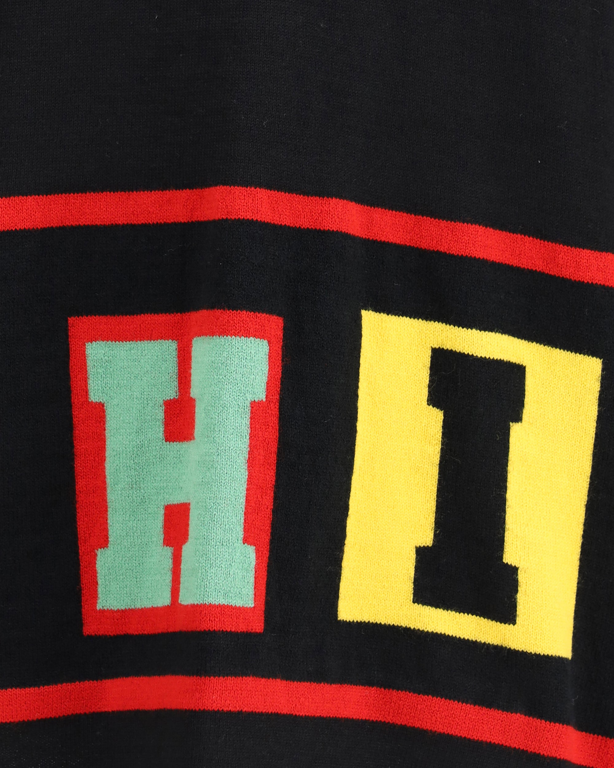 The Crewneck Sweater by Comme des Garçons combines clean lines with distinctive details. Featuring long sleeves and a straight hem, it is defined by the colorful lettering at the lower part, bringing a contemporary and bold accent to the minimalist design of the maison
