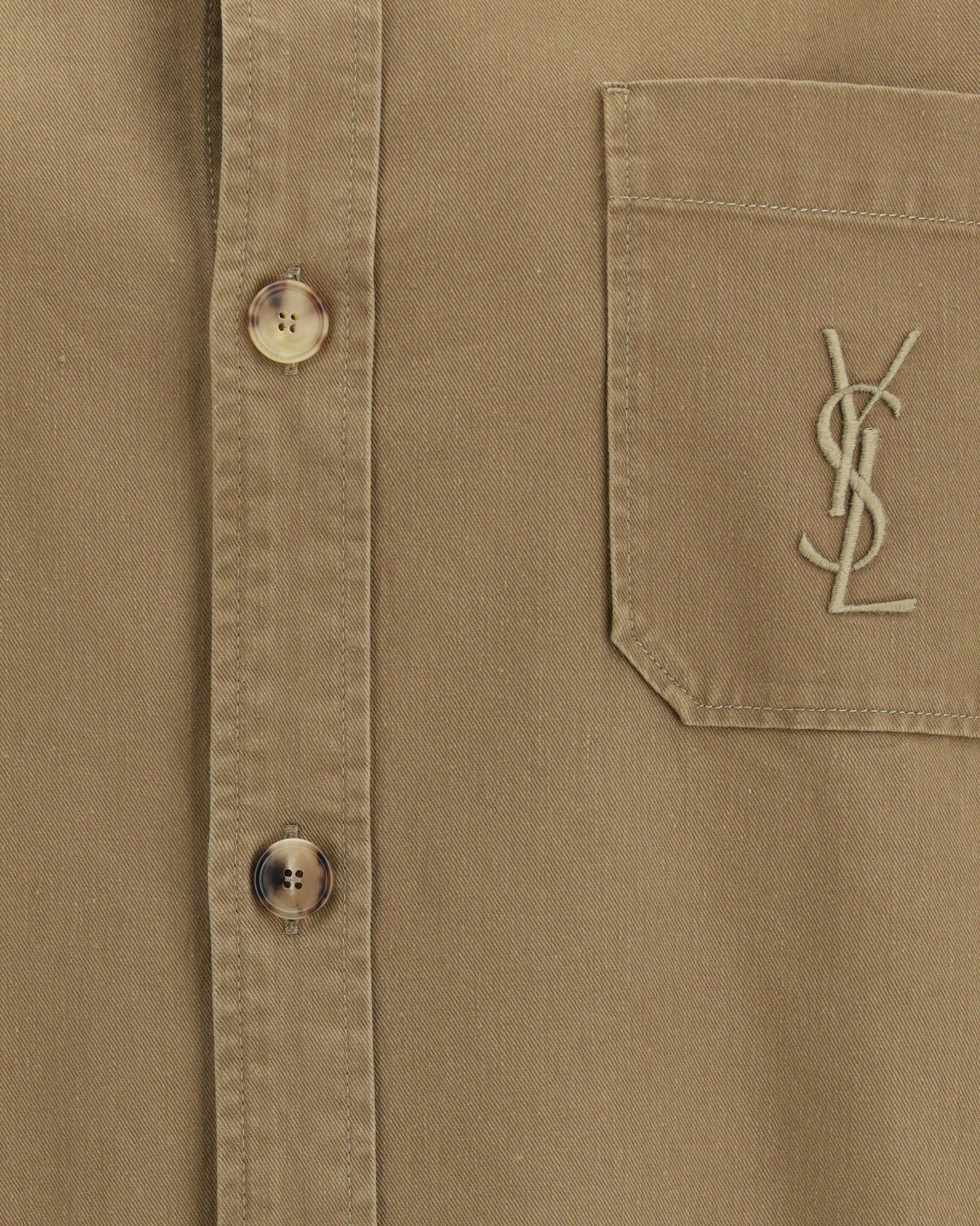 The Cassandre Overshirt in cotton and linen gabardine by Saint Laurent features a clean construction with oversized button fastening, pointed collar, and a chest pocket adorned with the Cassandre embroidery. Crafted from certified cotton, it offers a compact yet lightweight texture, complemented by adjustable cuffs and side slits for ease of movement. Subtle and refined, it captures the Maison’s signature balance between utilitarian spirit and sartorial sophistication, embodying a timeless sense of everyday elegance.
