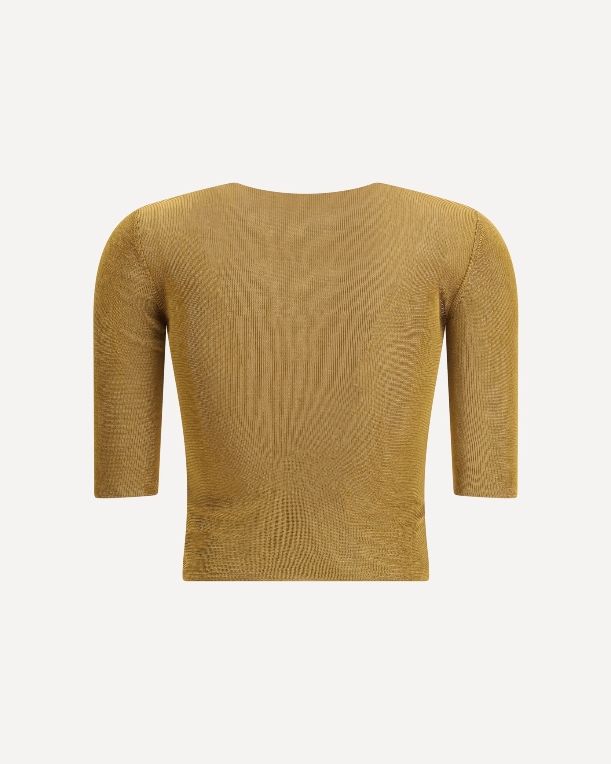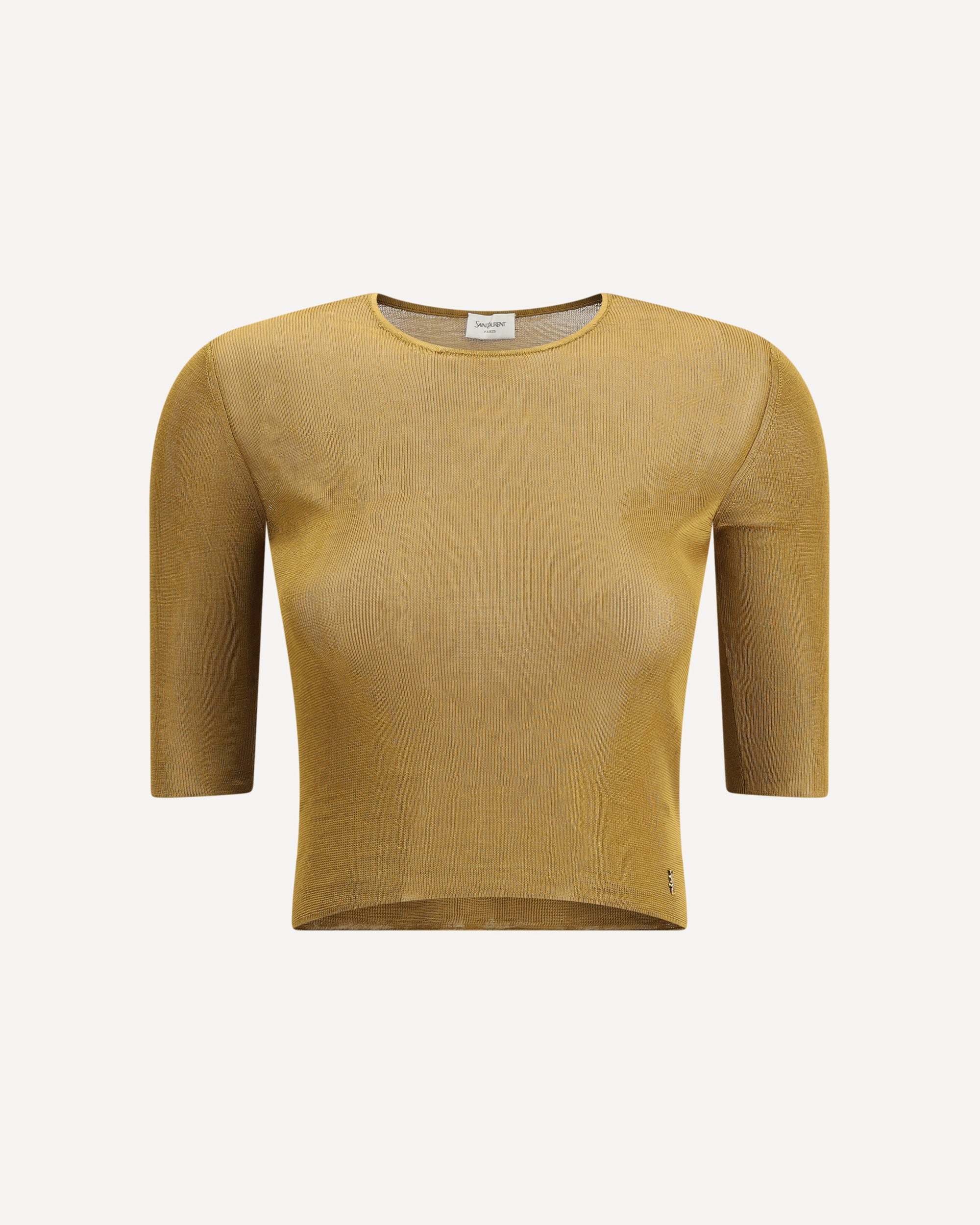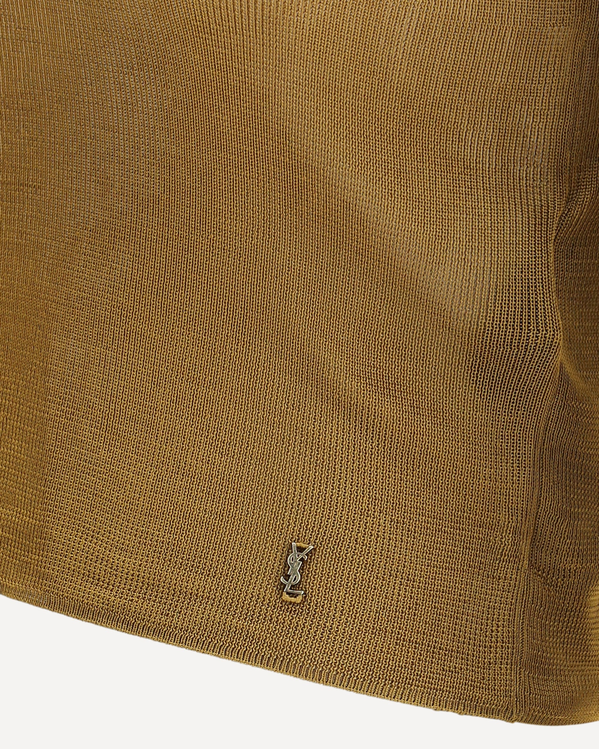 Saint Laurent's Top combines simplicity and sophistication in an essential yet recognizable design. Made in a short-sleeved model with a classic crew neck, it is distinguished by the metallic plaque with the iconic YSL logo applied to the front, a distinctive detail that recalls the Maison's timeless elegance. The fitted fit enhances the silhouette with discretion, making it a versatile garment, perfect to wear on its own or under structured blazers for a bold and sophisticated look.
