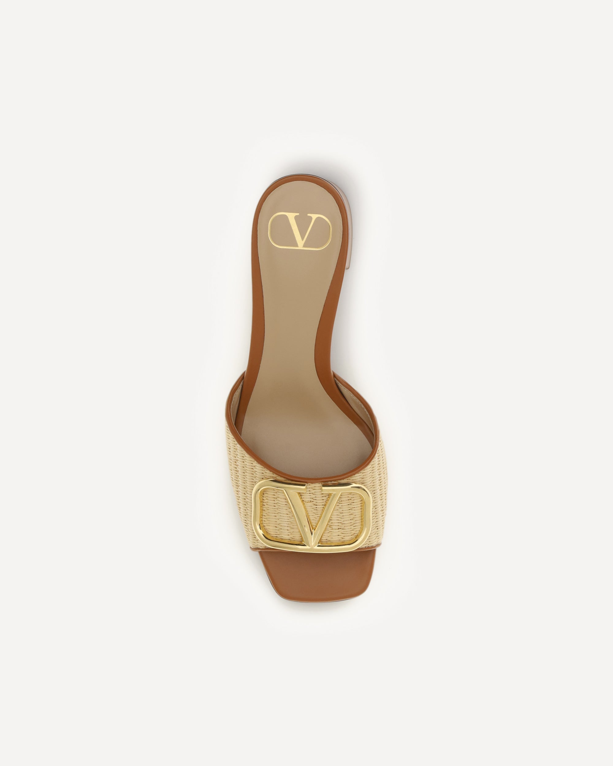 The VLogo Signature raffia slide Sandals by Valentino Garavaniare an elegant and sophisticated summer accessory. Crafted from synthetic raffia with calfskin details, they offer the perfect combination of lightness and luxury. The VLogo Signature in an antiqued brass finish adds a distinctive, modern touch. The calfskin-wrapped block heel ensures comfort and stability, while the minimalist design makes them perfect for adding a touch of class to any summer look.