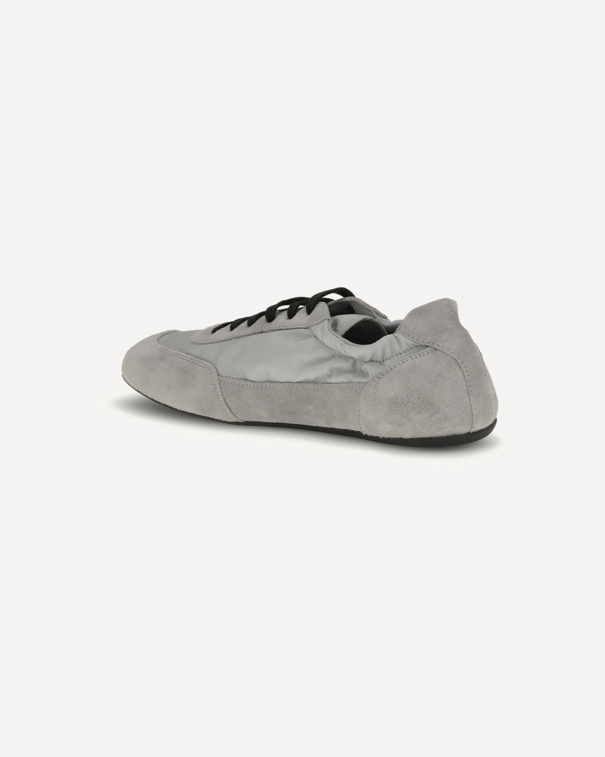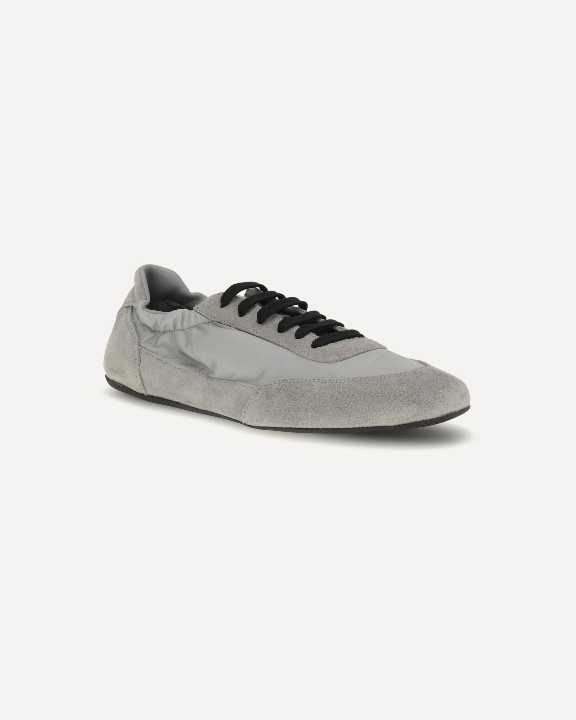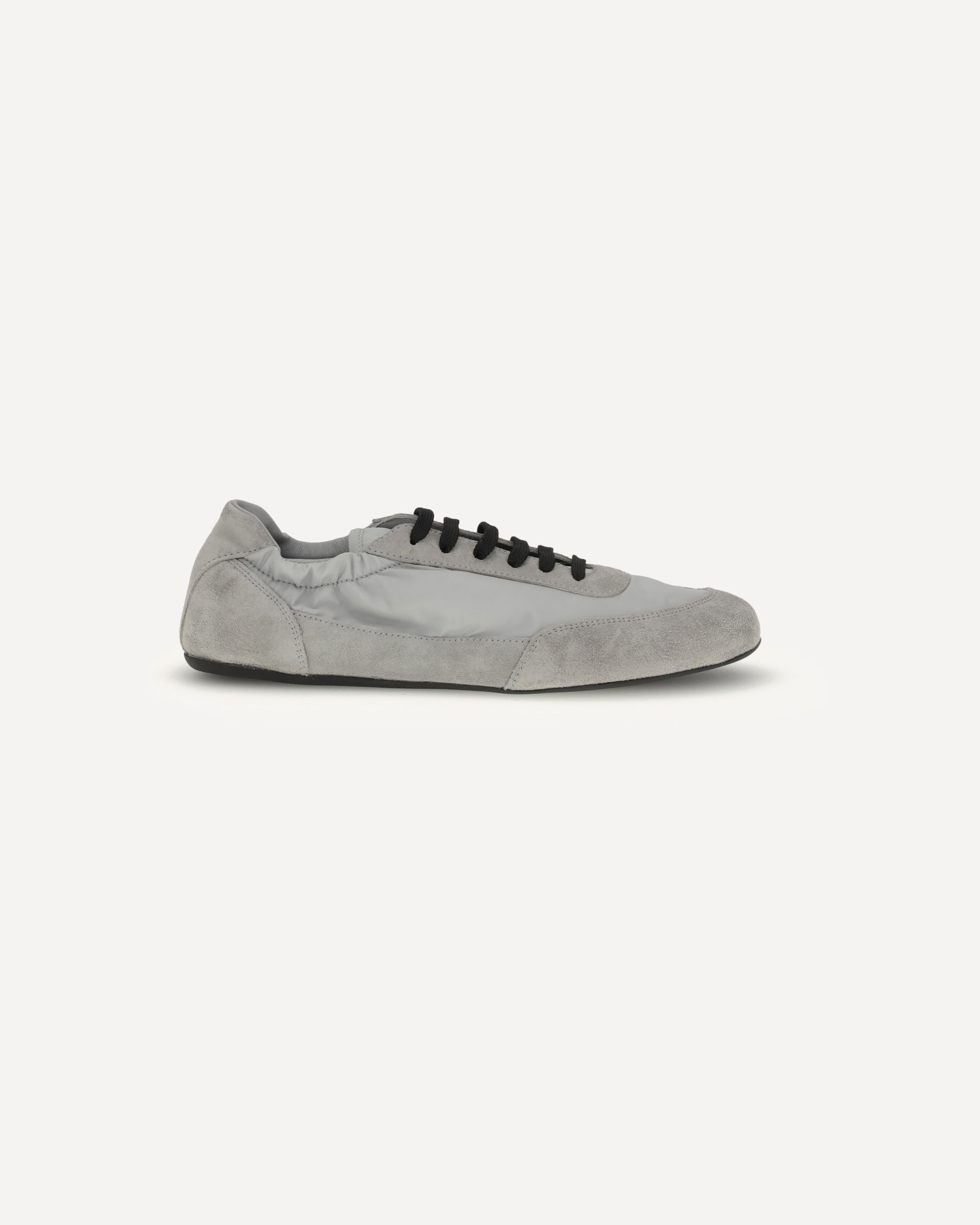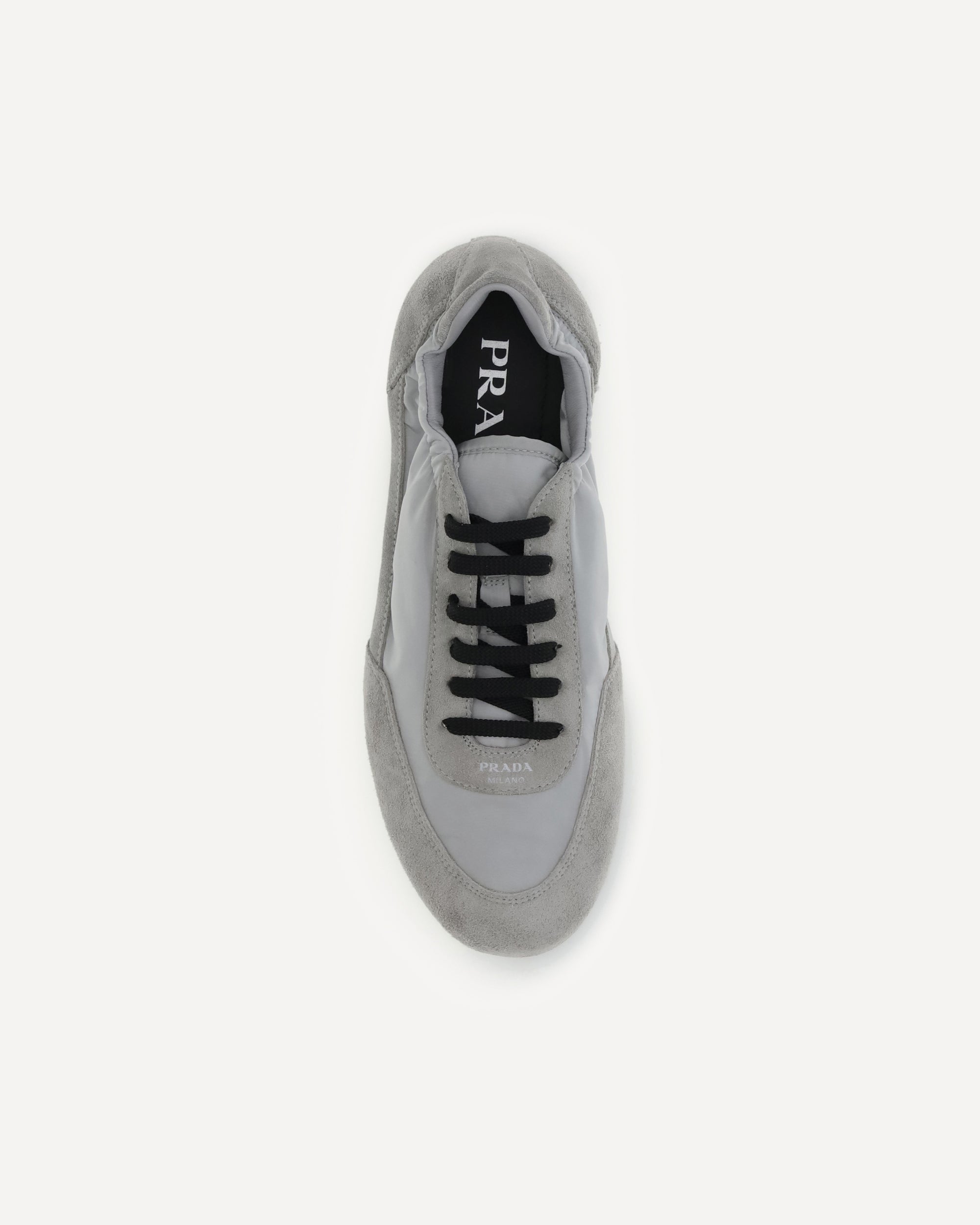 Prada's Sneakers feature a round toe and suede details, with front lace-up closure for a comfortable fit. The brand's iconic monogram can be seen in contrast on the front, while the elasticized ankle lap ensures added comfort. The flat rubber sole provides stability and durability, completing the look with a distinctive style touch.