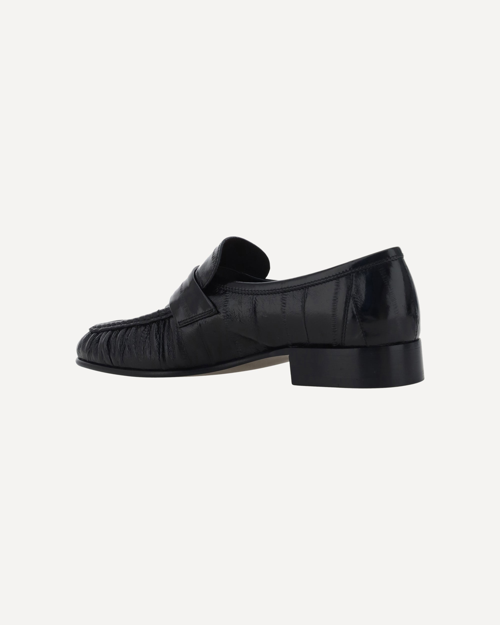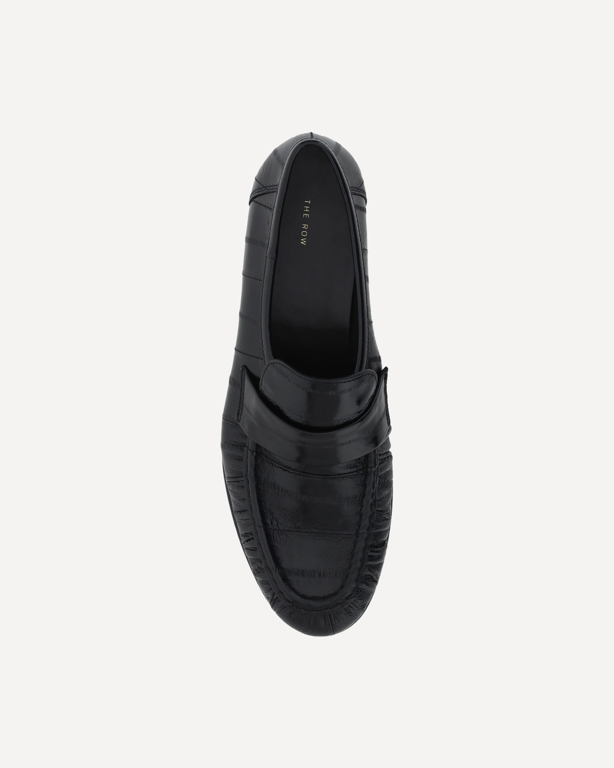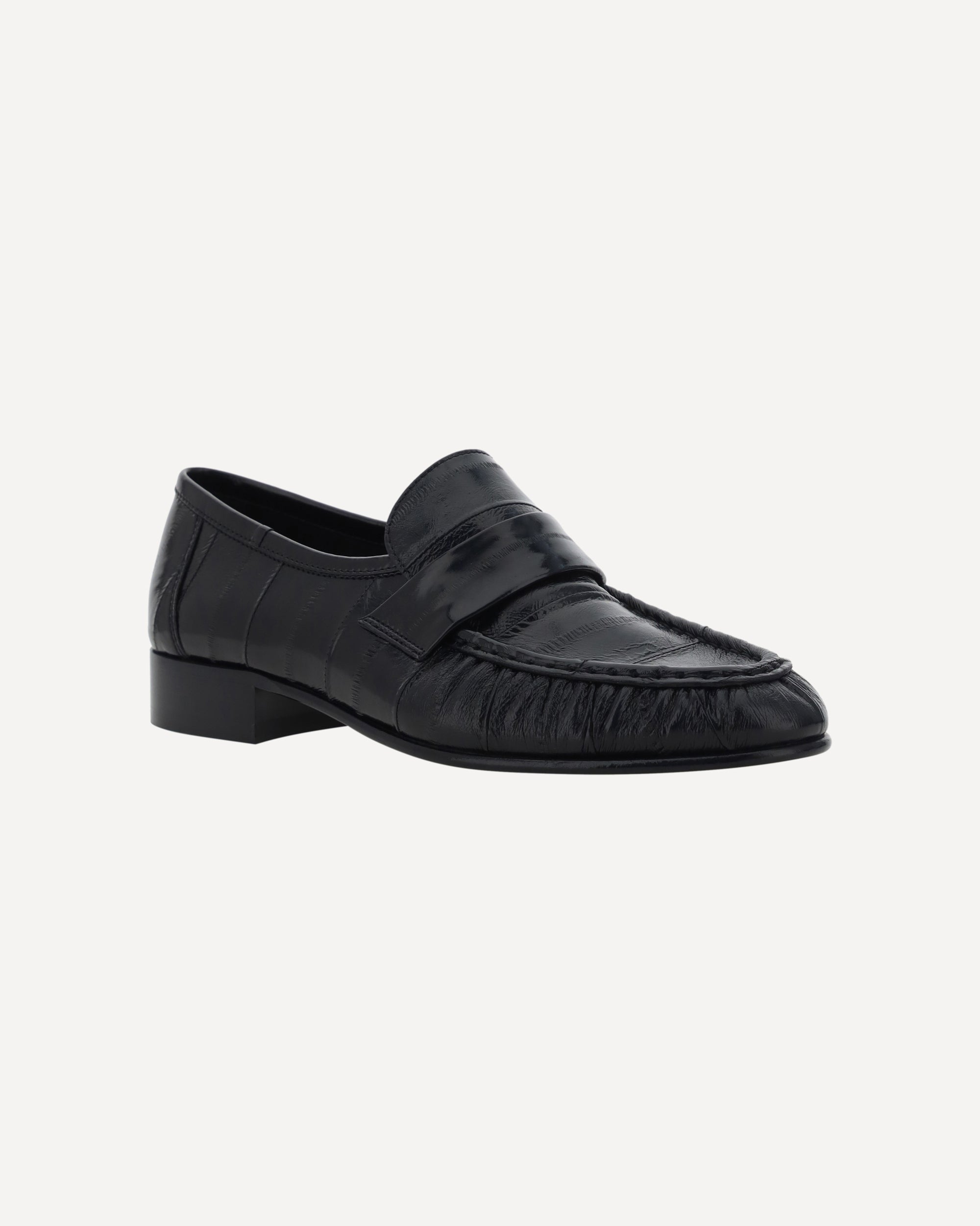 The Soft eel leather Loafers by The Row embody minimal, refined elegance. Featuring an almond-shaped toe, they include a leather apron front, a leather block heel, and a debossed branded insole, delivering a perfect balance of sophistication and comfort.