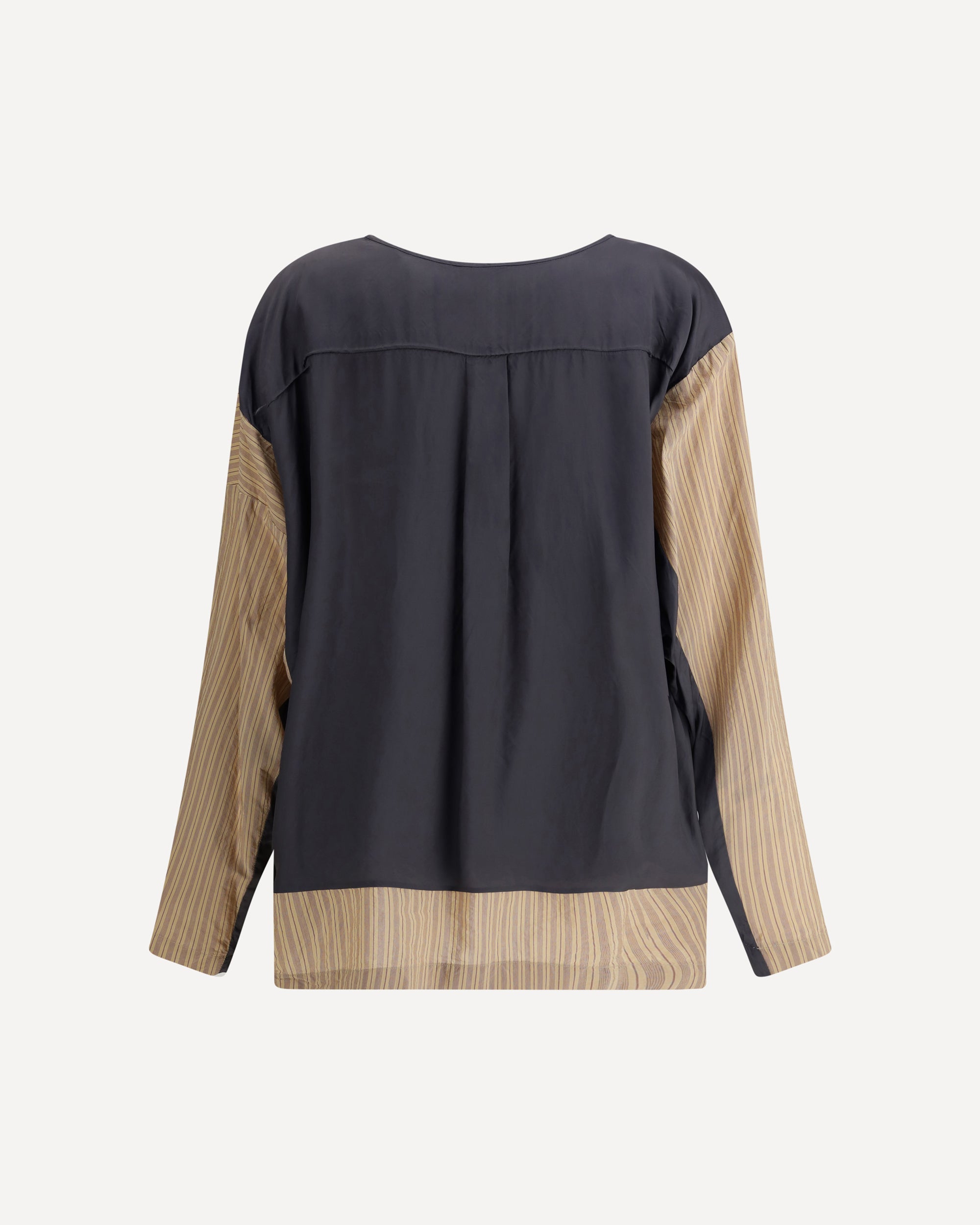The striped Blouse by Dries Van Noten is a modern and distinctive garment. The wide crew neck and long sleeves offer elegant comfort, while the paneled design creates an interesting and dynamic structure. The asymmetrical hemline adds a contemporary, sculptural touch, emphasizing the silhouette in an original way. The stripes, contrasting with the innovative cut, give movement and a unique visual effect, making this blouse ideal for a sophisticated and fashionable look.