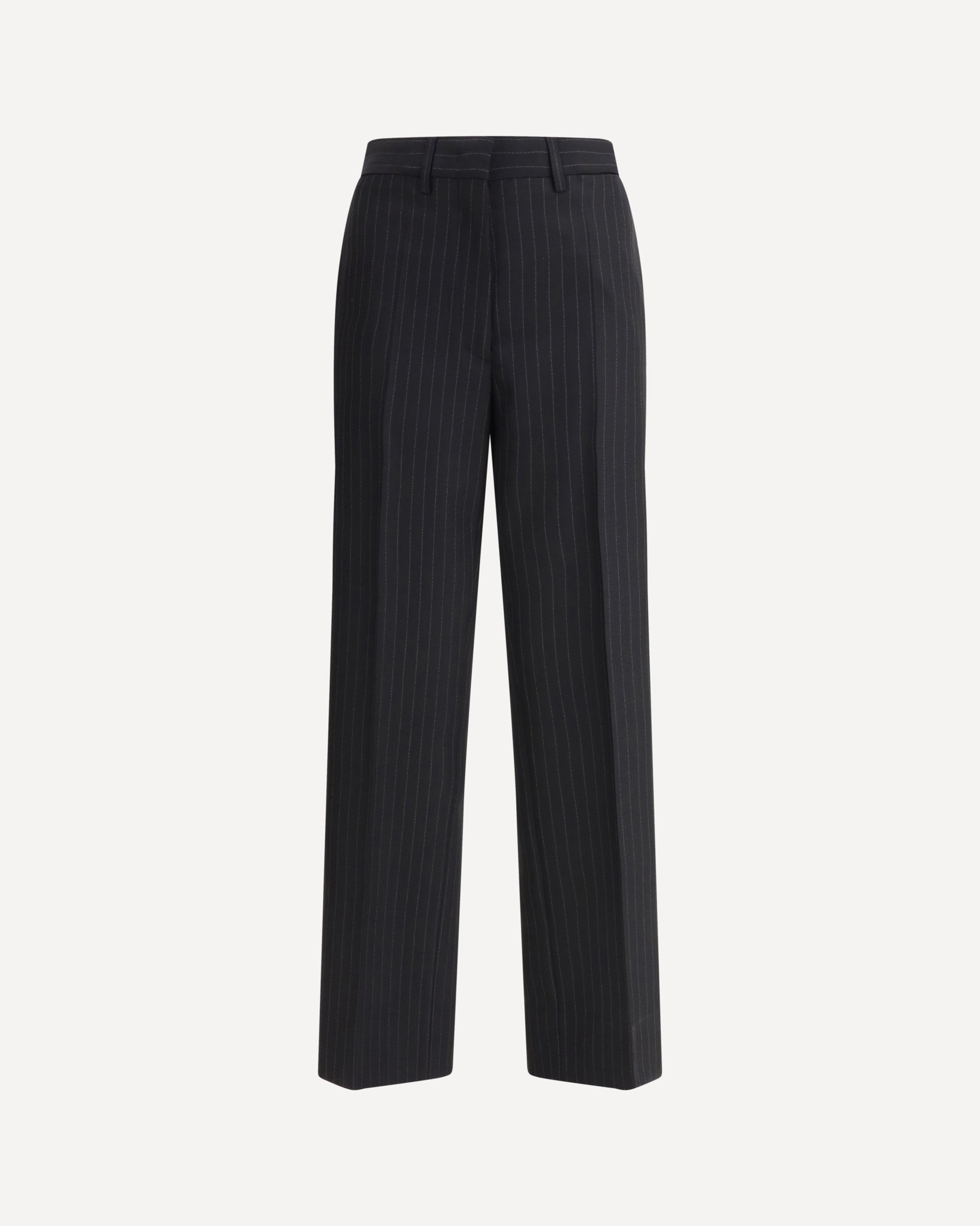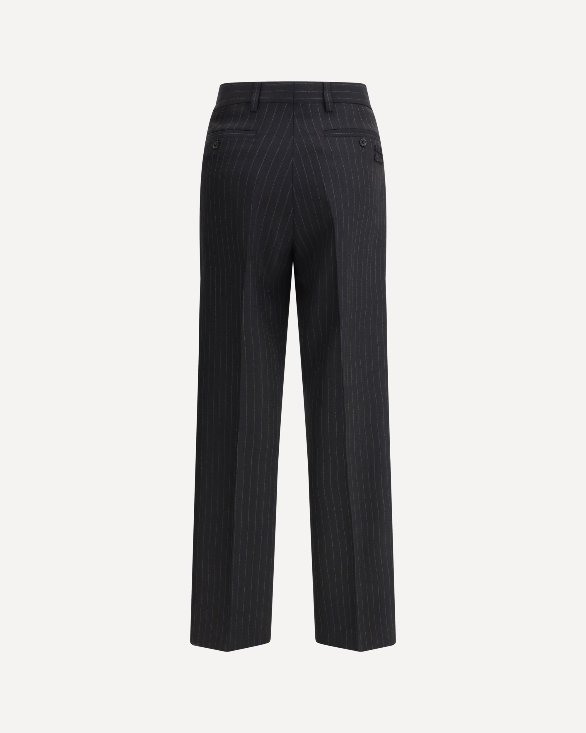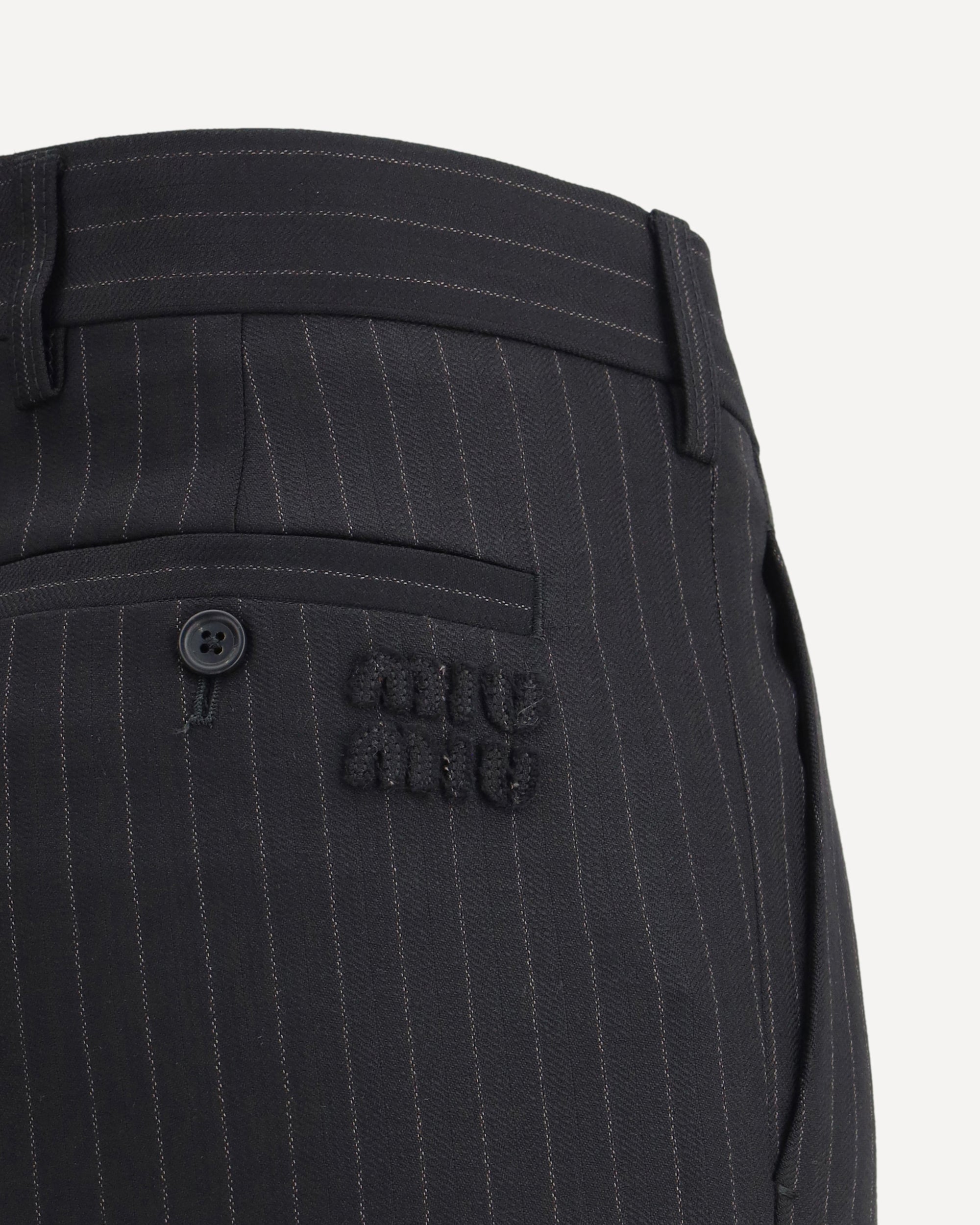 Miu Miu's Striped Tailored Trousers are a masterpiece of elegance and precision, featuring a hook-and-zipper front closure that ensures a flawless fit. Belt loops on the waistband allow you to customize the look, while the two side slash pockets and two welt back pockets with buttons add functionality and a touch of class. The striped pattern gives the pants a dynamic and sophisticated look, perfect for a stylish yet modern look.