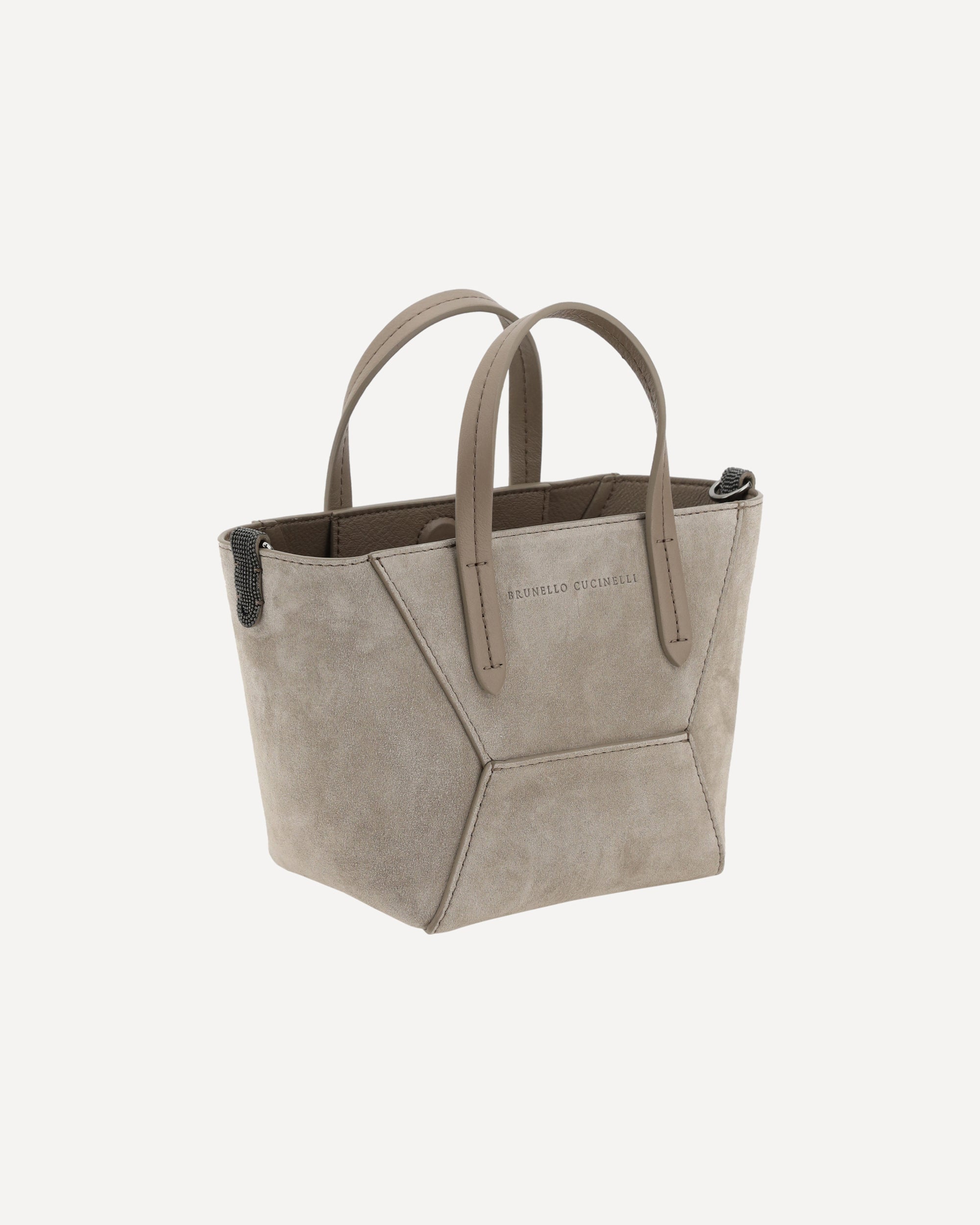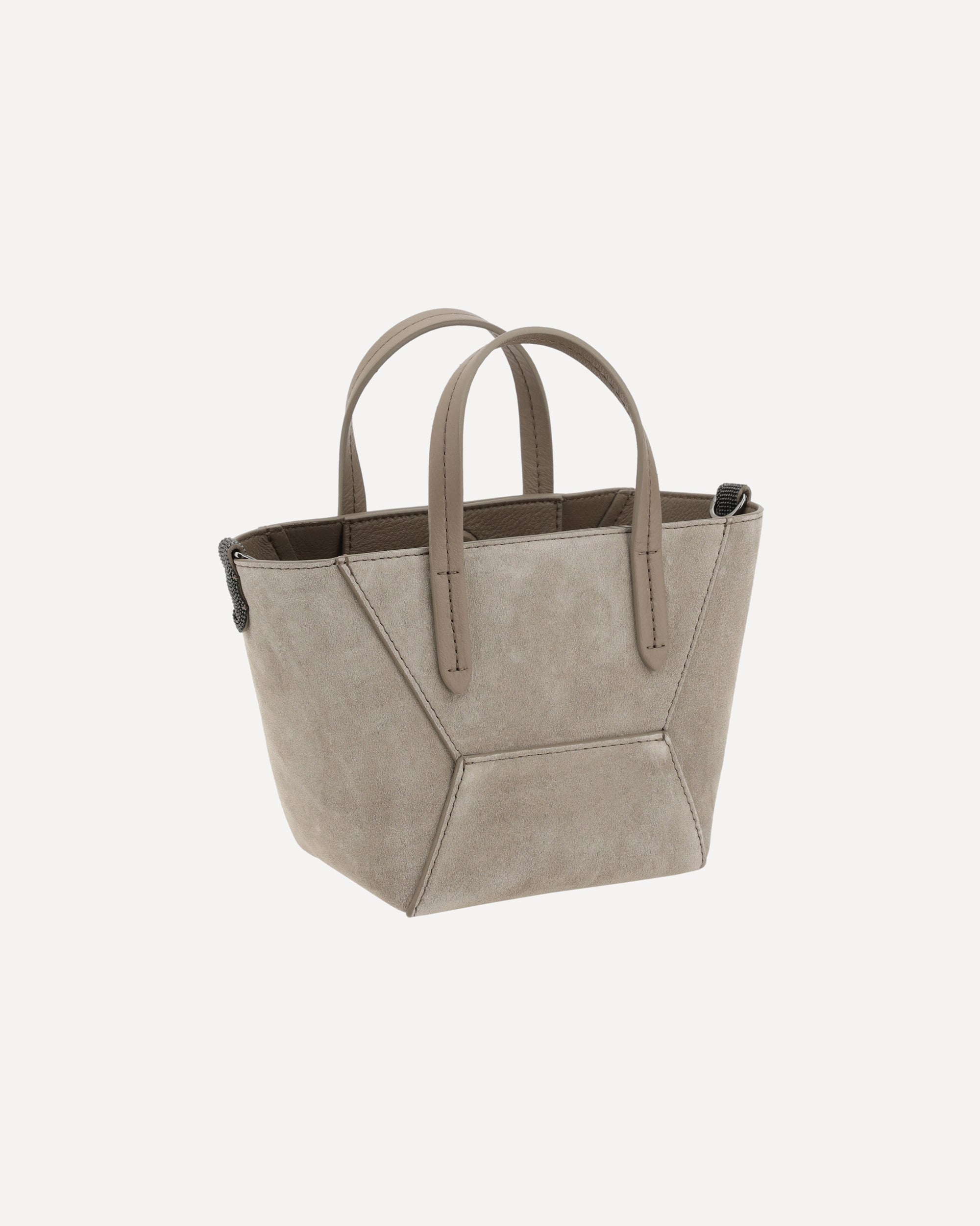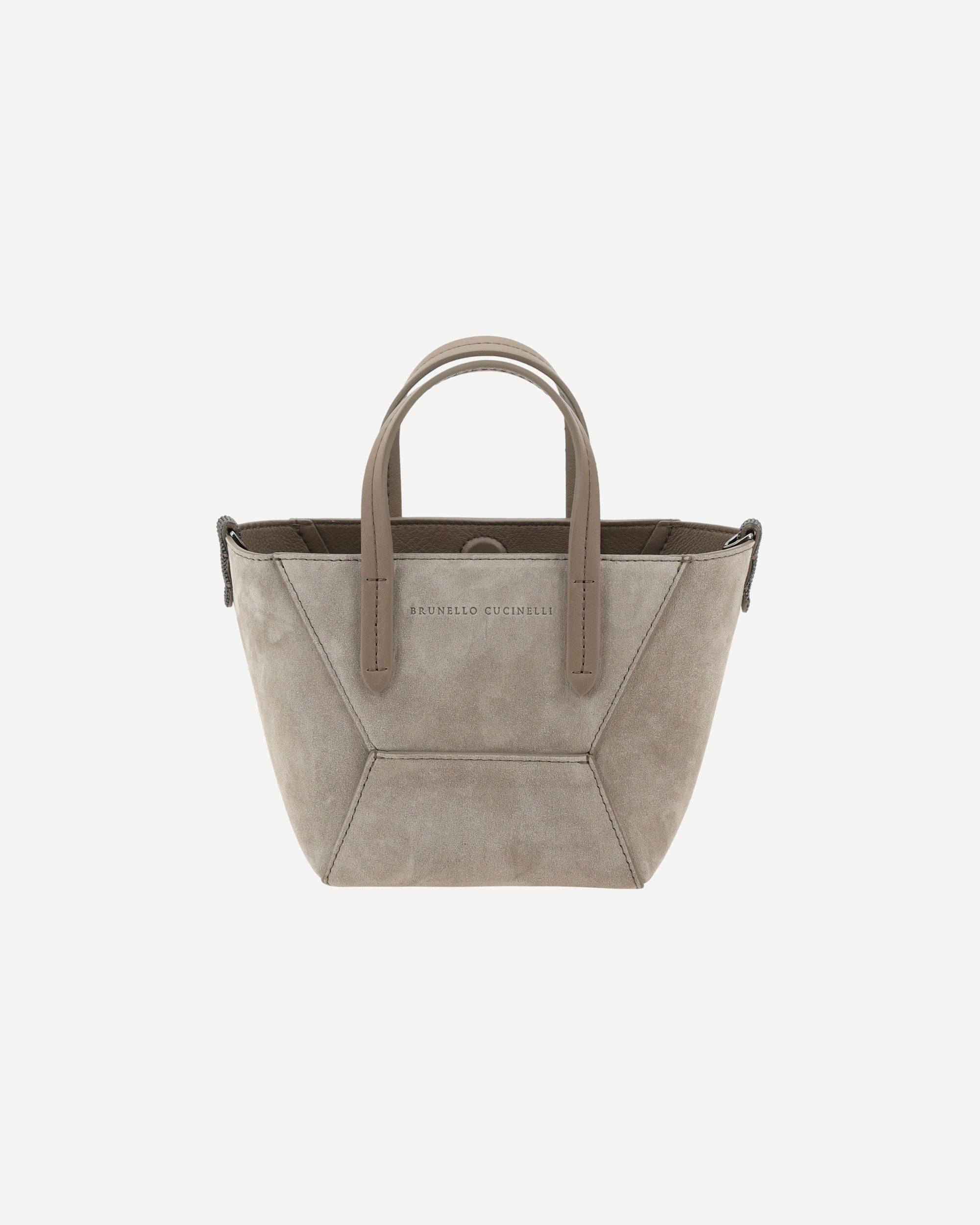 Brunello Cucinelli's suede leather Shoulder Bag combines craftsmanship and sophistication. Featuring two top handles and an adjustable and removable flat shoulder strap, it offers versatility and comfort. The paneled design enhances the elegant structure, while the iconic monogram on the front panel adds a distinctive touch. The interior magnetic button closure ensures practicality, and the iconic shiny jewels on the side panels lend brightness and sophistication. The single interior compartment ensures space and functionality, perfect for discreet and timeless elegance.