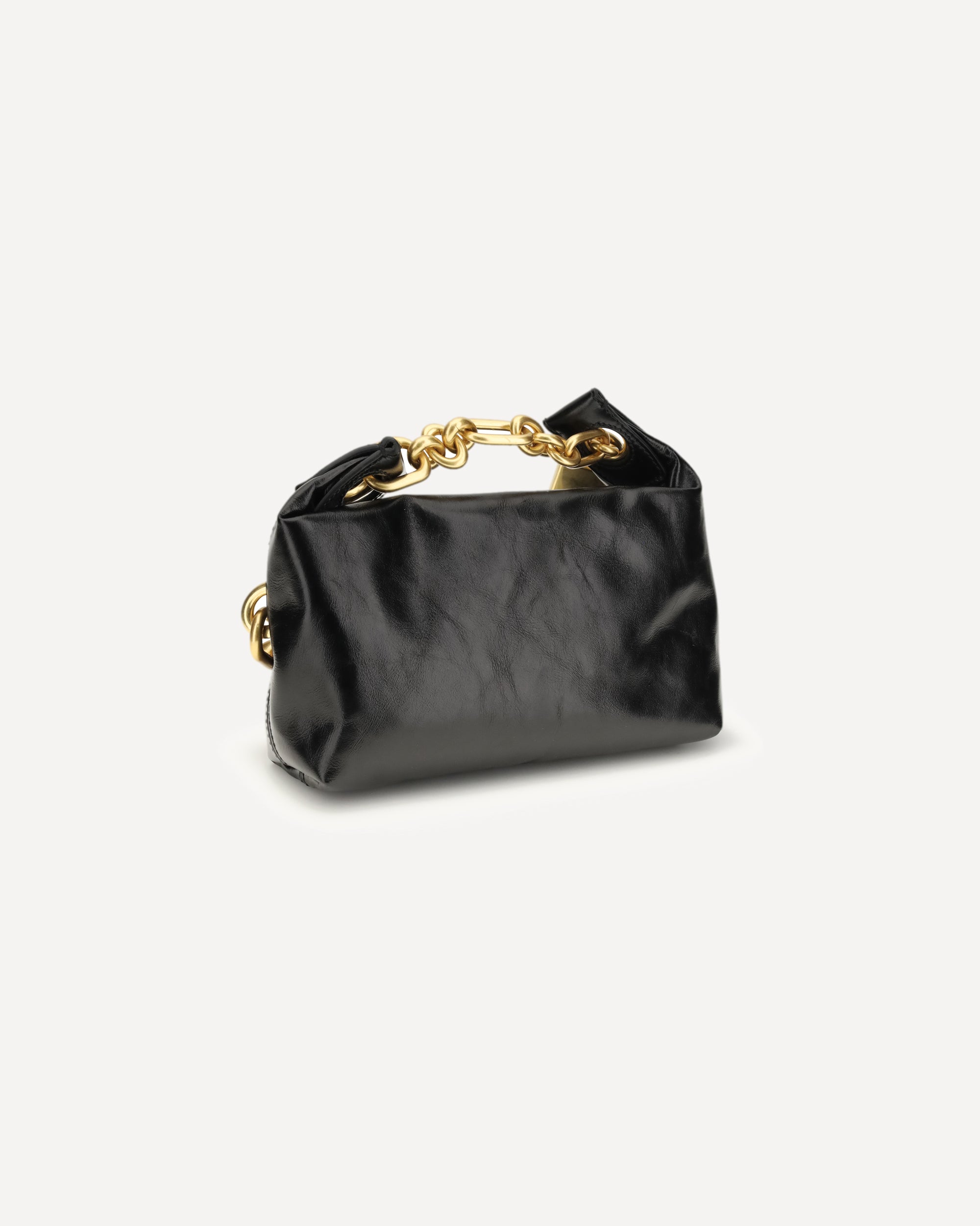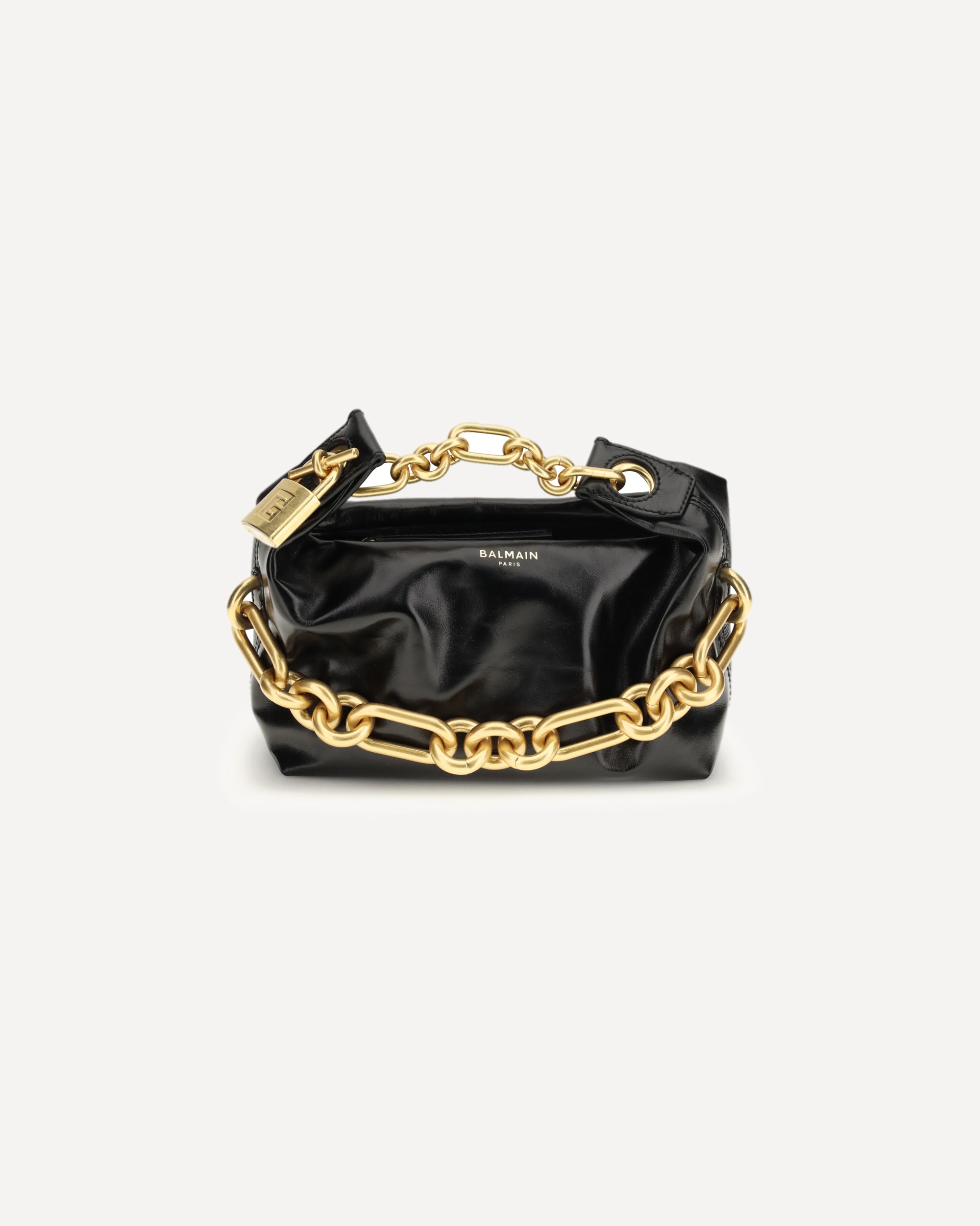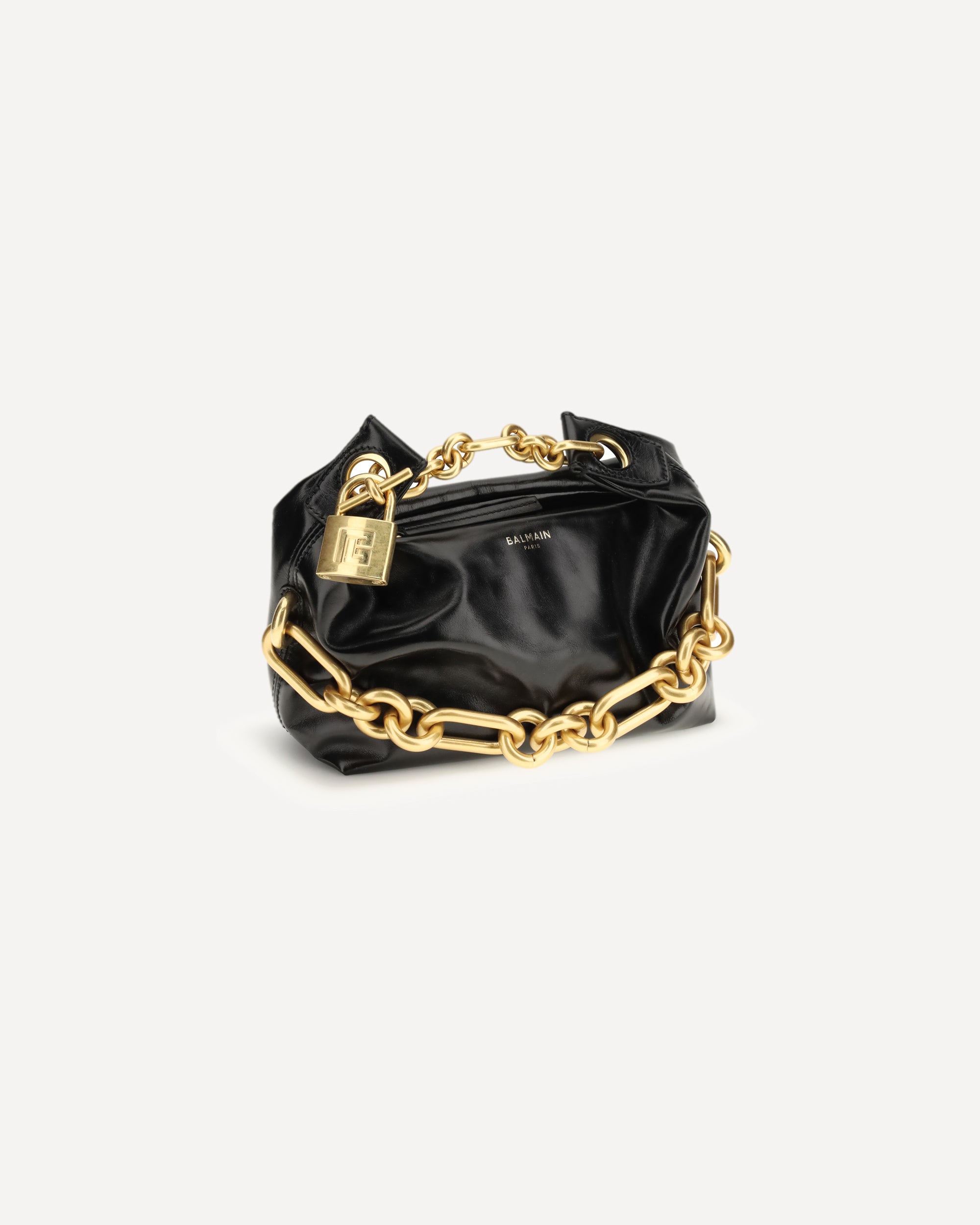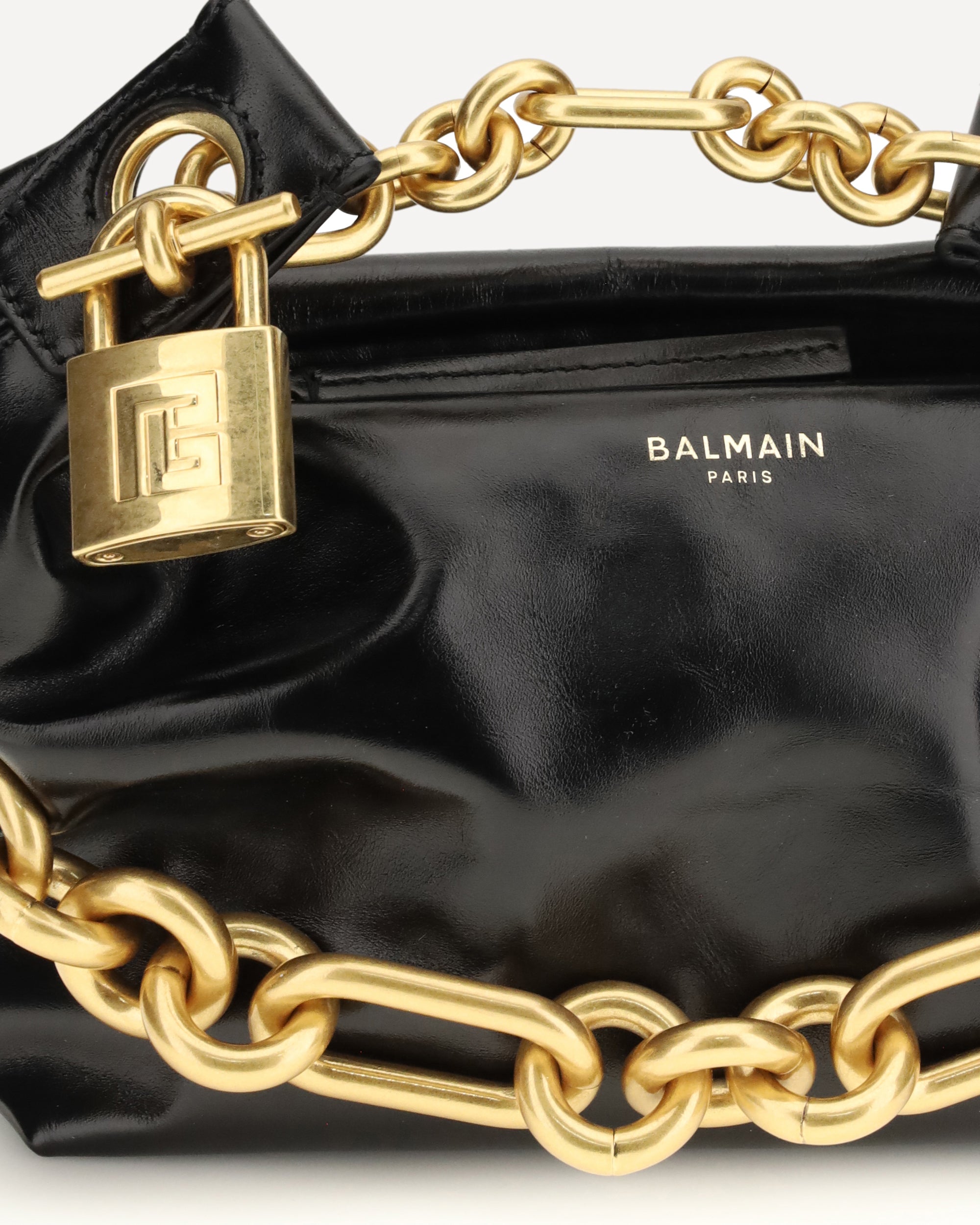 The Sync mini leather Shoulder Bag by Balmain stands out for its soft structure and the bold character of its chain handles, enhanced by side eyelets. The golden metal PB-engraved padlock adds an iconic touch, while the embossed Balmain Paris logo on the front illuminates the design with elegance. The leather-slider zipper closure provides practicality, as does the embossed leather interior card pocket. Gold metal details complete a compact bag with a strong personality.