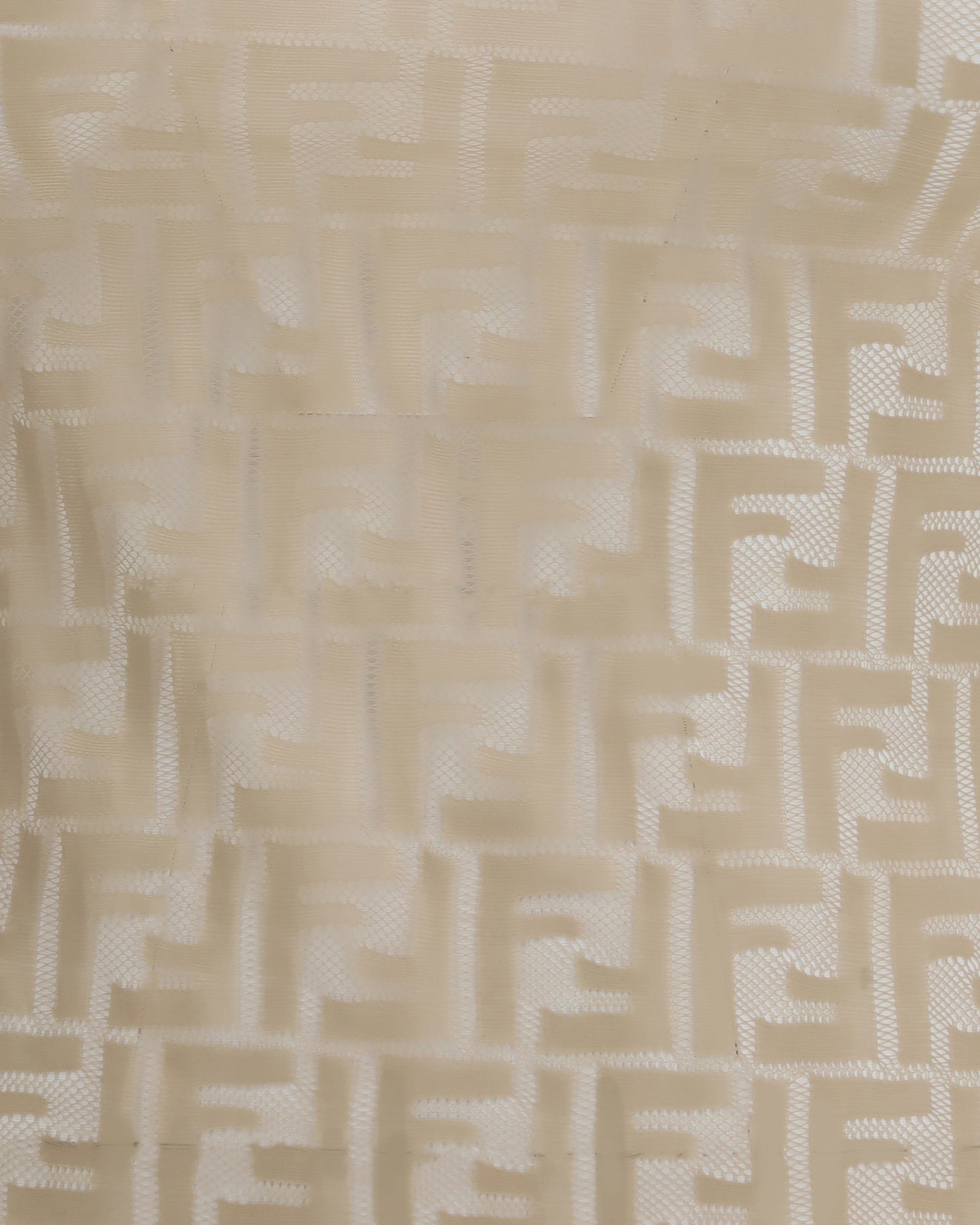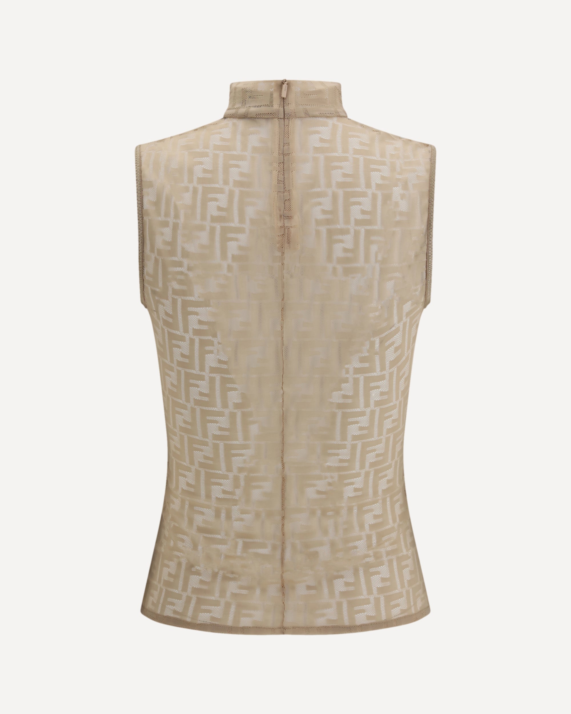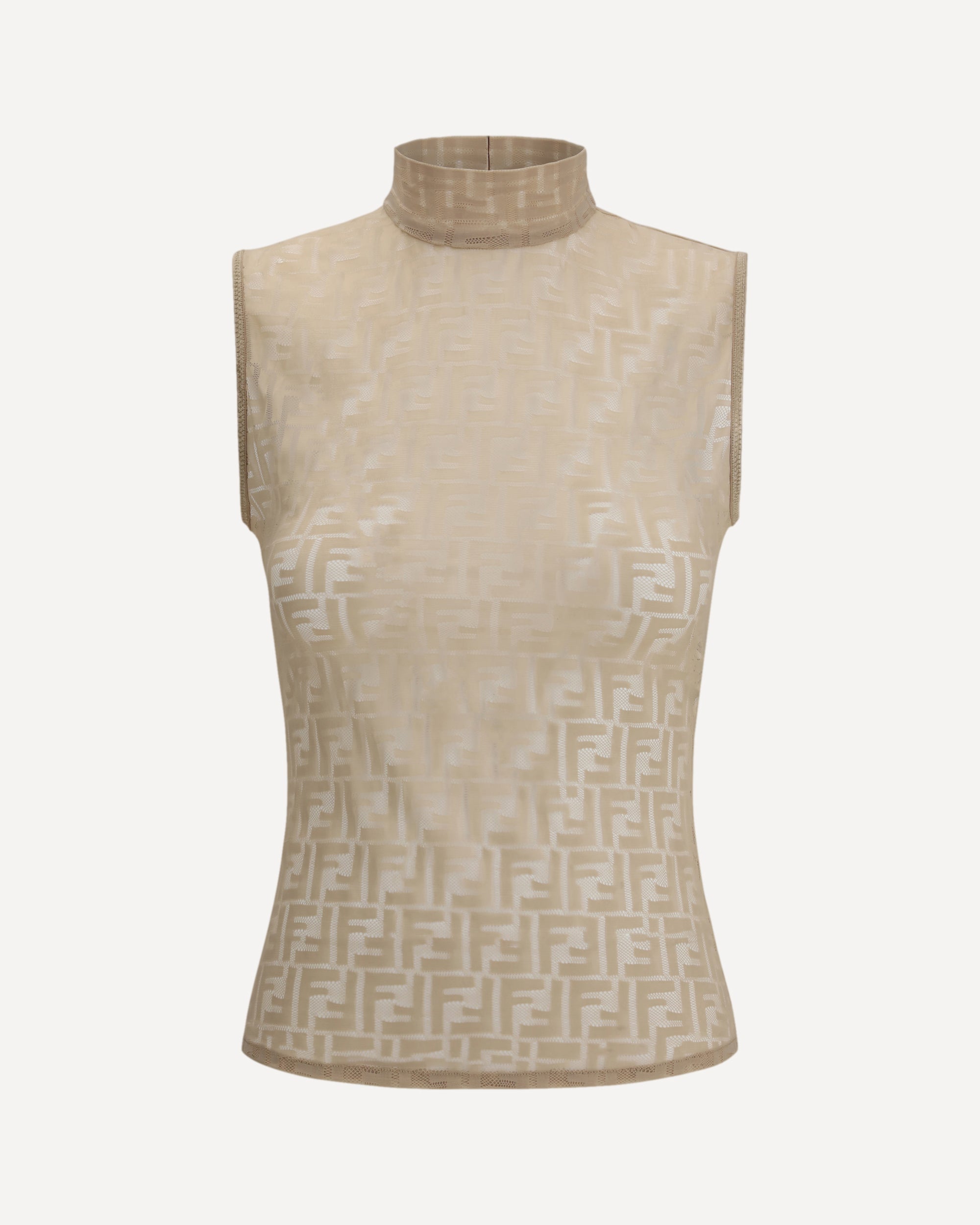 The FF lace Top features a sleeveless design with a high collar and a fitted silhouette. Made of black jersey lace with an all-over iconic FF motif, the piece creates a sophisticated see-through effect. The unlined construction enhances the lightness and boldness of the design, making it a distinctive and statement-making garment.