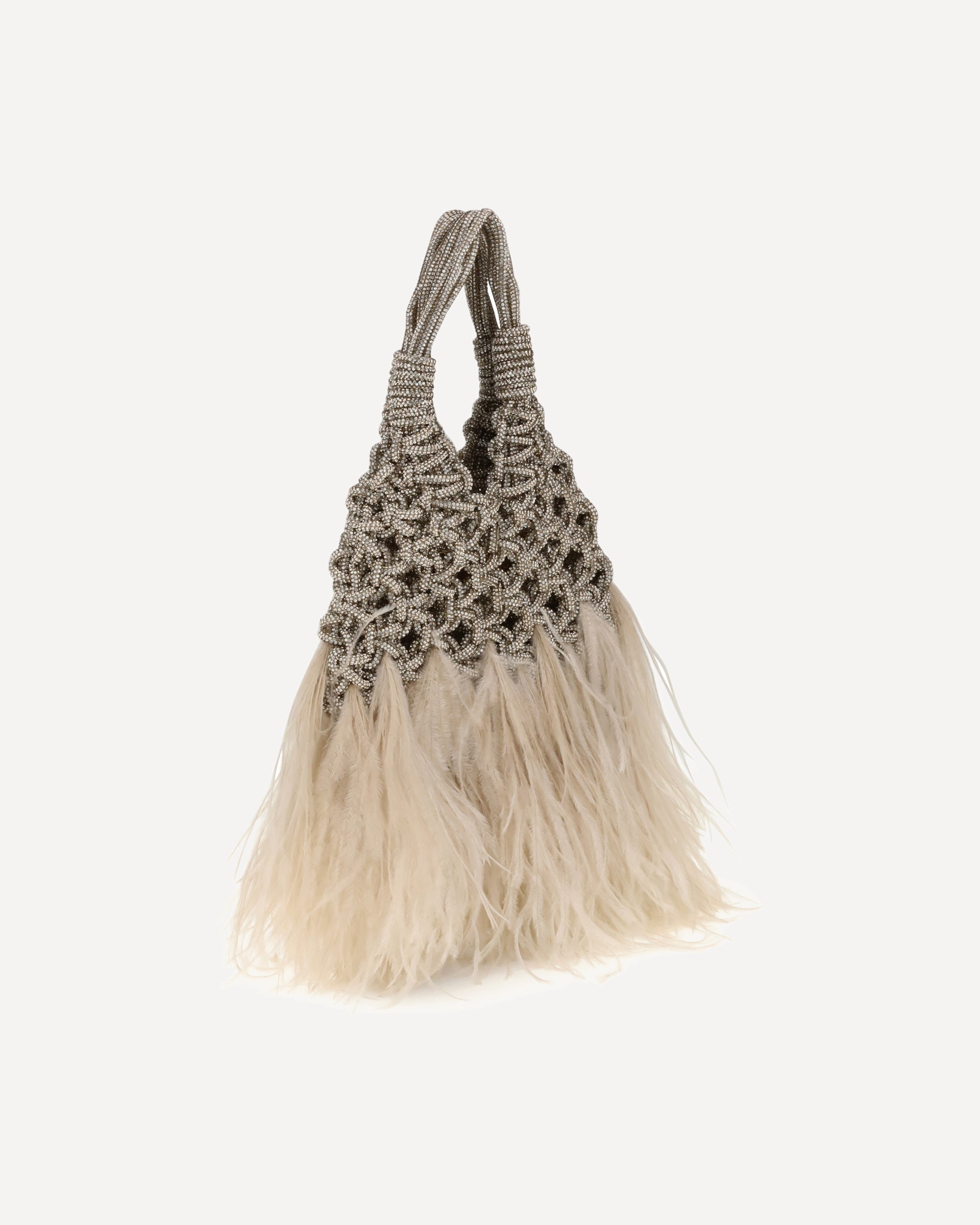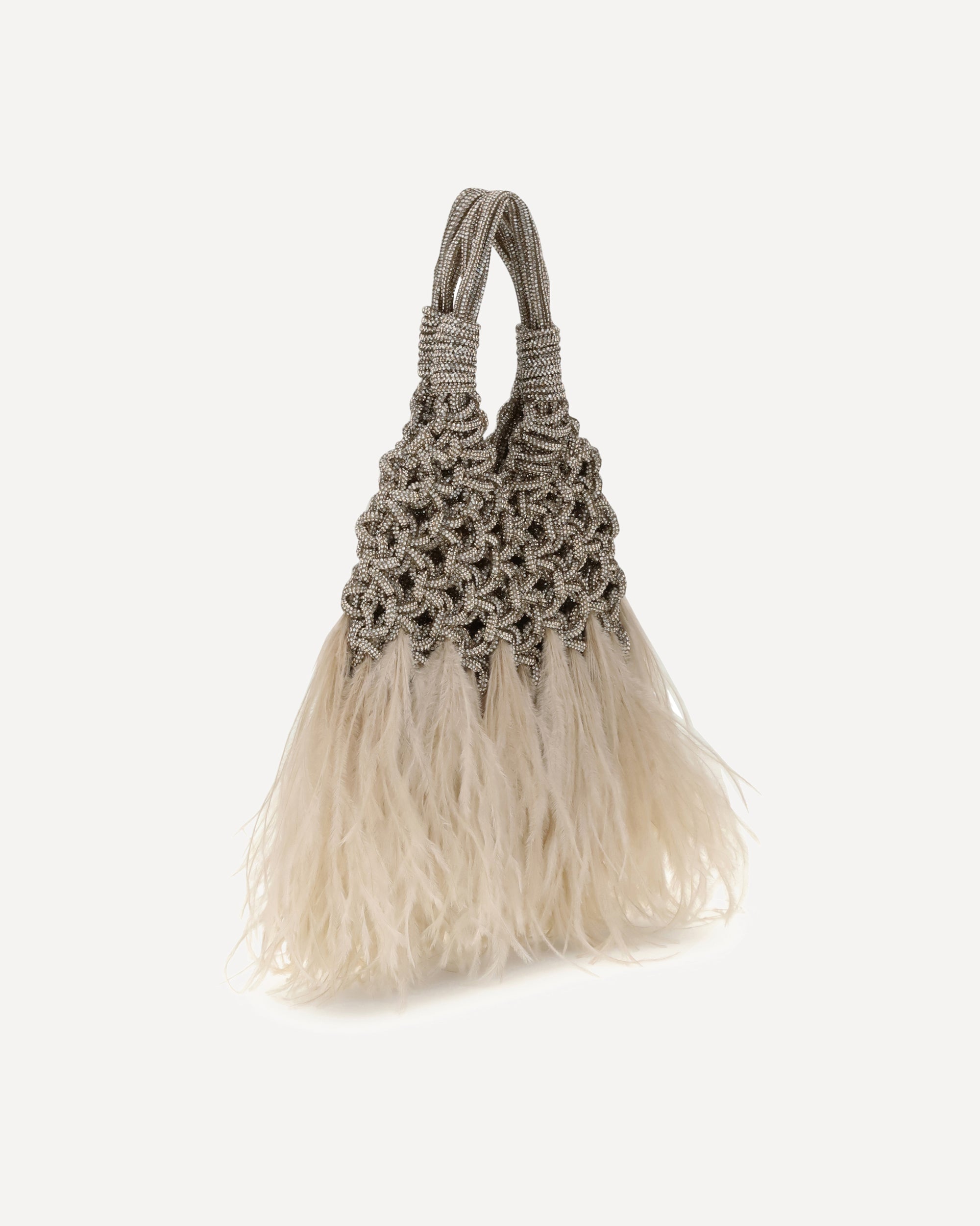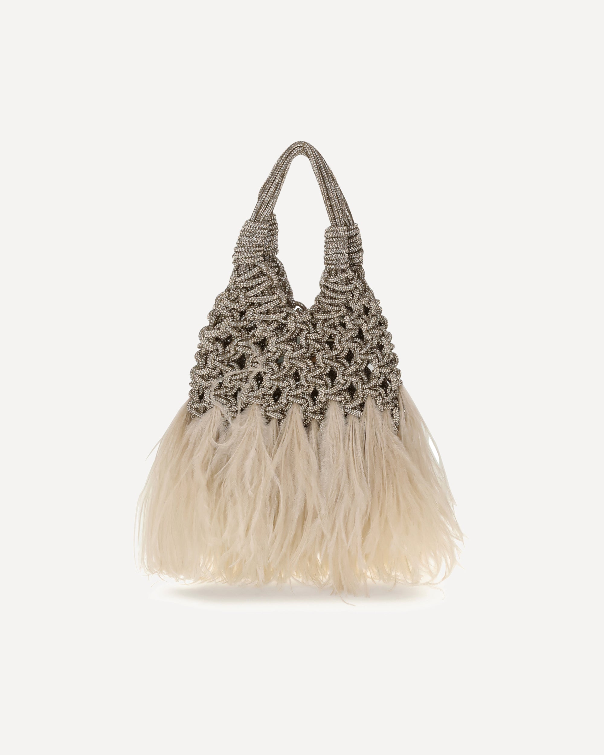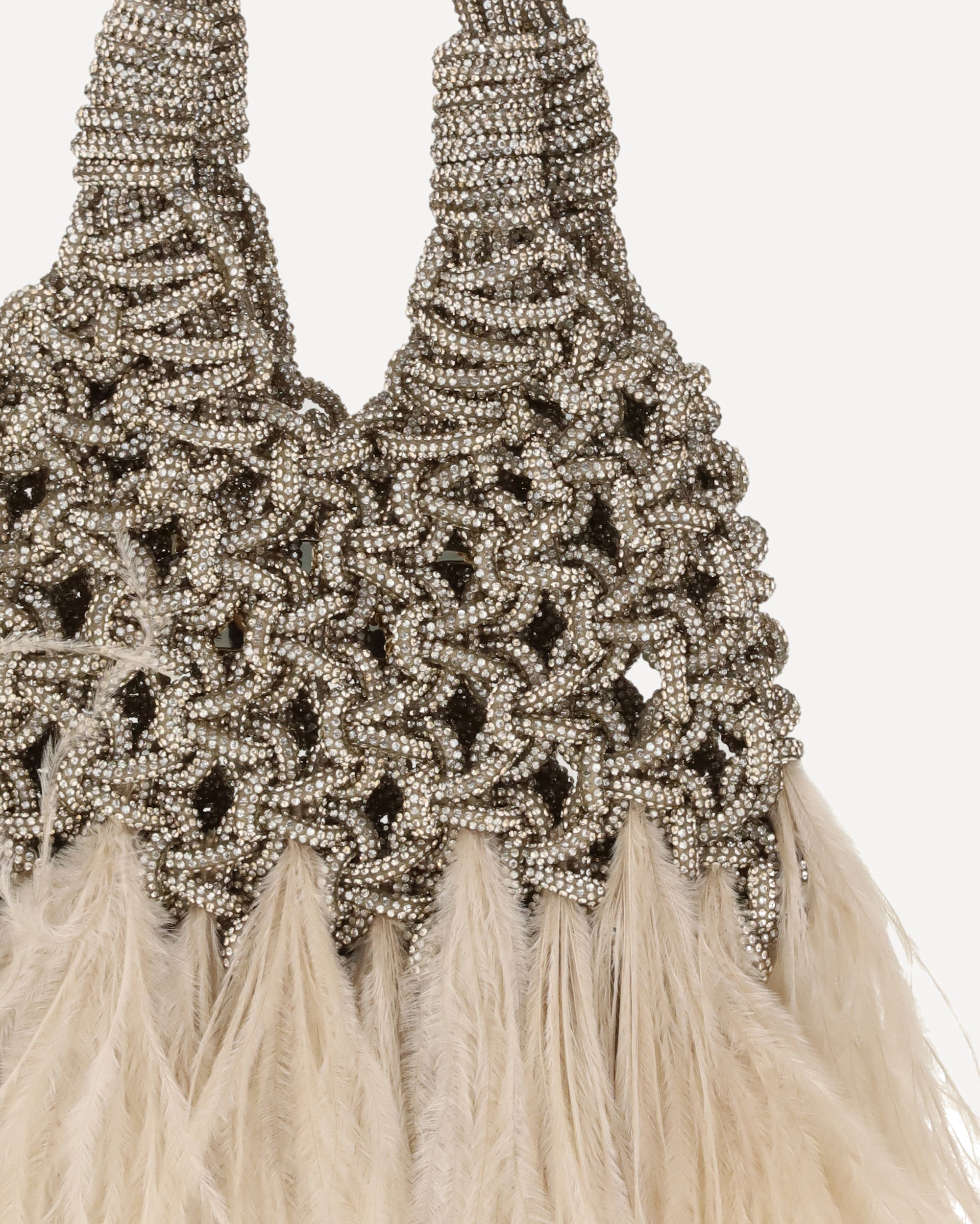 The Vannifique Plumes small Handbag is a refined accessory that combines modernity and elegance, perfect for day and evening. Made with a braiding technique, it is illuminated by a yarn enriched with precious crystals and embellished with ton-sur-ton ostrich feathers that give the silhouette a unique and sophisticated touch.