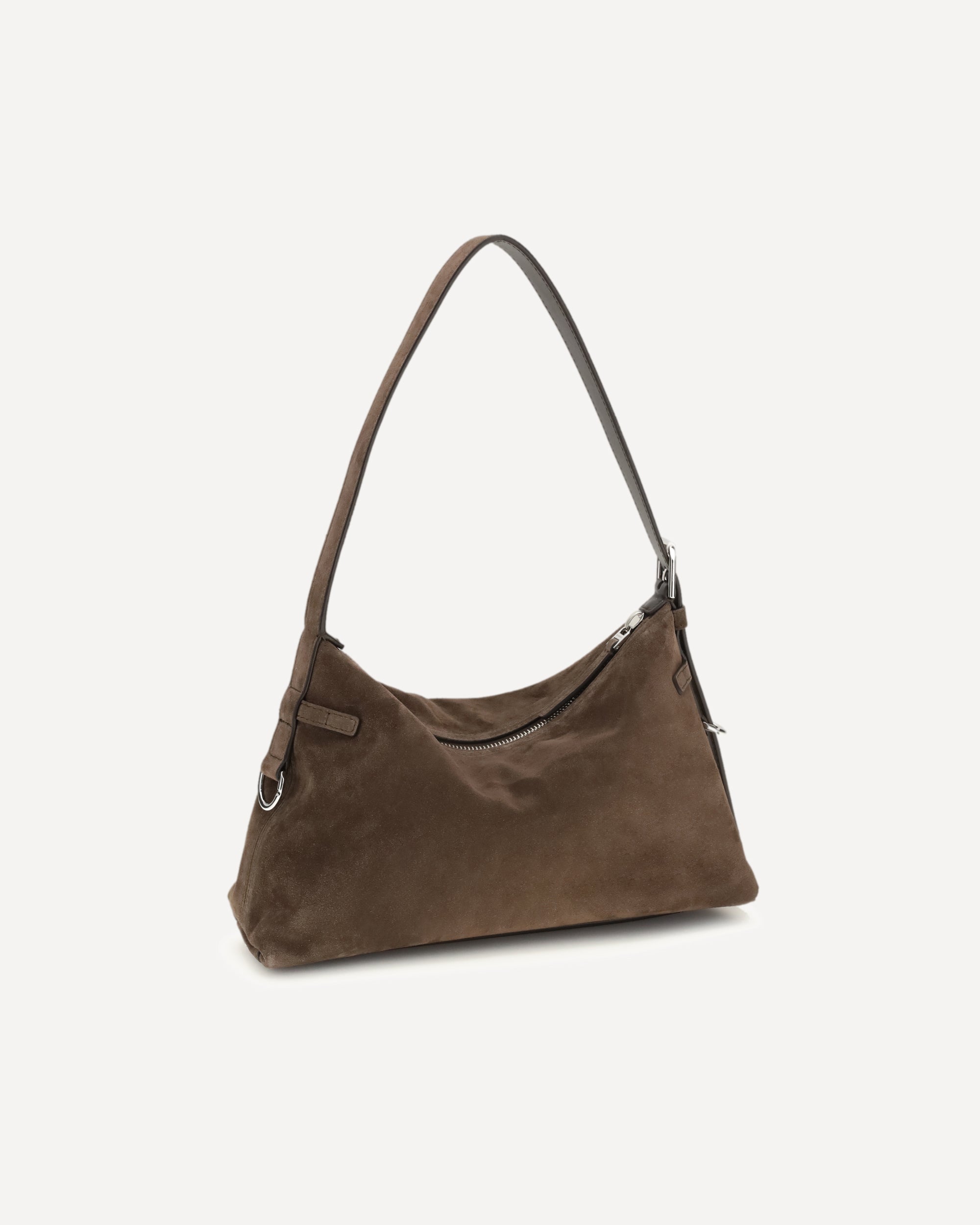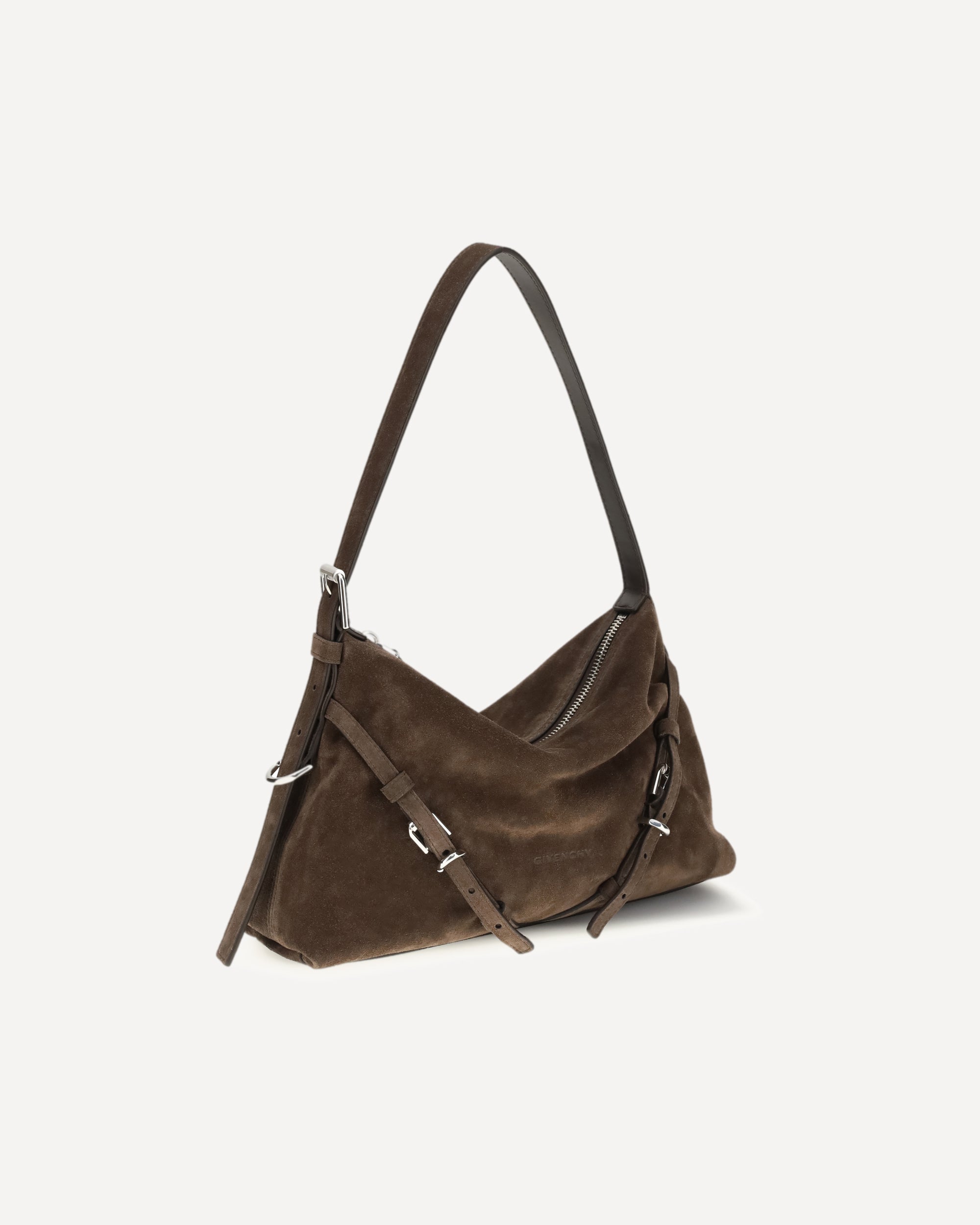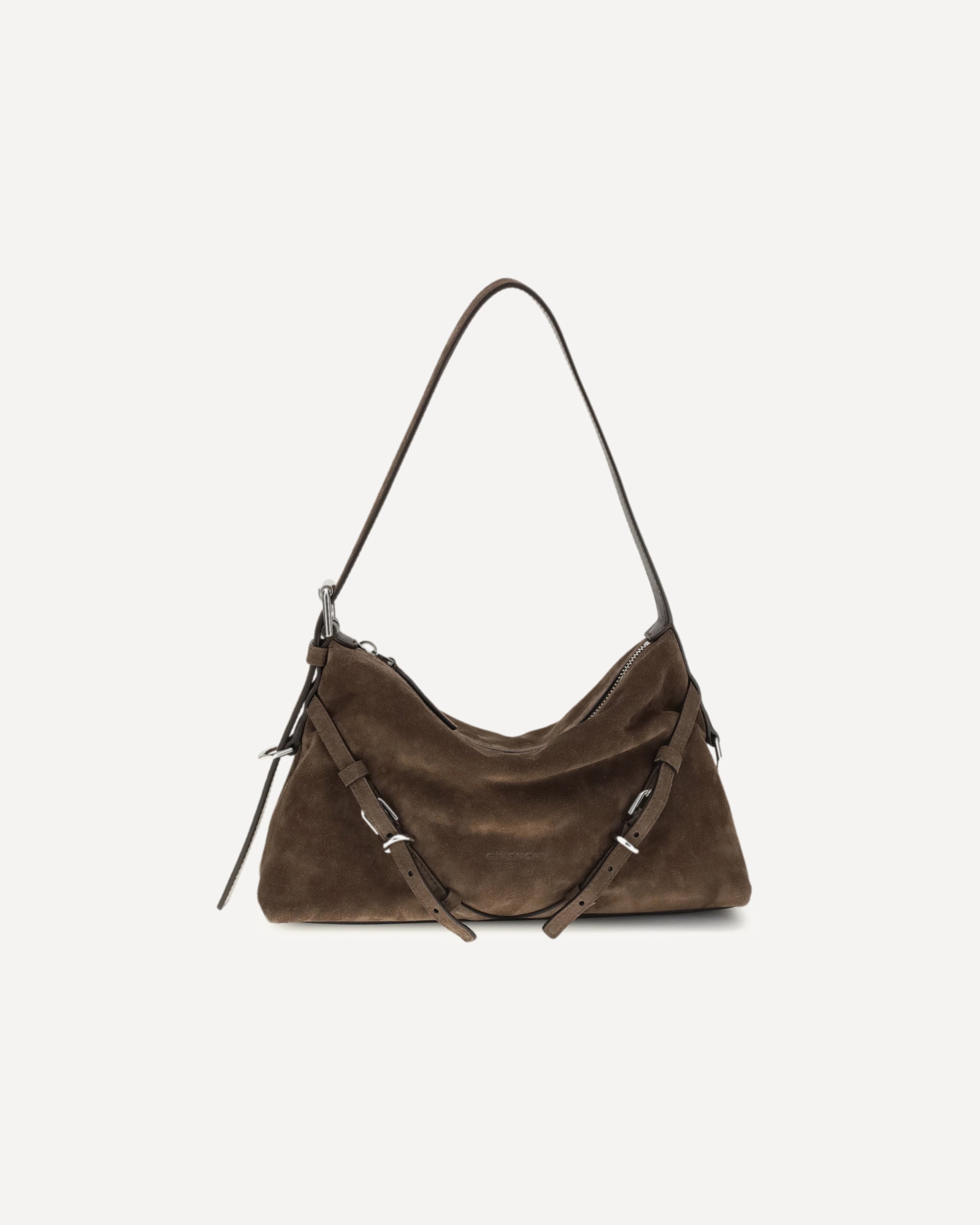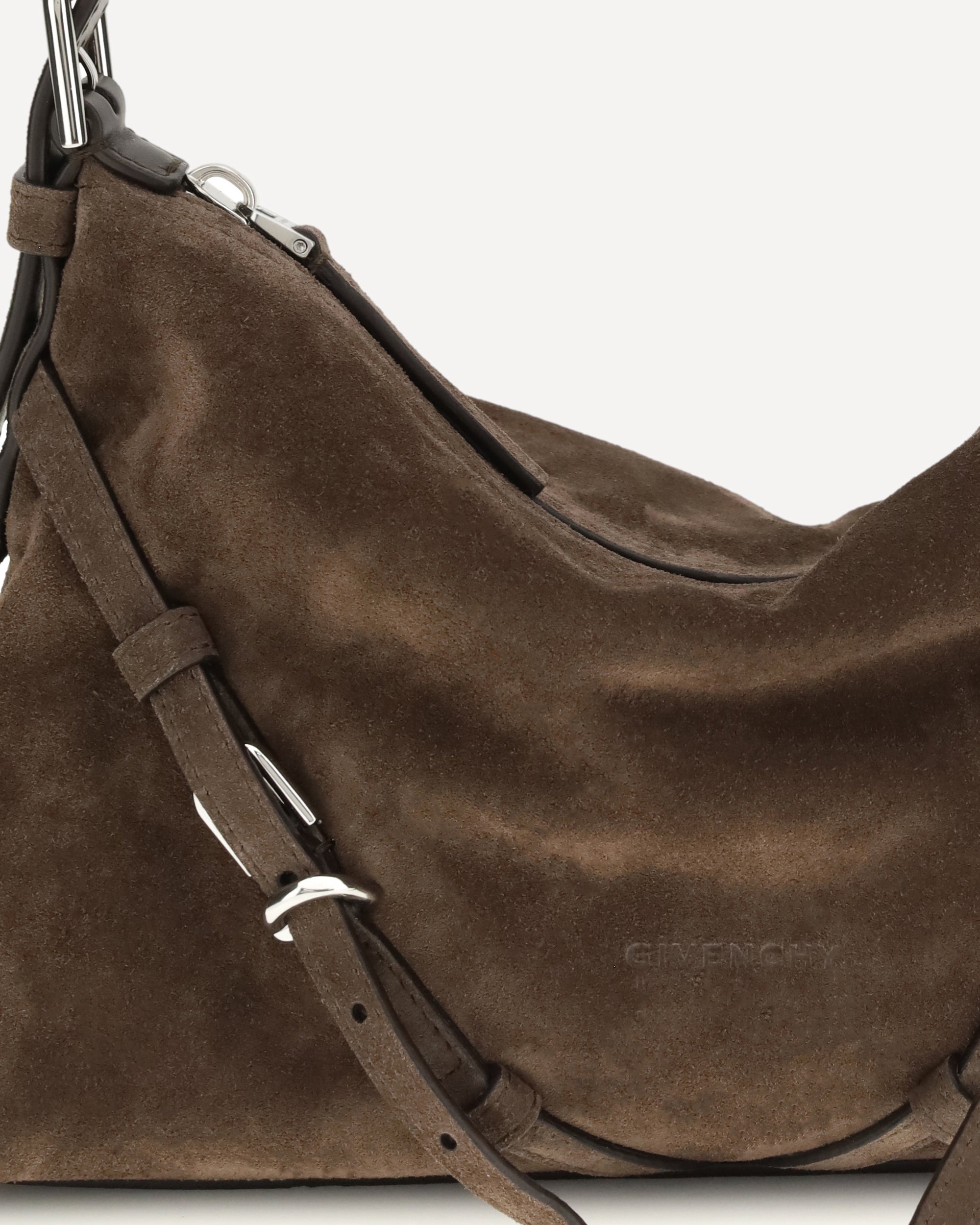 The Voyou Mini Shoulder Bag by Givenchy is a compact and sophisticated accessory made of suede leather. Featuring a zippered closure, it features an adjustable strap for comfortable shoulder wear. The brand's embossed signature decorates the front, while the interior is embellished with the GIVENCHY Paris applique. Brand-engraved metal buckles and gold-tone metallic details complete the design. The main compartment offers essential space for everyday essentials.