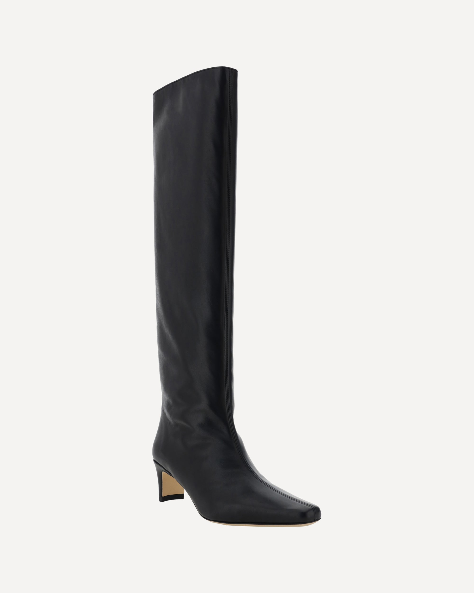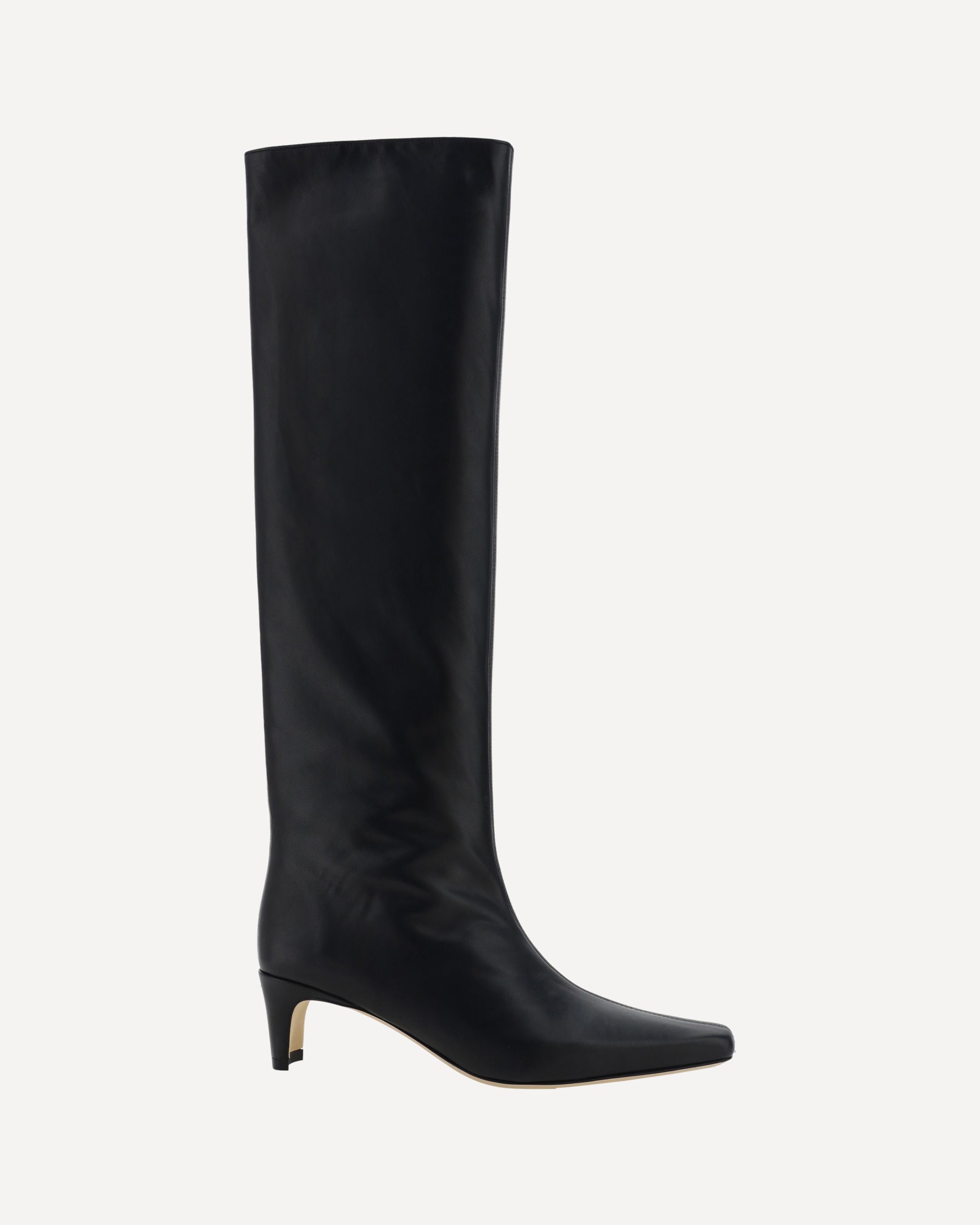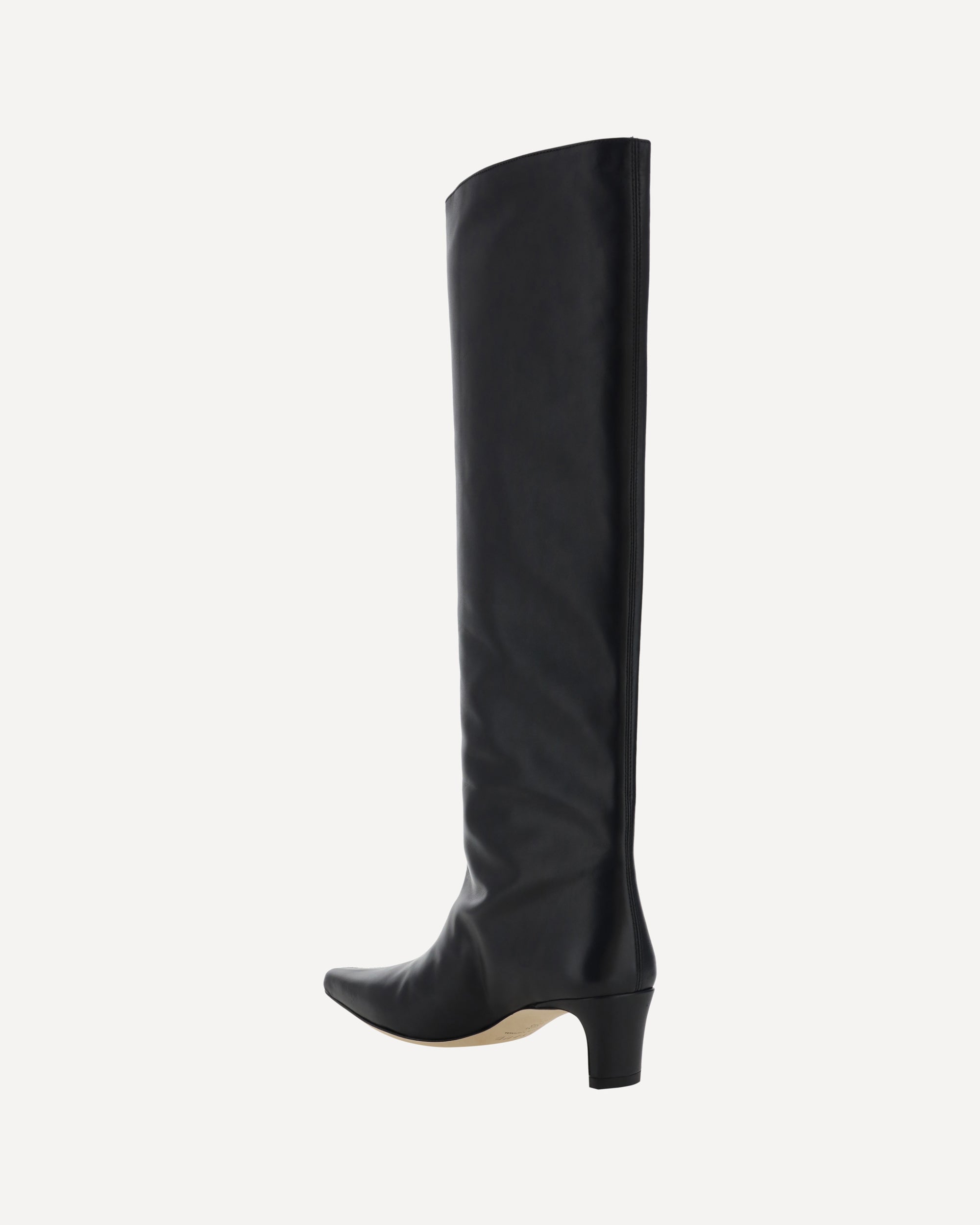 Leather Wally Boots by Staud, slip-on style, extended toe, geometric heel, contrasting logo insole.