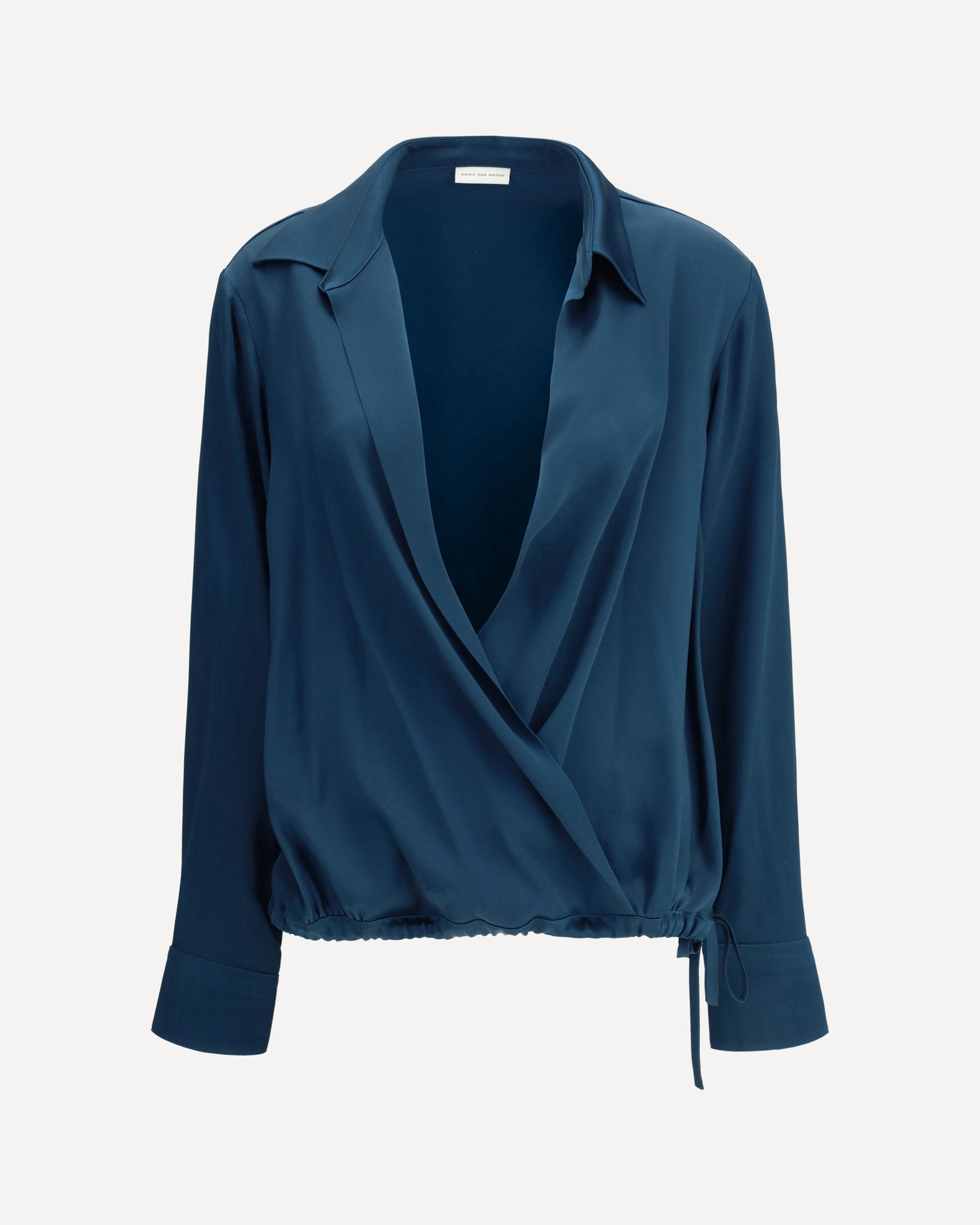 Dries Van Noten's satin Blouse expresses elegance and lightness through flowing, refined lines. Featuring a classic collar, it features a wrap front closure with adjustable ribbon that enhances the silhouette. The deep front neckline adds a feminine and sophisticated touch, perfect for completing both daytime and evening looks.