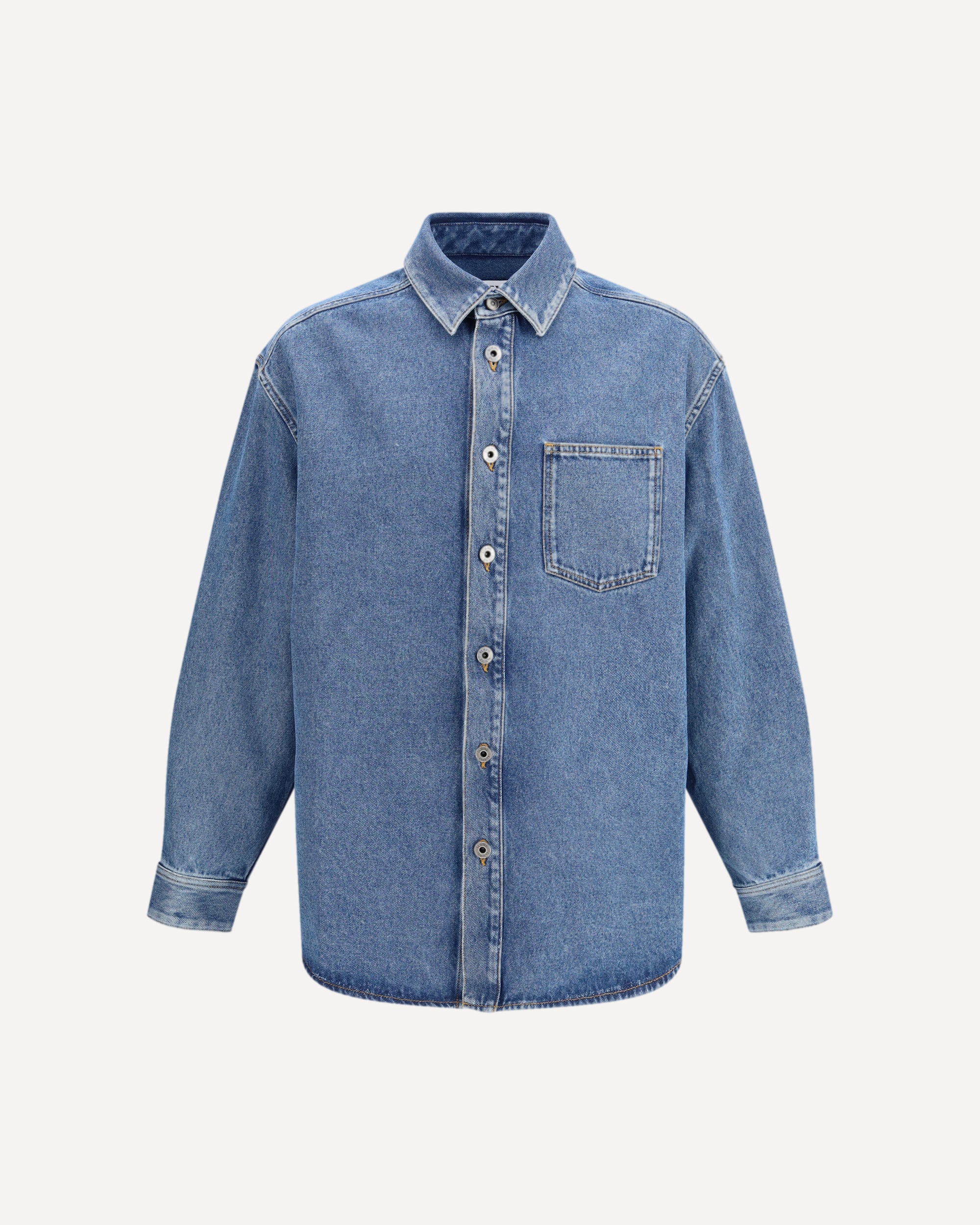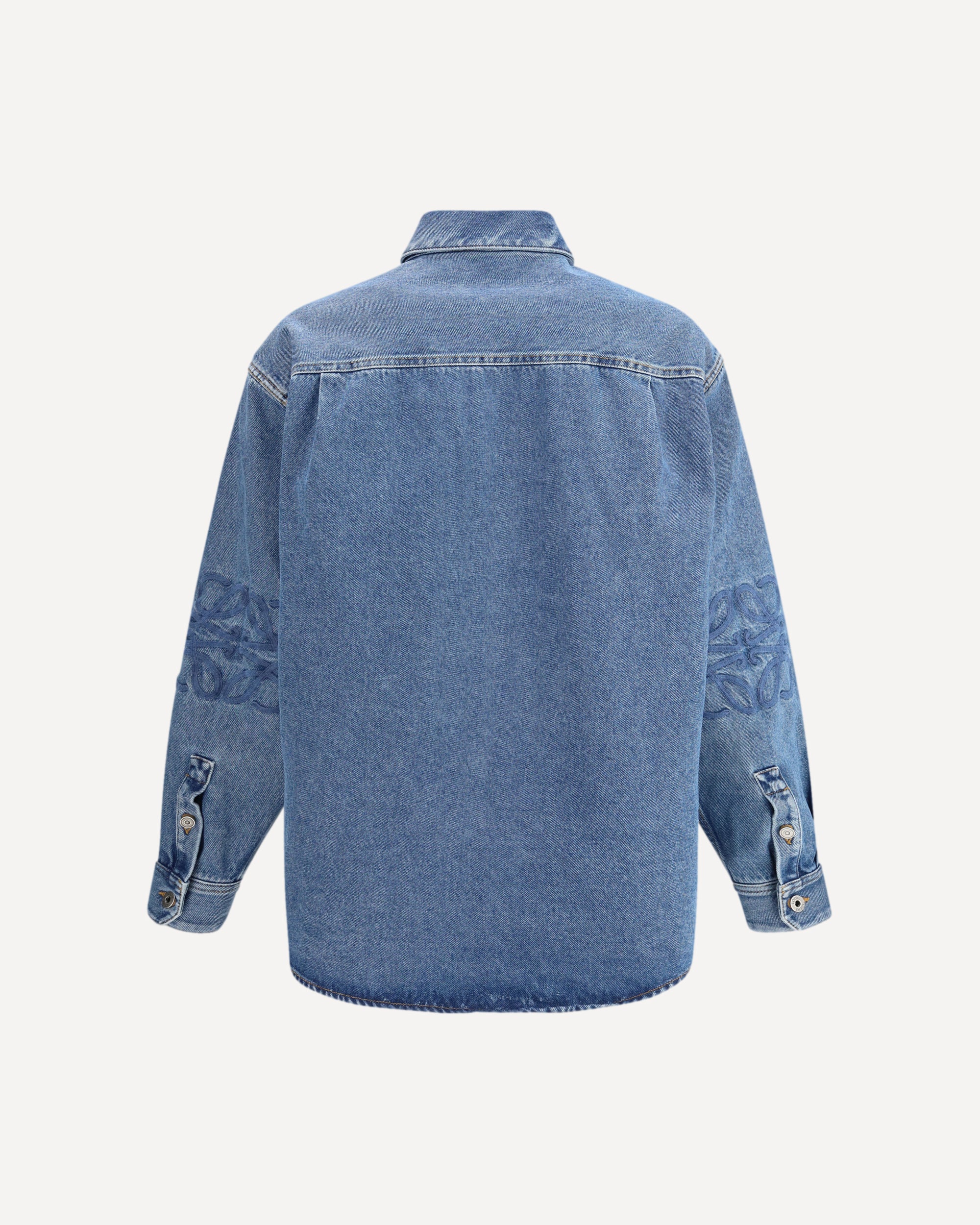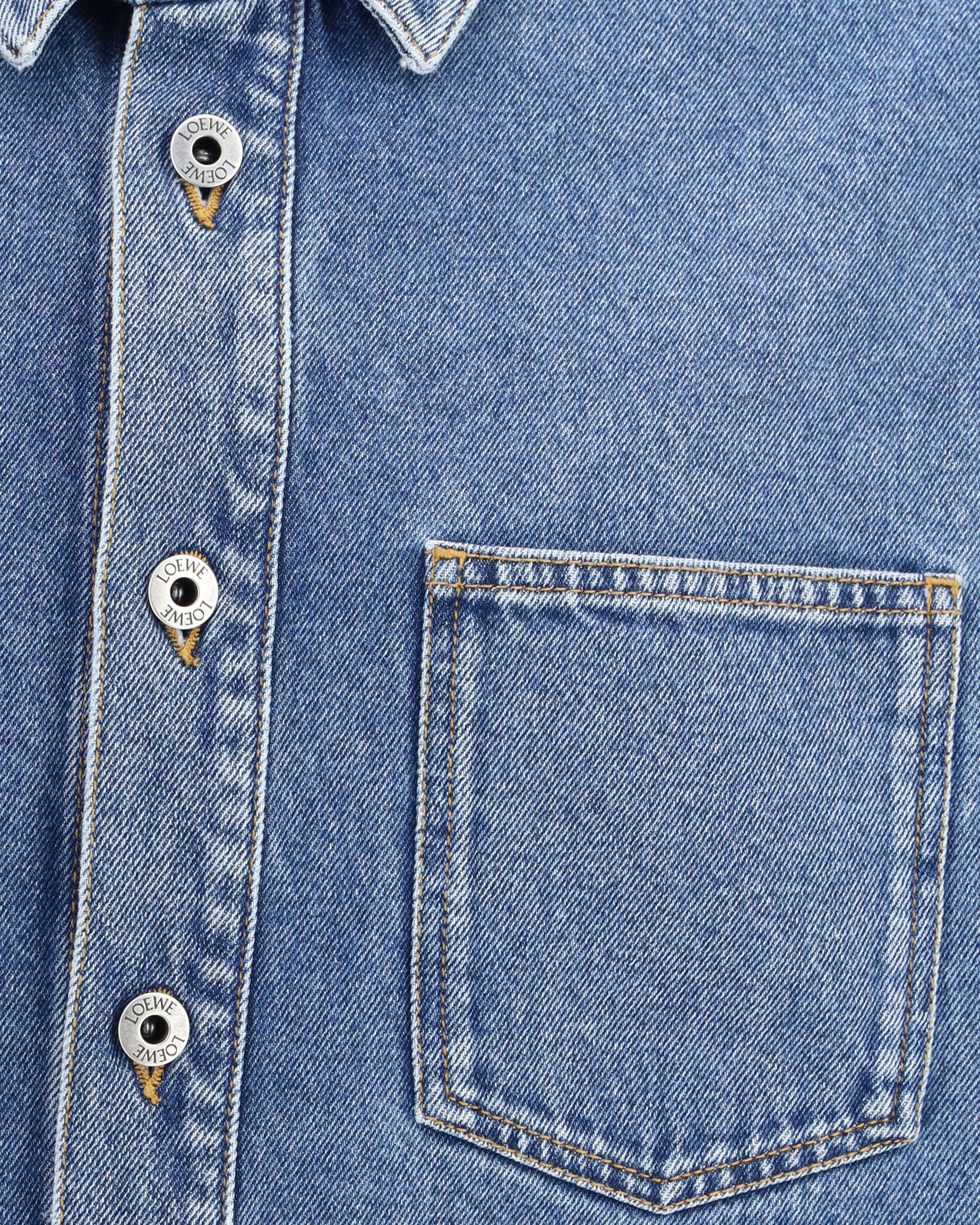 The Shirt-jacket by Loewe is crafted from medium-weight cotton denim and features a relaxed fit with a standard length, designed for an elevated yet effortless everyday wear. The classic collar and button-front closure shape its clean look, while the buttoned cuffs add definition. On the elbows, the Anagram embroidery introduces an iconic, artisanal touch that instantly distinguishes the piece.