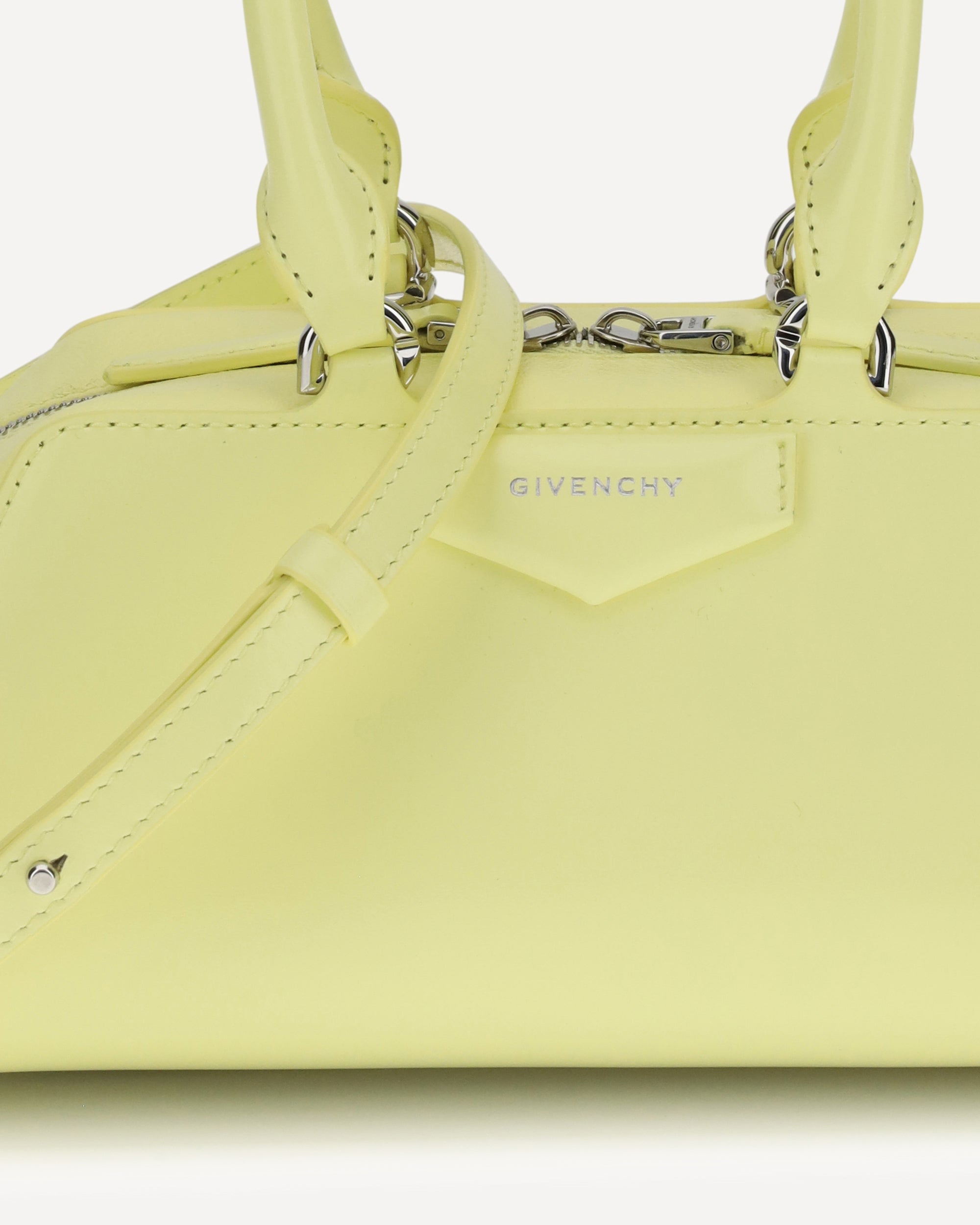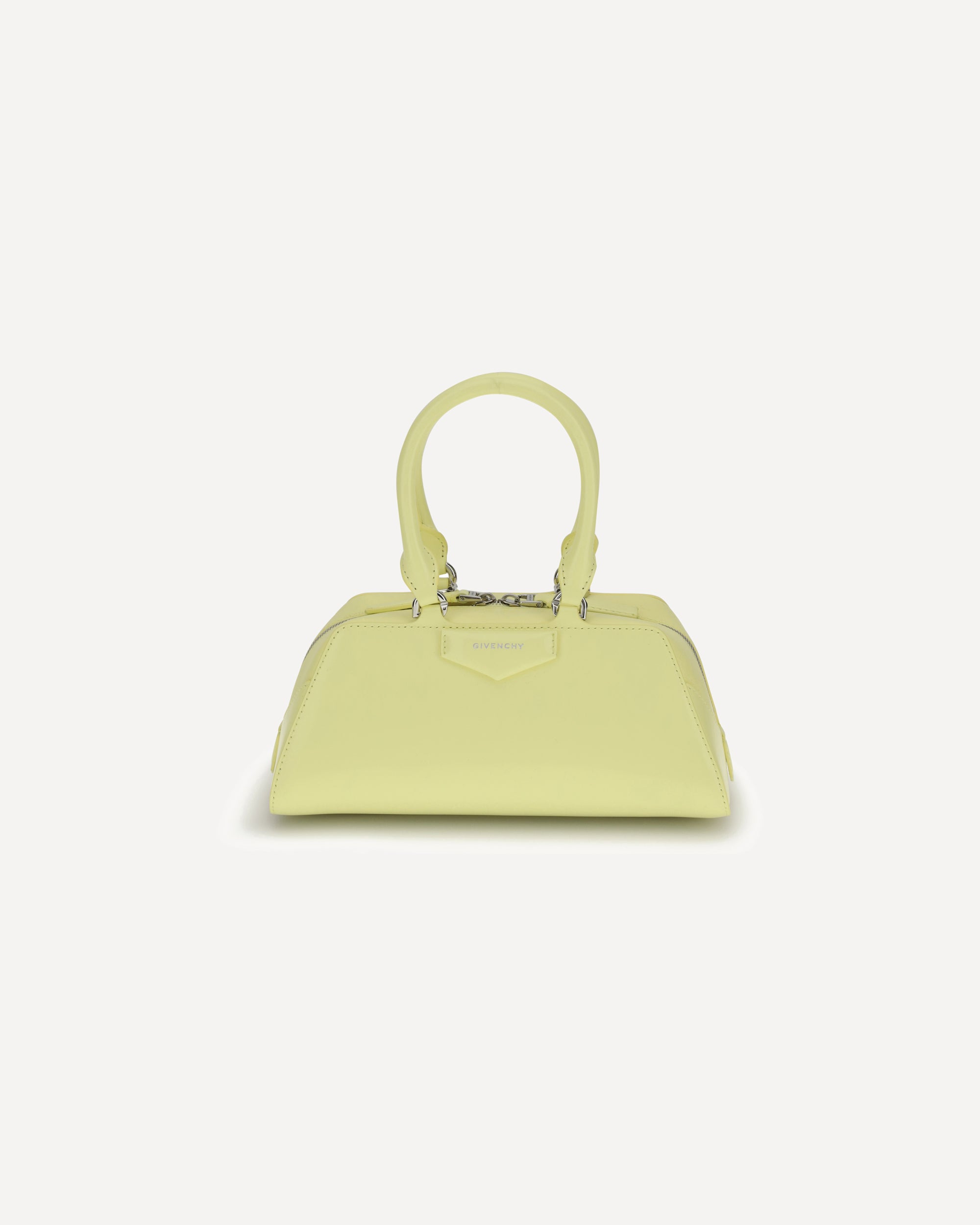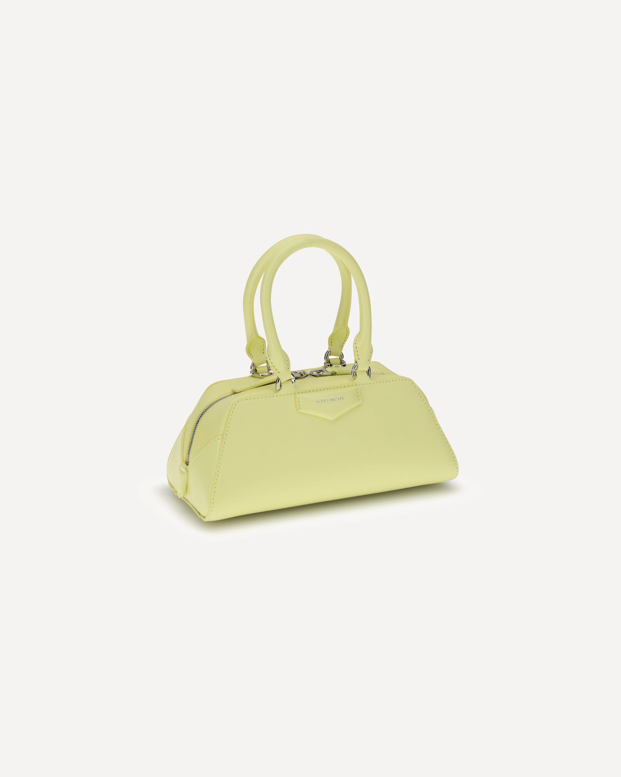 The Antigona East-West Mini Handbag by Givenchy stands out for its elegant and structured design, with an elongated silhouette and a gusseted construction inspired by origami. Crafted with articulated leather handles and featuring four D-rings for the attachment of the adjustable and removable shoulder strap, it offers versatility and refinement. The embossed GIVENCHY signature on a pentagonal patch adorns the front, while silver-finish metal hardware completes the look. The main compartment with zipper closure ensures practicality and organization.