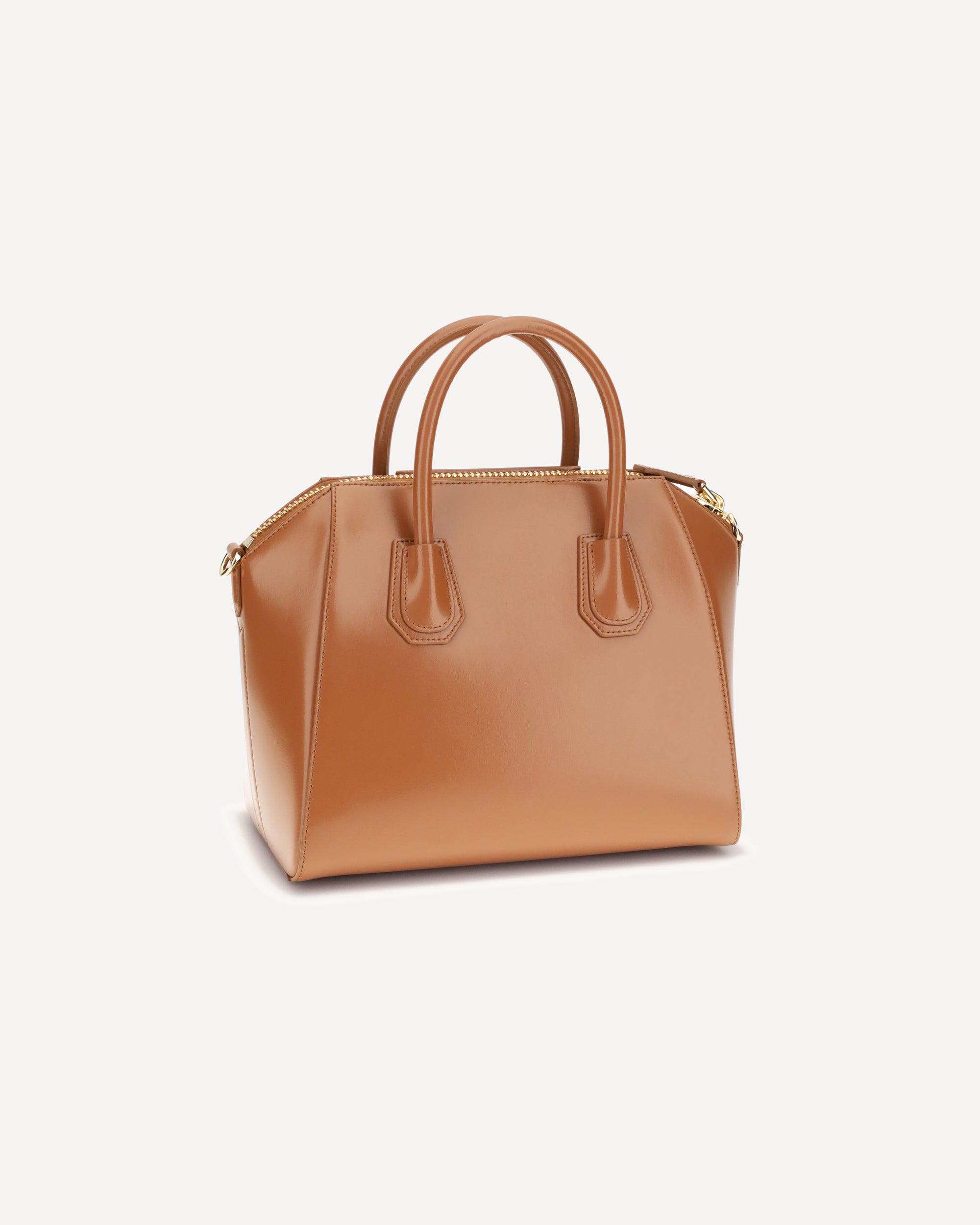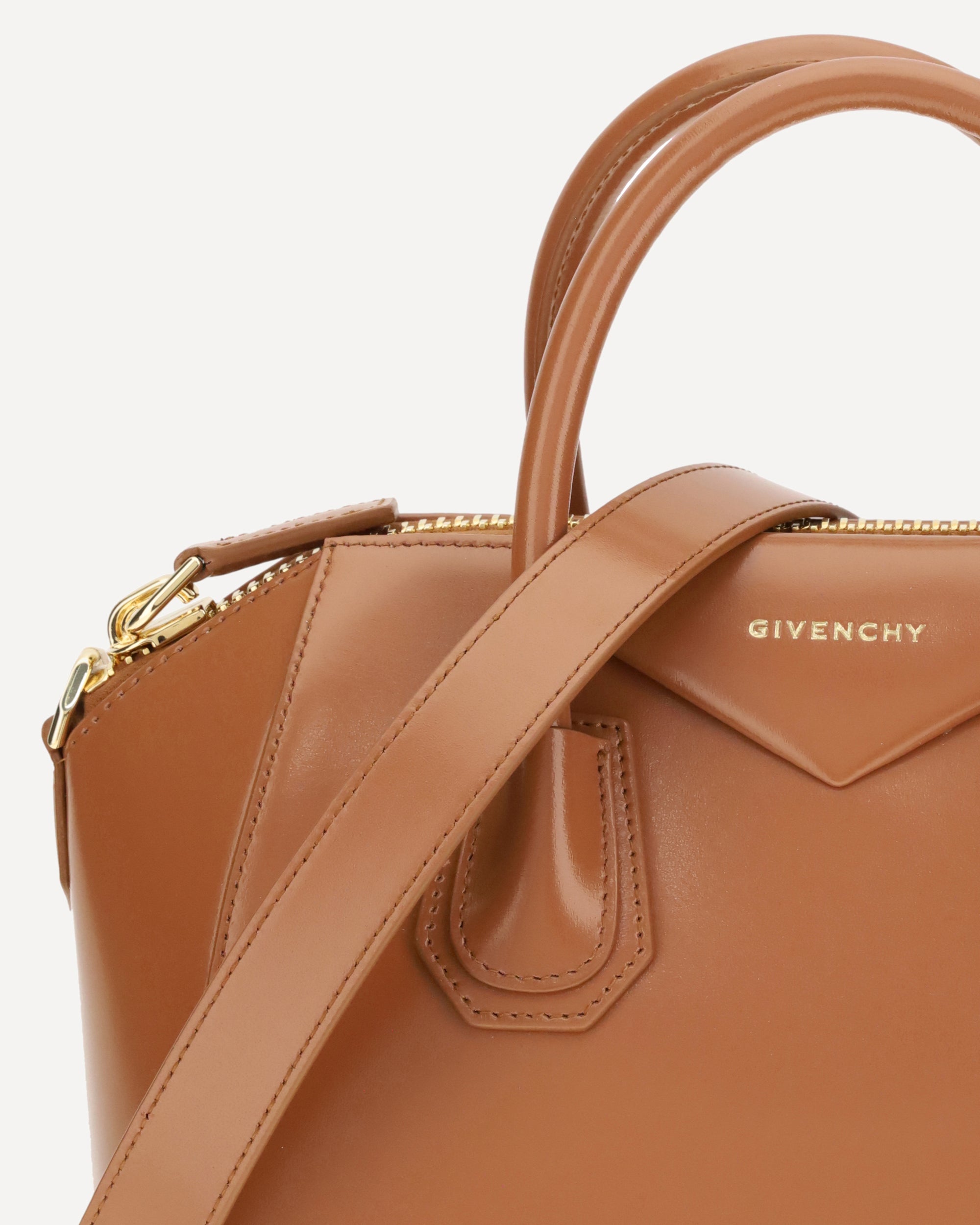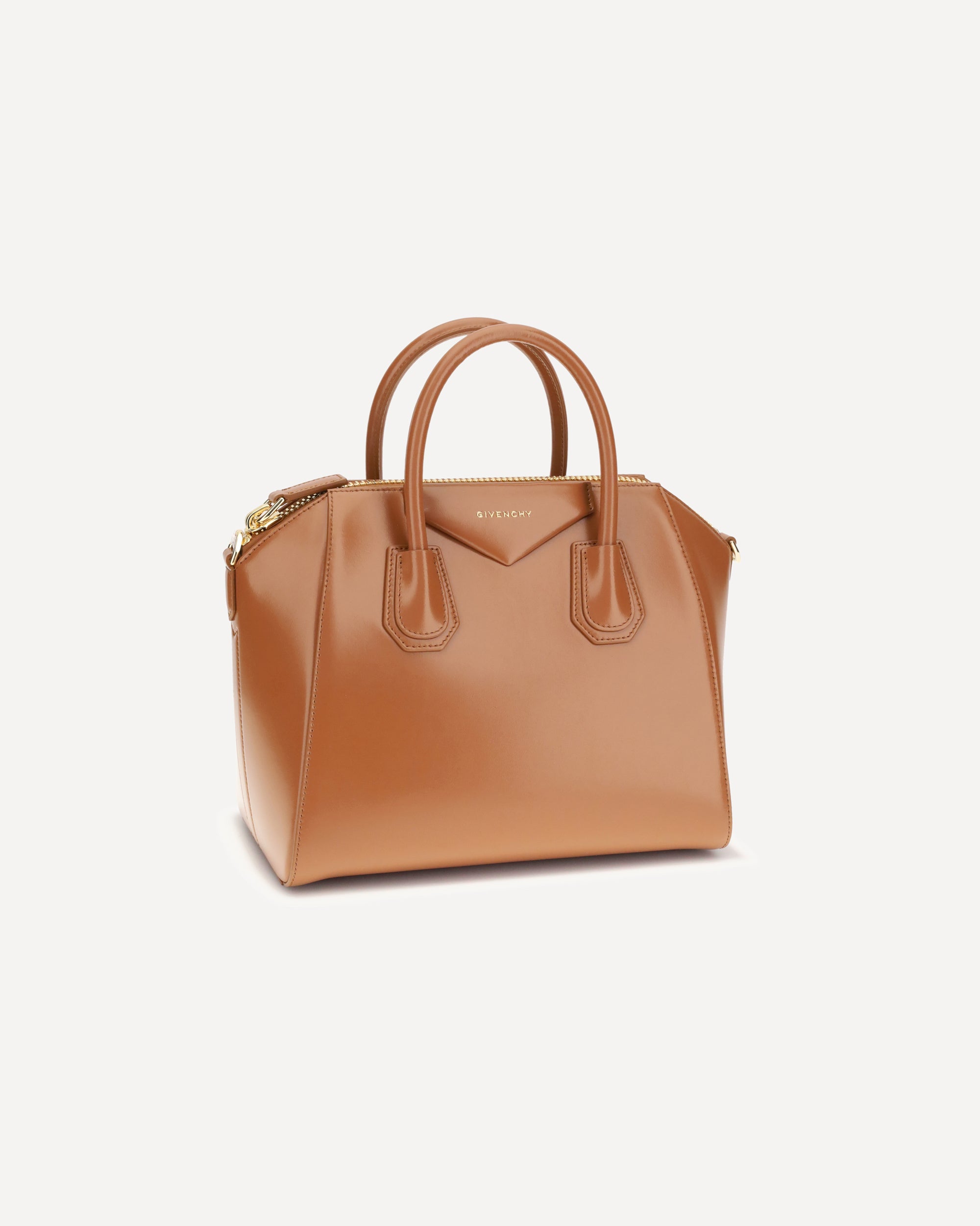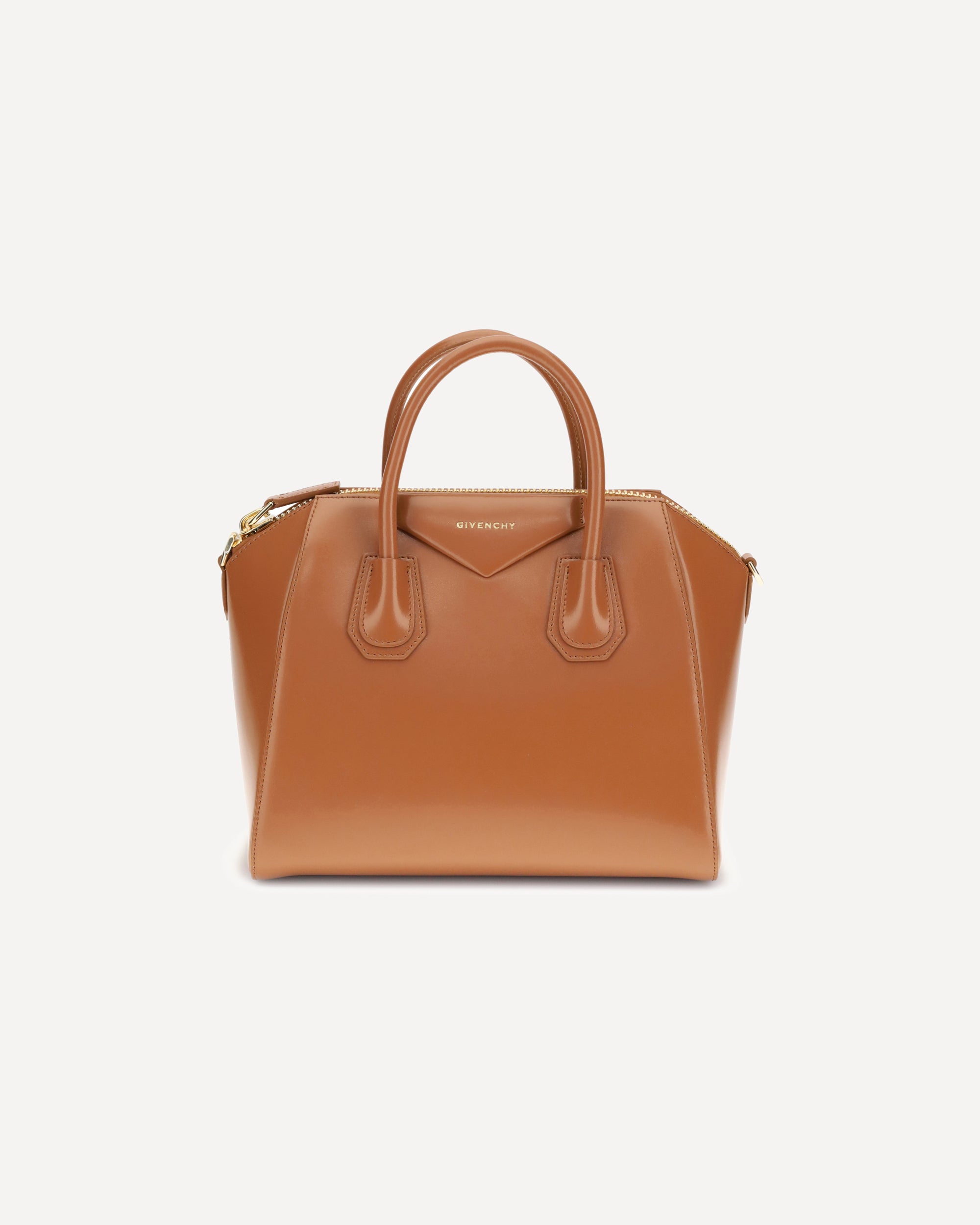 Givenchy's small Antigona Handbag is made of calfskin leather with a glossy finish and features a laminated logo printed on the front. Featuring two round handles and a removable tonal leather shoulder strap, it has a zipper closure and a lined interior with a zipper pocket and patch pocket, combining elegance and functionality.