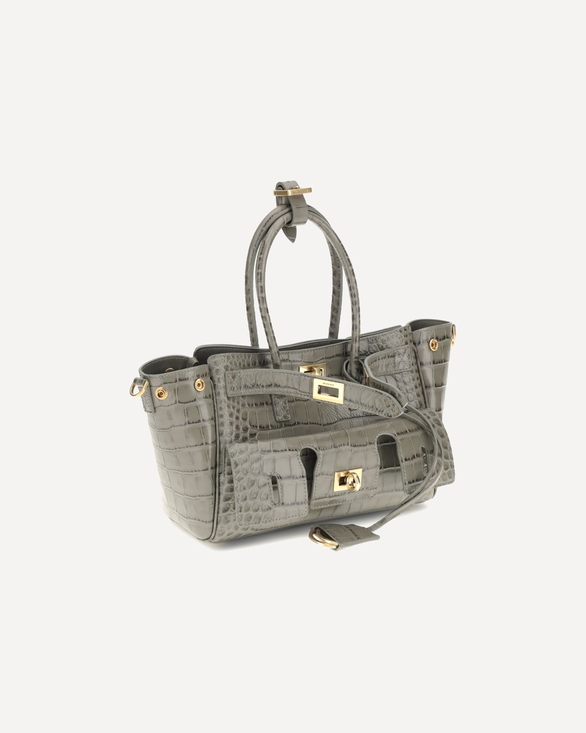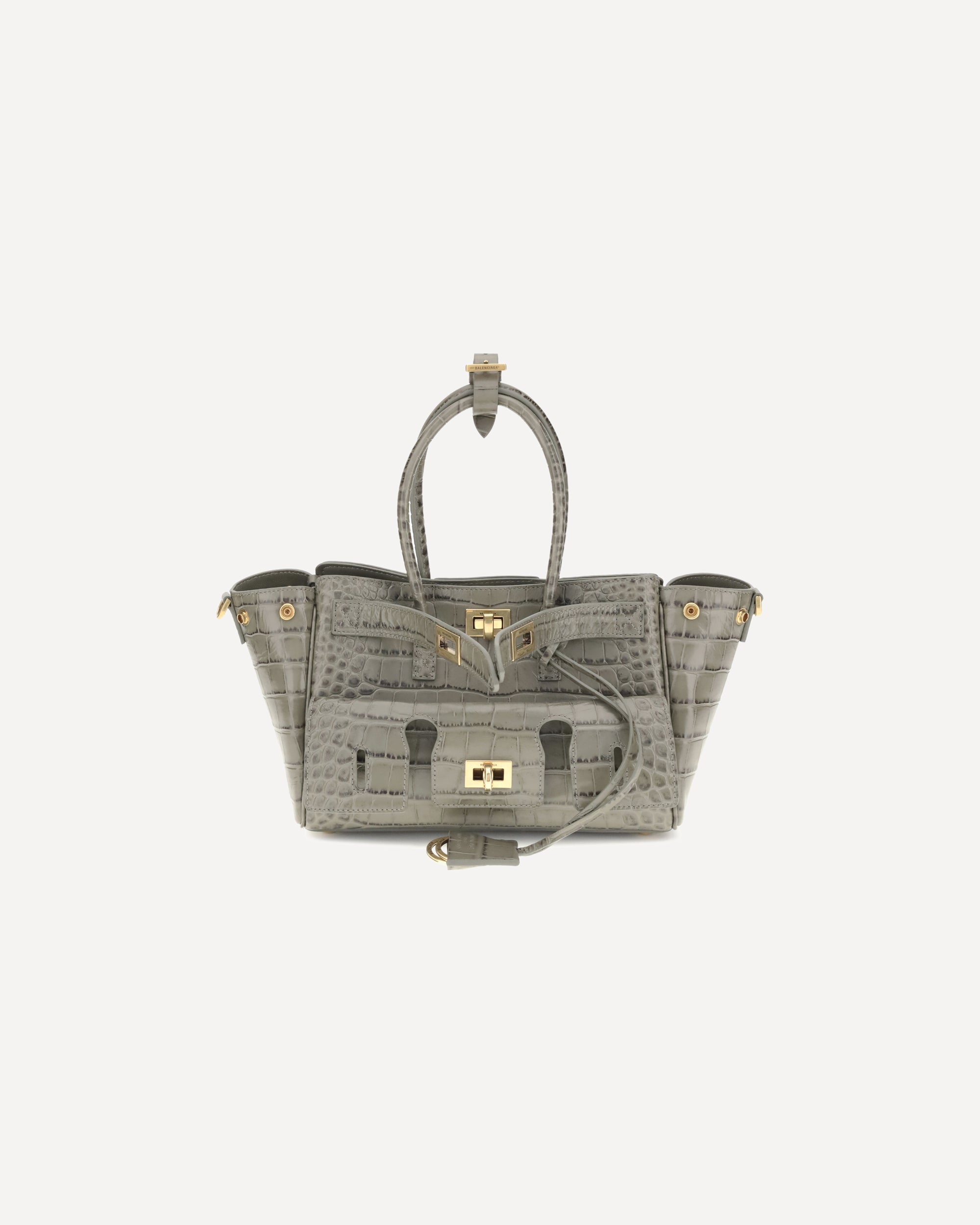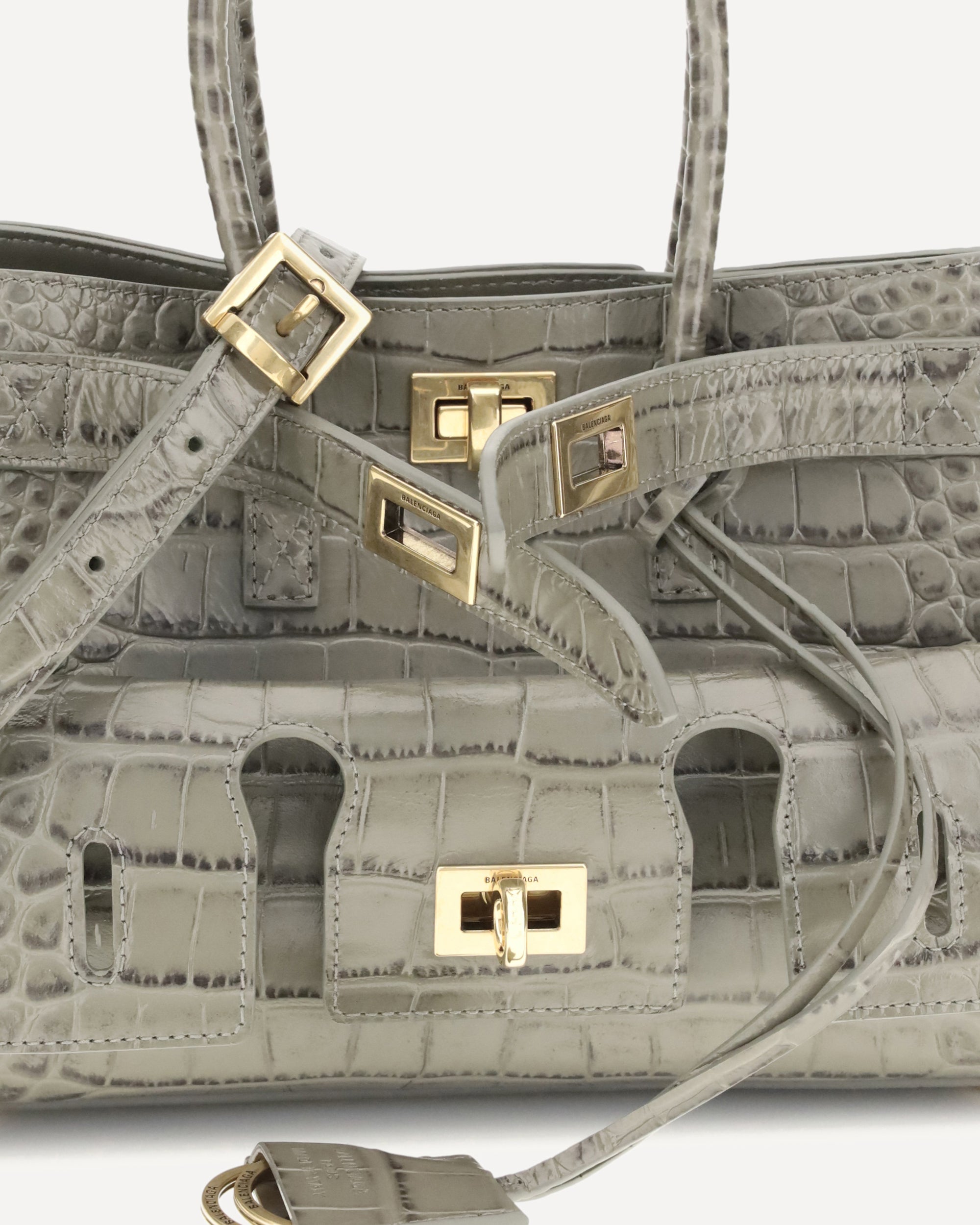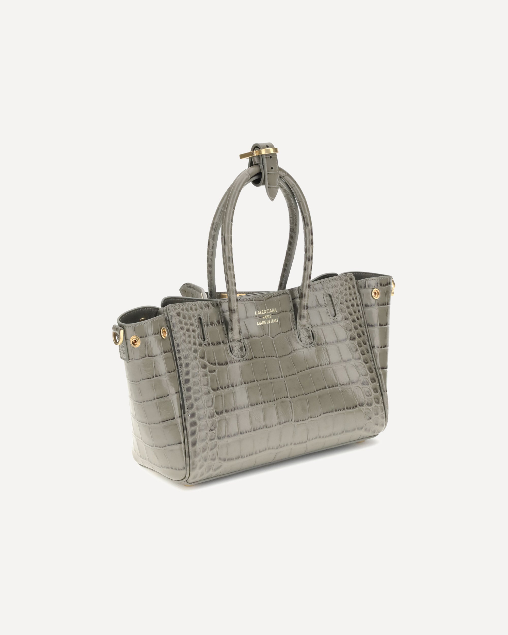 Bel Air mini Shoulder Bag by Balenciaga, is made of calfskin leather with crocodile processing, combining sophistication and iconic design. The carry-all model features two handles joined by a clip and an adjustable, removable shoulder strap, so it can be carried on the shoulder, over the shoulder or by hand. The back features the embossed Balenciaga Paris logo with lamination, while the removable key ring with double spiral loop adds practicality. Antiqued gold hardware, snap buttons on the sides, and an engraved logo swivel closure complete the look. The bag offers a large front pocket, main compartment and two interior zippered pockets for functional organization.