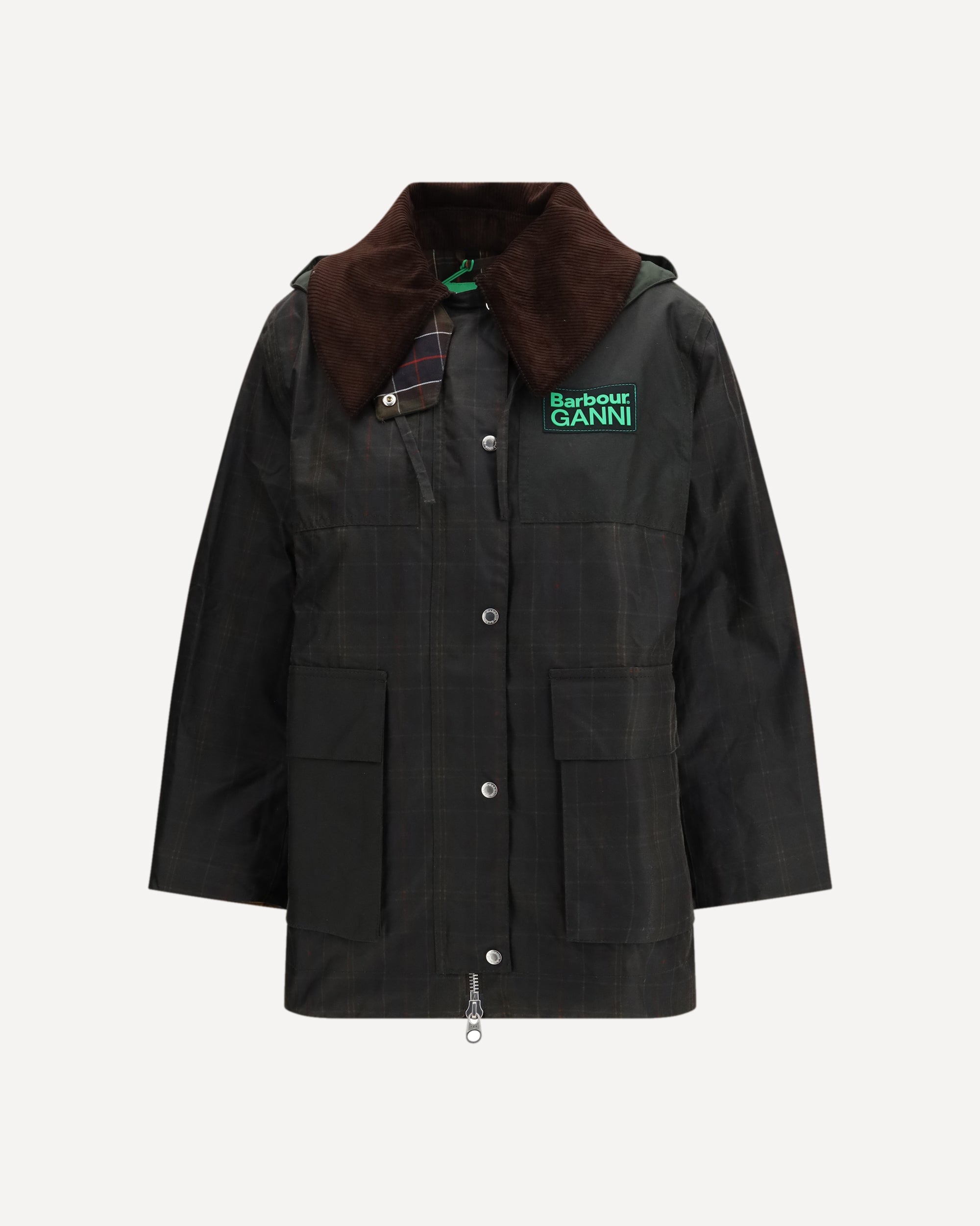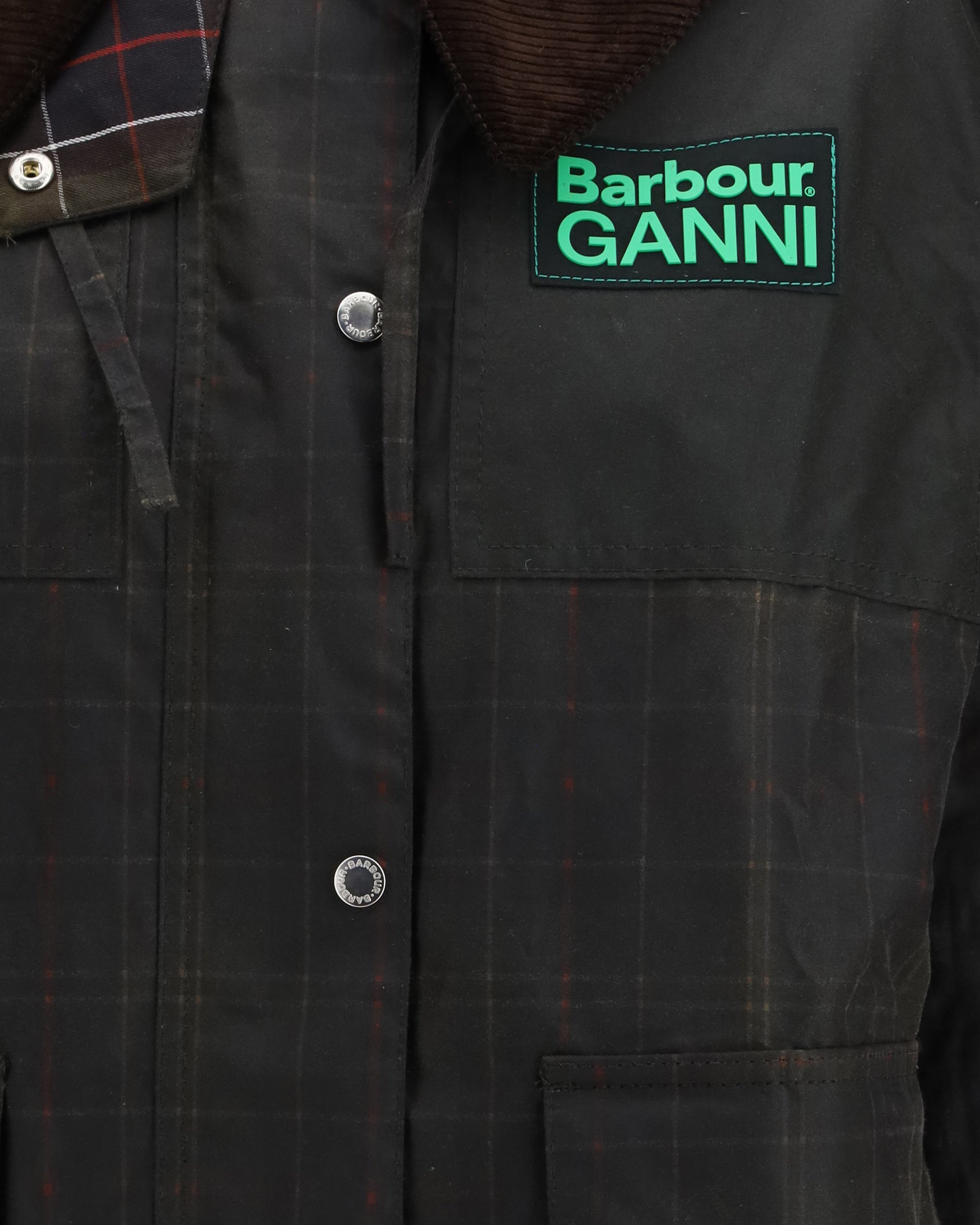 The Tartan Waxed Duffle Coat by Barbour x GANNI introduces a new silhouette to the collaboration, designed for colder seasons. Crafted from Barbour’s signature waxed cotton, it features tonal elbow patches and a tartan lining throughout the body and hood. The design is elevated with GANNI’s signature oversized collar finished with Barbour corduroy, and completed with a co-branded silicone patch on the chest. A timeless coat blending Barbour’s British heritage with GANNI’s contemporary Scandi aesthetic.