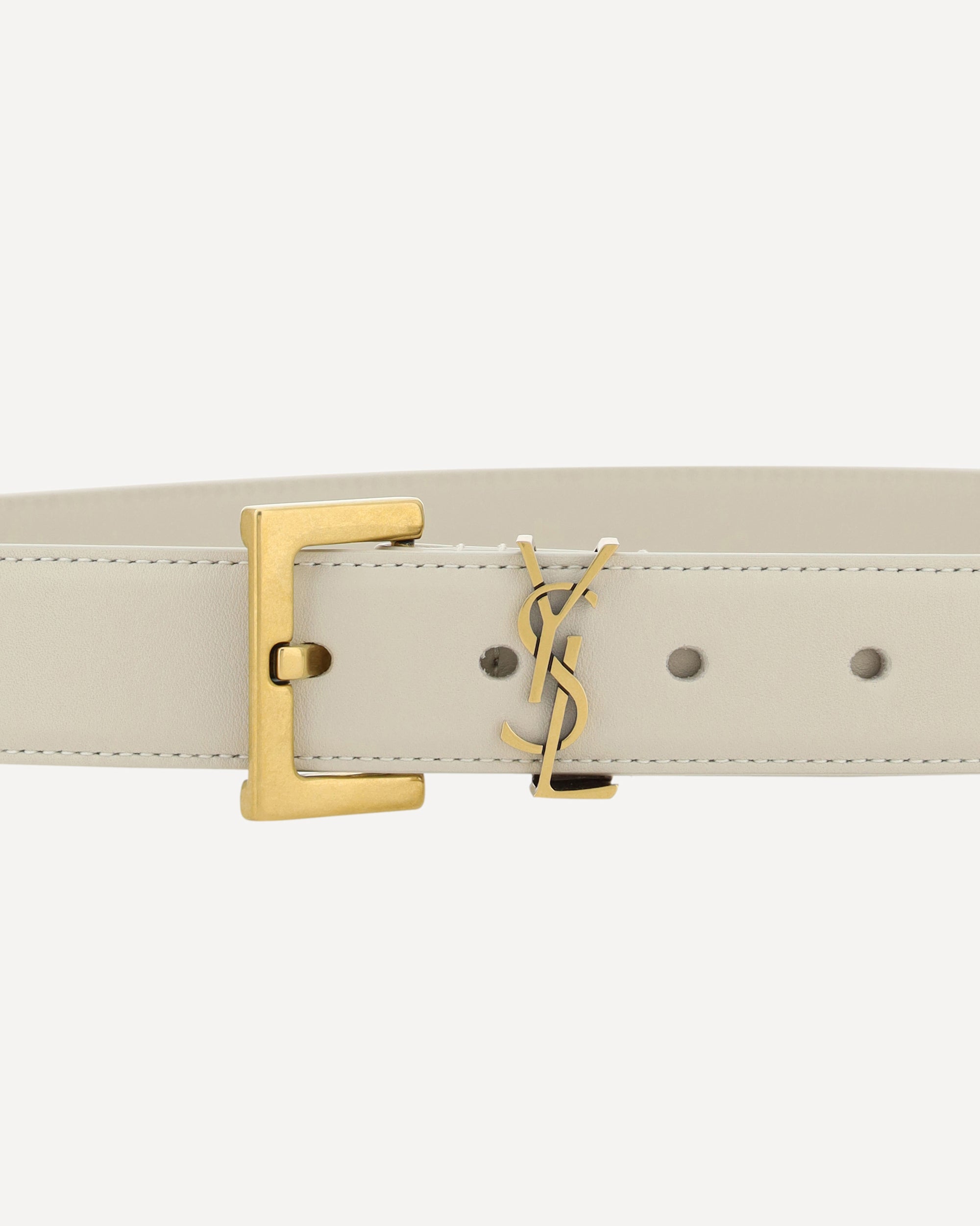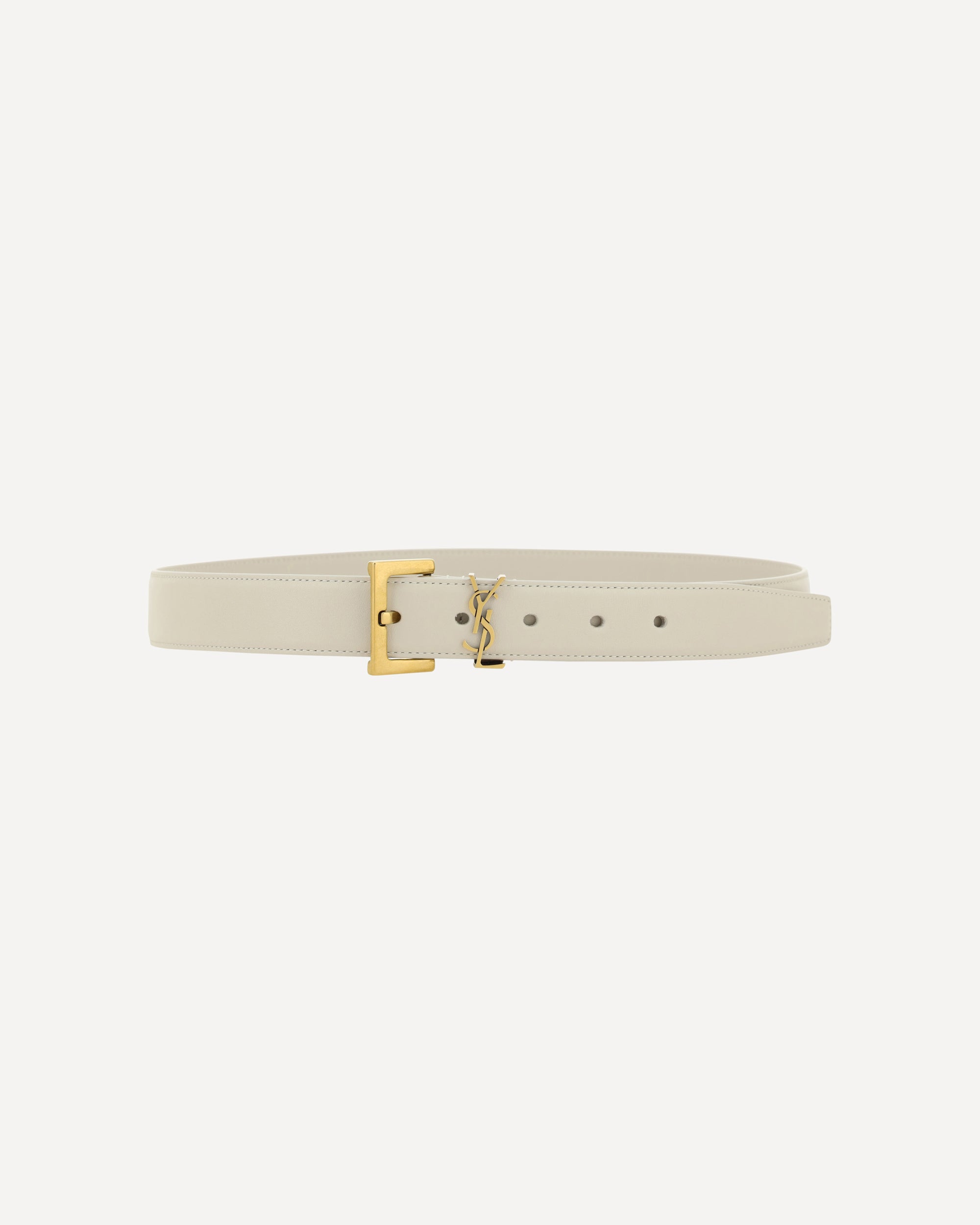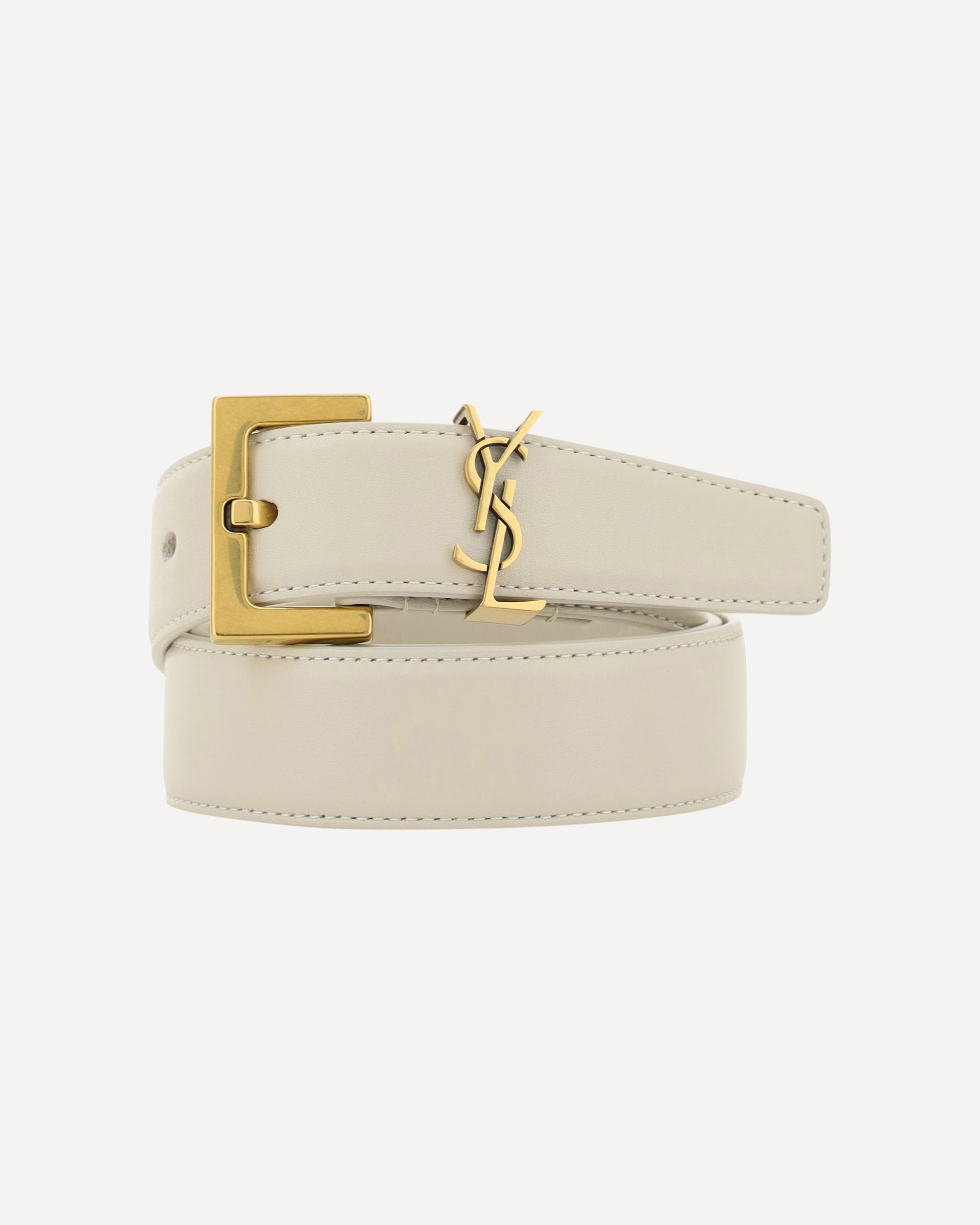 The Saint Laurent leather Belt is a sophisticated accessory with an essential and refined design. Made of smooth leather, it features a front plaque with the brand's iconic brass-plated logo, adding a touch of character to the look. With a thickness of 2.5 cm, it is perfect for elegantly complementing both formal and casual outfits.